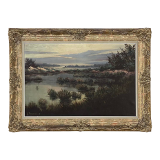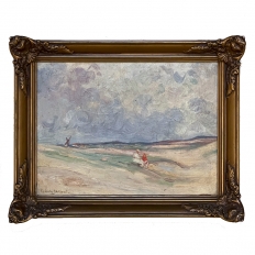 Antique Framed Oil Painting on Canvas by Dieudonne Jacobs (1887-1967) is a great example of the artist's preference to capture scenes in early morning or late afternoon lighting.  Jacobs has beautifully rendered the evening coloration in various shades of blue, gray and a subtle violet, with a splash of greenery in the immediate foreground.  The bold...