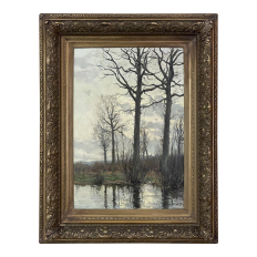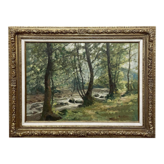 Antique Framed Oil Painting on Canvas by Jean Matthieu Jamsin (1882-1965) is a classic example of the pastoral work wherein the artist has been captivated by a particularly beautiful woodland scene alongside a rock-strewn creek.  The naturalistic forms that the trees depict act like markers along the creek, and the artist has chosen to concentrate on the...