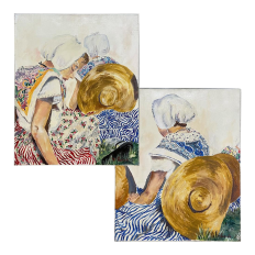 Pair Oil Paintings on Canvas by Di Pasquale are interesting studies of two young maidens in colorful attire enjoying the summer weather.  The artist has taken great pains to represent the intricate prints of the fabric, and has depicted both figures wearing cotton bonnets.  A fascinating study, the pair are perfect for adding a splash of interesting color...