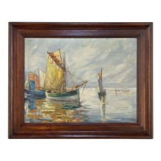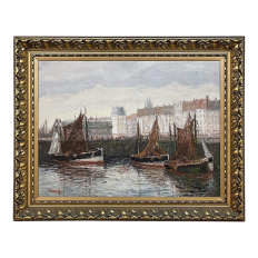 Antique Framed Oil Painting on Canvas by Rene Clarot (1882-1972) is a charming retrospective view of a fisherman's dock in a quaint Belgian harbor town set in the late 19th century.  Nets are seen drying on the dock, as the fishermen discuss the day's catch.  Sails are slack, being allowed to fully dry before tomorrow's excursions.  Note the boats are...