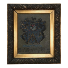 19th Century Framed Painting of Family Crests was hand-painted in the late 19th century and framed in the 20th century.  The artist used mixed media of ink and water colors to create the beautiful jewel tones of the work.  The Latin inscription below translates to: "Bravely and Honorably Stand Fast Together Forever".  The crests indicate two families...