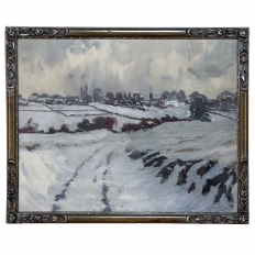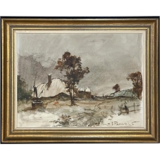 Antique Framed Gouache Painting by A. Jeseanne depicts a wintry scene on the outskirts of a quaint rural village.  The road leading into the settlement is just apparent by the ruts in the immediate foreground, with what looks like snow falling on the dwellings in the distance.  Outlines of hedgerows indicate fallow fields waiting for the spring thaw. ...