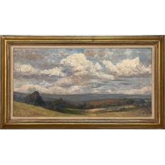 Oil Painting on Canvas by Xavier Wurth (1869-1933) is a splendid panoramic landscape by the artist who was beloved in his native region of Liege.  This particular composition shows distinctive layering of the sky over the misty mountains with the valley and river below, inviting the viewer into the scene.Wurth excelled in all areas: portraits, seascapes,...
