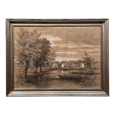 19th Century Framed Pastel by Francois Stroobant (1819-1916) is a remarkably well preserved work, thanks to the careful handling over the past century, and the relatively recent reframing with glass.  A silvered frame was chosen to accentuate the sepia tones of the work, which depicts a quaint rural scene with a pond acting as an invitation into the...