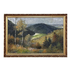 Antique Framed Oil Painting on Canvas by Jan Van Genesen (1887-1945) depicts a scene found throughout Europe's countryside, with a rutted dirt road winding through a forest with occasional clearings for homesteads and small farms.  Van Genesen has chosen early fall for his composition, when colors are just emerging in preparation for winter.  The...
