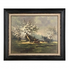 Vintage Framed Oil Painting on Canvas by E. Van Orden is a splendid Spring time pastoral whose subtle coloration and depiction of the most magical time of the year will bring a breath of fresh air to your decorating scheme!  Painted just when the flowers were in full bloom on the fruit trees in the composition, one also notices the abundant grasses in the...