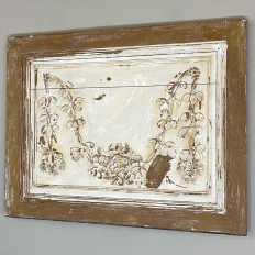 19th Century French Framed, Carved and Painted Panel is a superlative decorative element that was hand-carved by a particularly talented sculptor out of dense, old-growth white oak.  Framed with planks joined with pegged mortise & tenons, the panel depicts a lavish floral swag suspended by small rosettes at each top corner, with a bouquet hanging...
