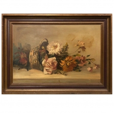 Antique Framed Oil Painting on Canvas by Jan Deckers (1865-1942) is a stunningly realistic depiction of a basket of fresh-picked flowers that seems to have escaped the grasp of the gardener.  The leaves and flower petals were depicted at the canted angle for visual interest, held in a much-used wicker basket.  Note the artist's expert use of background...
