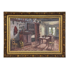 Antique Framed Oil Painting on Canvas by L. VanMeerbeek is an intriguing work with a visual effect that is at once subtle yet defines the impact of the work.  The composition seems to be angular, with the right third of the canvas projecting towards the viewer, with a distinct boundary that represents a background with more relaxed perspective projecting...