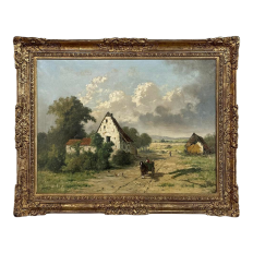 Antique Framed Oil Painting on Canvas showcases the artist's talents with rendering landscape, sky, water, even quaint rural architecture.  Mounted in its original frame.  The iconic scene invites one into the composition via a dirt road the forks at a charming thatch-roofed cottage.  Across the meadow in the background one can see a little village with a...