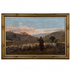 Antique Framed Oil Painting on Canvas by A. Fivet Dated 1923 is a splendid pastoral work that provides a varied palette in a Post-Impressionistic manner for a work that can blend with a wide variety of color schemes in your home.  Although the human interest aspect appears center foreground, the shepherd's presence leads the viewer into the scene guiding...