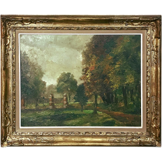 Antique Framed Oil Painting on Canvas by A. Van den Eynde depicts the entrance to an obviously affluent household, judging by the entryway columns.  Exquisite pastoral setting indicates the onset of fall.  It is not clear whether the artist was commissioned to depict this scene by the owners of the property, or that he was simply inspired by the majesty...