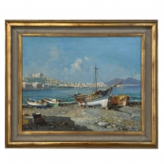 Antique Framed Oil Painting on Canvas by Massimo Salvati depicts a quaint harbor of a seaside village in Italy, all from the fisherman's perspective with the village in the background across the water.  Here Salvati has used a bright sunny day allowing the viewer to see distant mountains beyond the village.  Several vessels also ply the waters in front of...