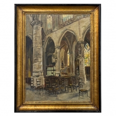 Antique Framed Oil Painting on Canvas signed Rainbo depicts the interior of a cathedral, most likely the most prominent church in the city.  The artist has used a superb sense of perspective to immerse the viewer into the scene.  Note the intricacies of individual chairs as opposed to bench pews, the arched colonnades and massive column supports, and the...