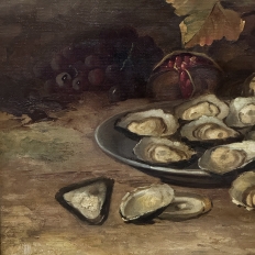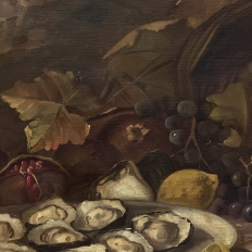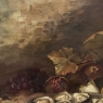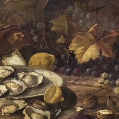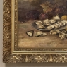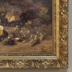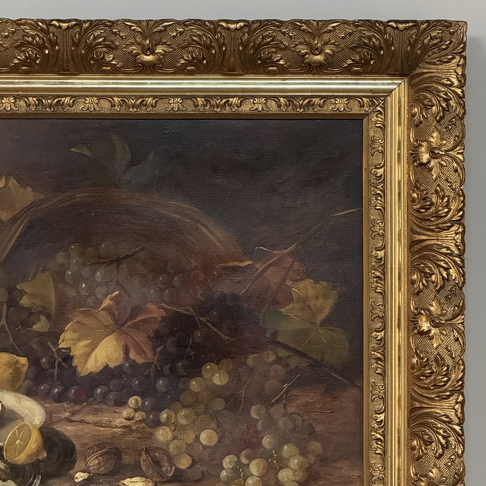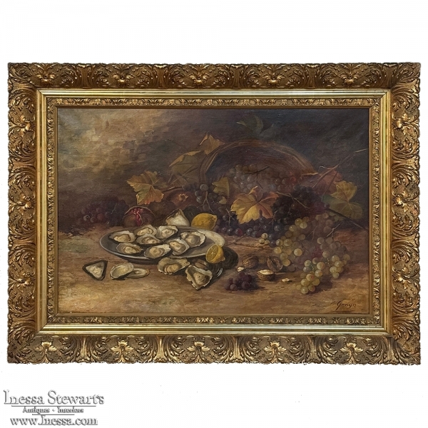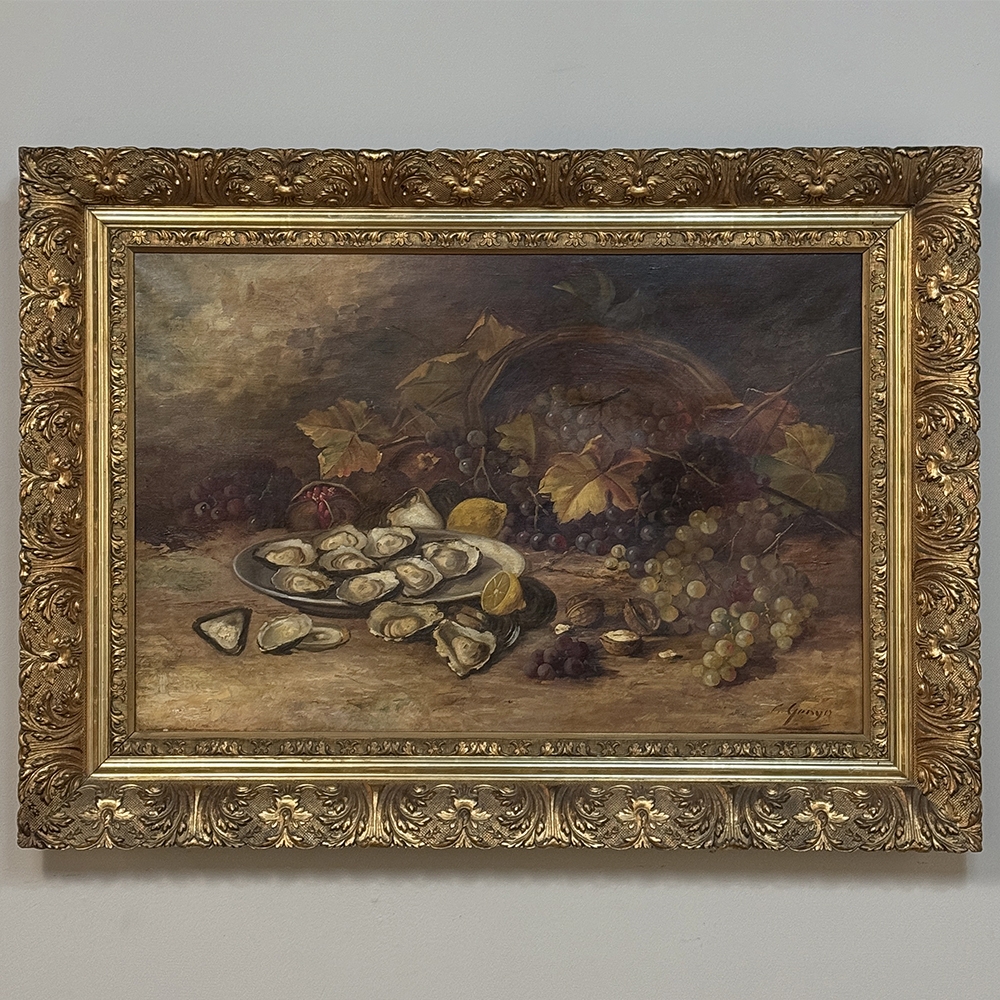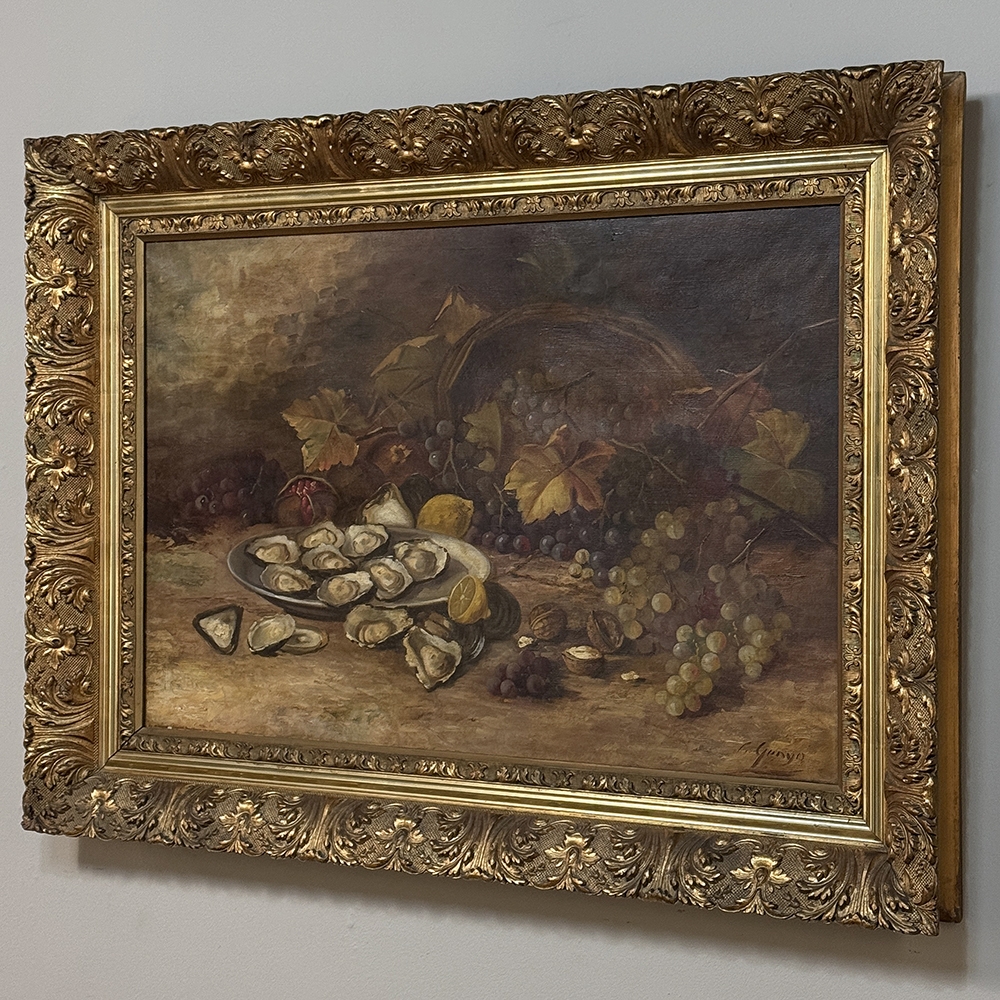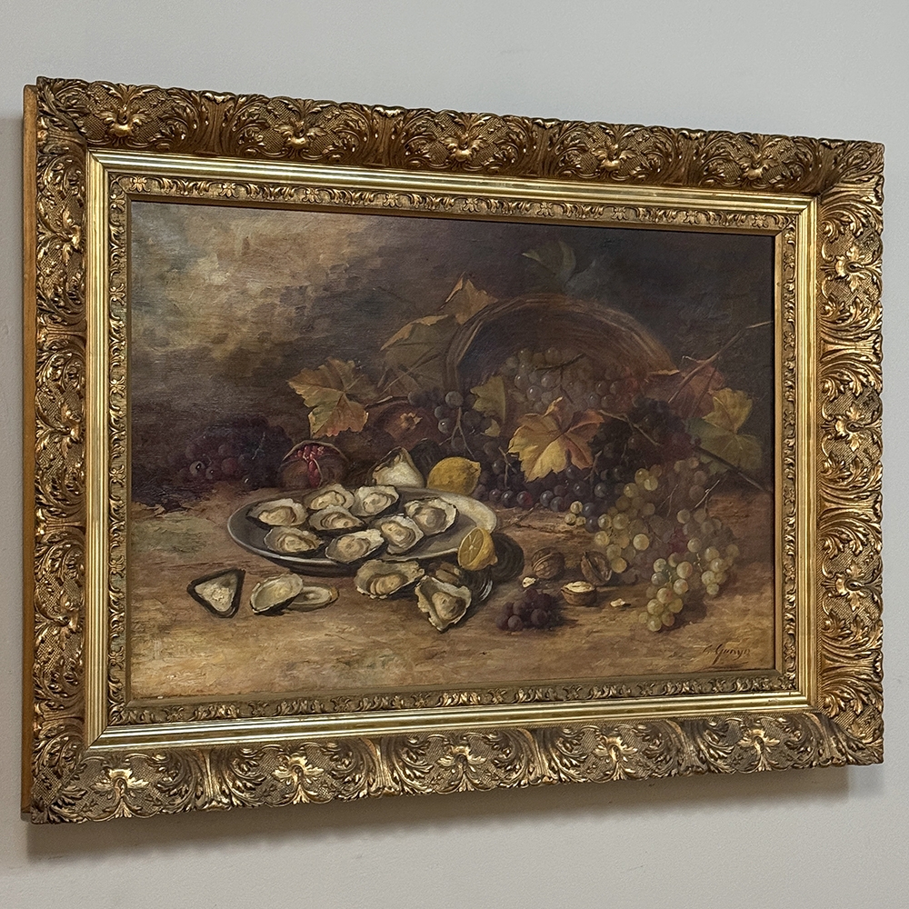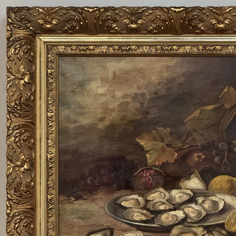 19th Century Framed Oil on Canvas of Still Life is an intriguing work, signed by the as yet unidentified artist. Representing a combination of techniques, the artist has skillfully blended the color palette in transition from background to subject. Using a muted light source, shadows enhance definition of the finer details. Celebrating the enjoyment of the bounty of the earth, seafood, citrus and varieties of grapes are all represented, making for an exceptional picnic lunch! Oysters were considered a delicacy in most of Europe at the time, as refrigerated transport had yet to be modernized. Survives in its intricately crafted gilded frame. Minor repairs & professional restorations completed by our expert in-house staff.
