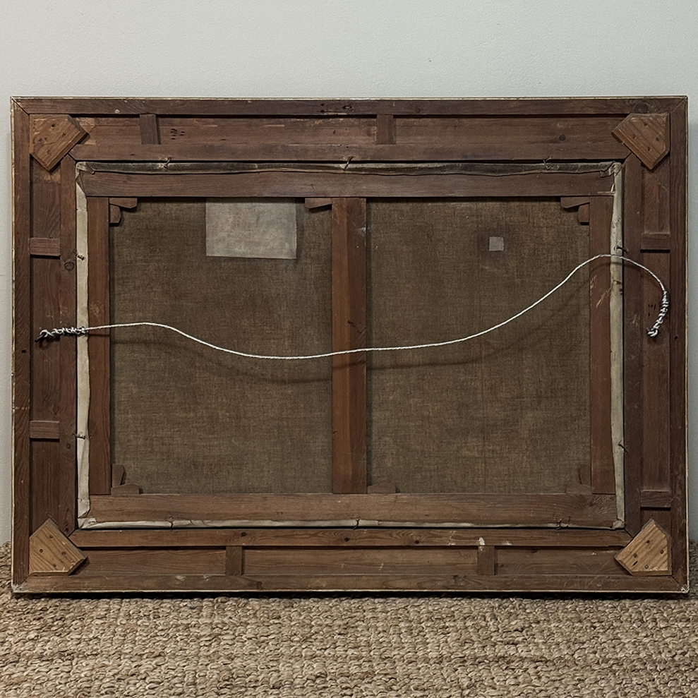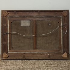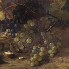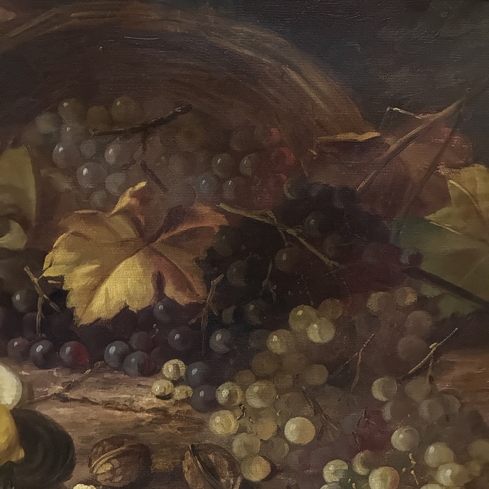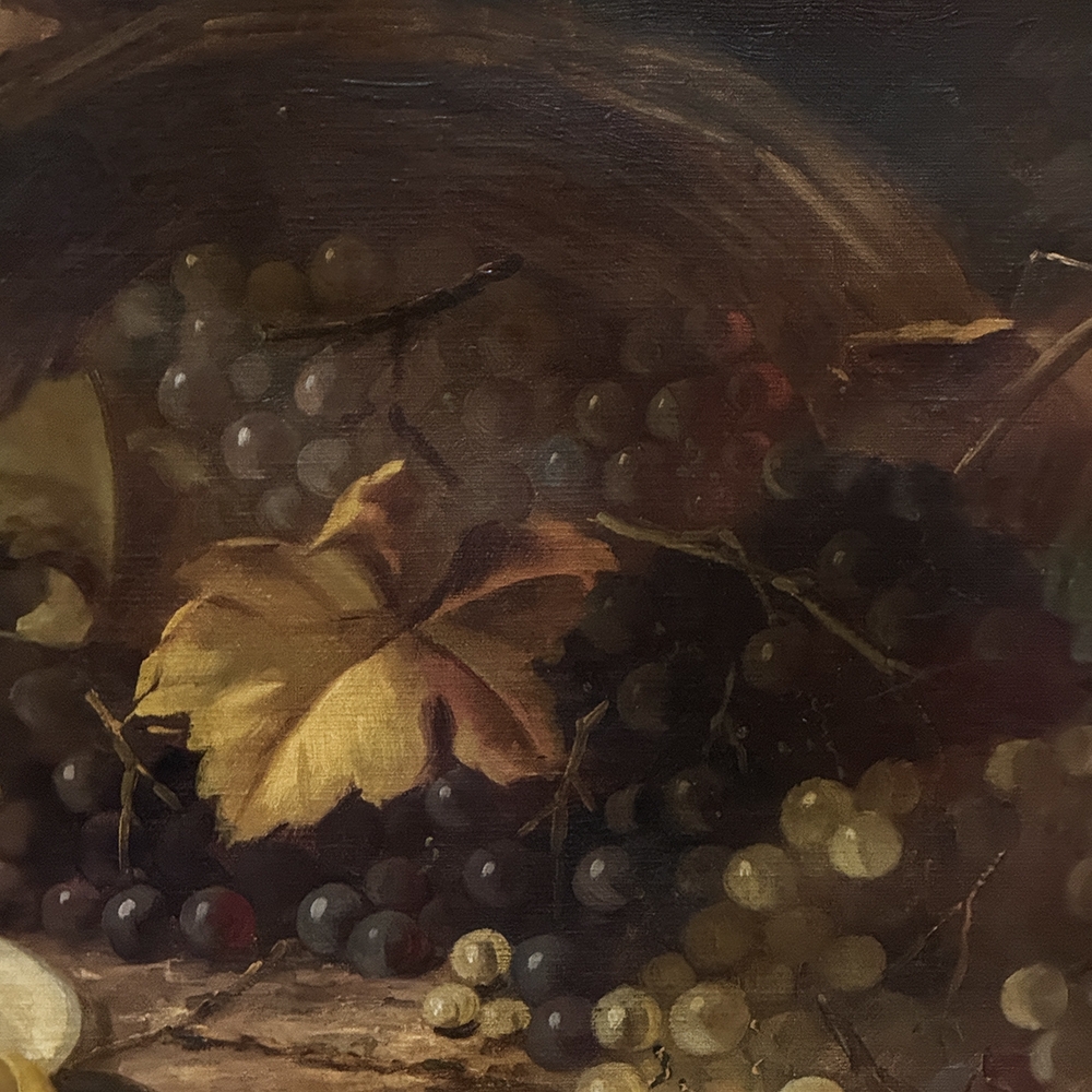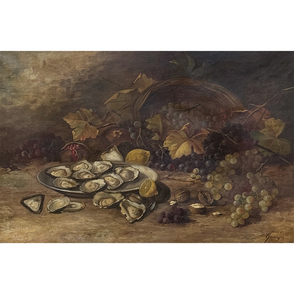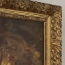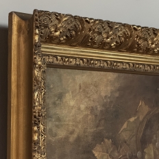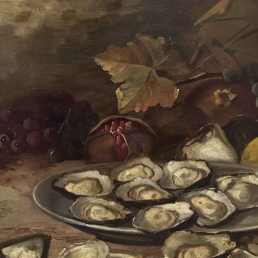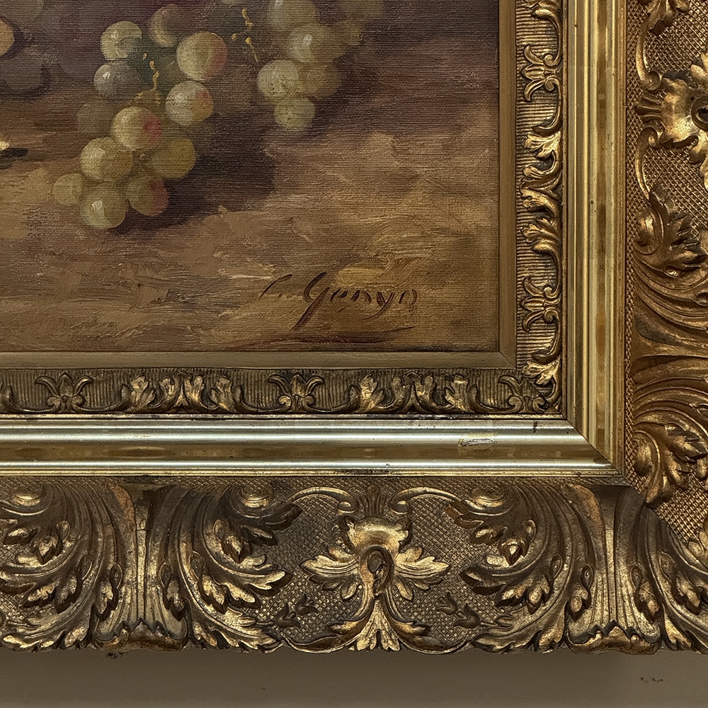 19th Century Framed Oil on Canvas of Still Life is an intriguing work, signed by the as yet unidentified artist. Representing a combination of techniques, the artist has skillfully blended the color palette in transition from background to subject. Using a muted light source, shadows enhance definition of the finer details. Celebrating the enjoyment of the bounty of the earth, seafood, citrus and varieties of grapes are all represented, making for an exceptional picnic lunch! Oysters were considered a delicacy in most of Europe at the time, as refrigerated transport had yet to be modernized. Survives in its intricately crafted gilded frame. Minor repairs & professional restorations completed by our expert in-house staff.