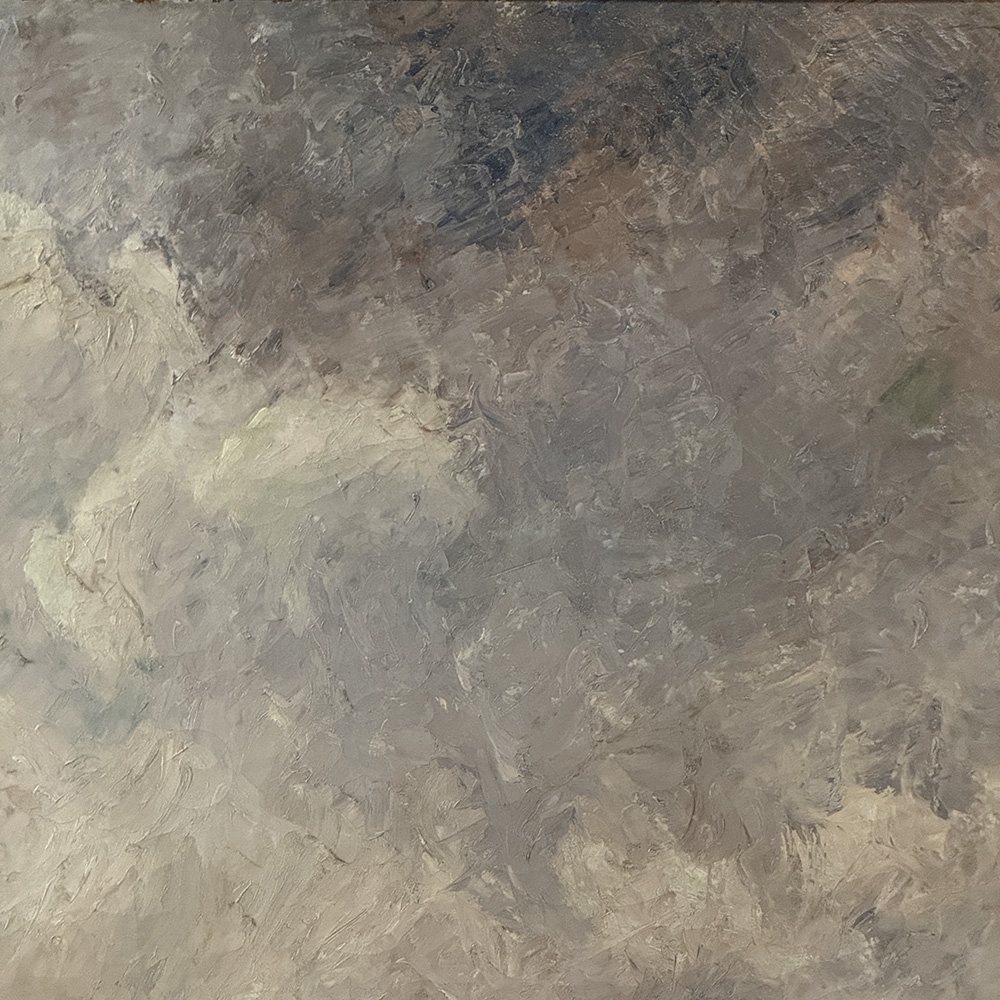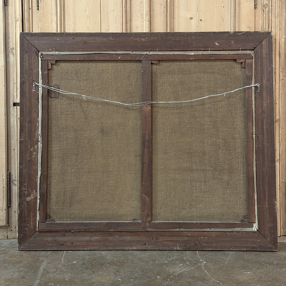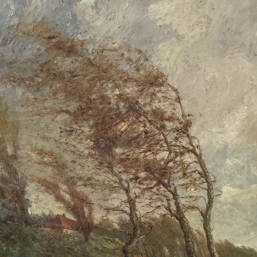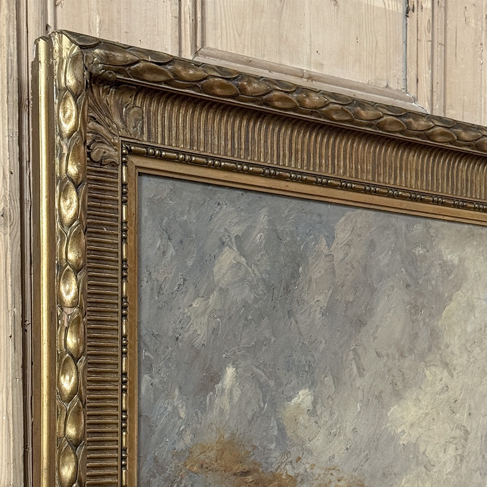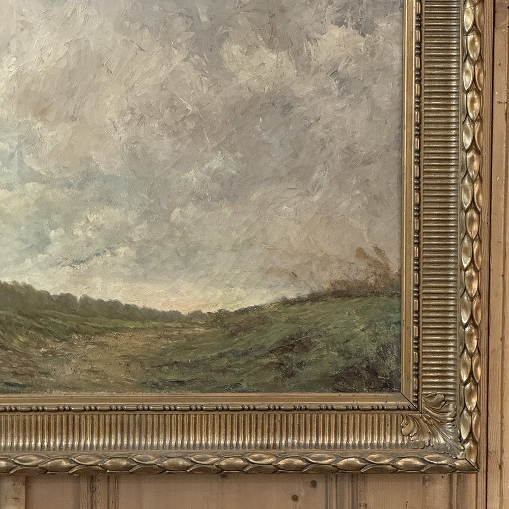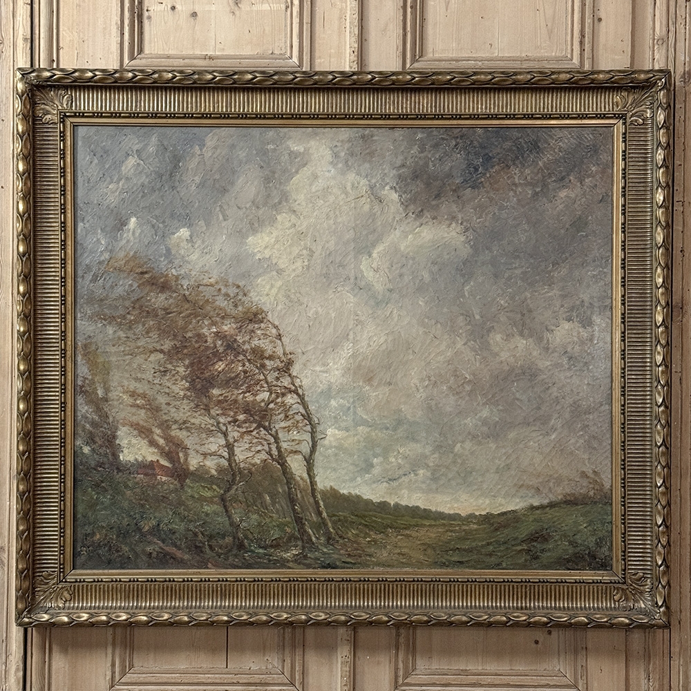 19th Century Framed Oil Painting on Canvas is a striking composition ~ capturing a windy day along the part of land just off the coast that is not directly adjacent to the sea yet still receives the characteristic weather. The dominant feature of the work are the trees in the left foreground, and it is immediately obvious they are subjected to strong winds on a constant basis. The rolling landscape in the rest of the composition shows vegetation clinging to the sandy soil. Just as striking, the artist has captured the ominous, turbulent sky overhead which gives an unrelenting impression. Surviving in its original frame, it shows one minor professional repair visible only on the back side.