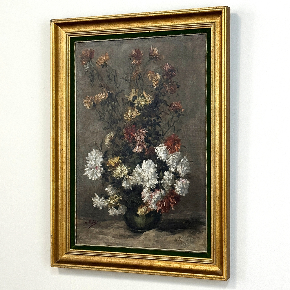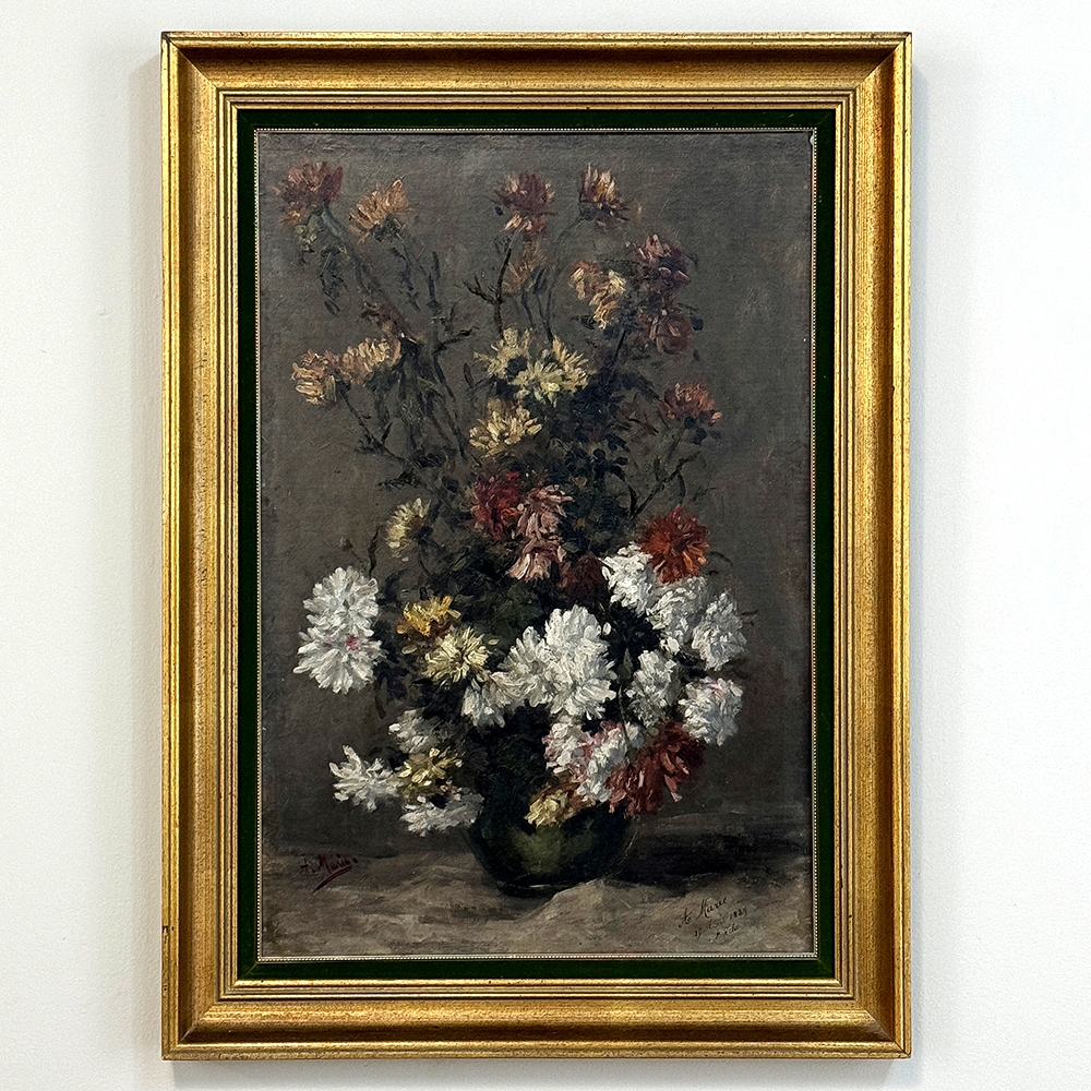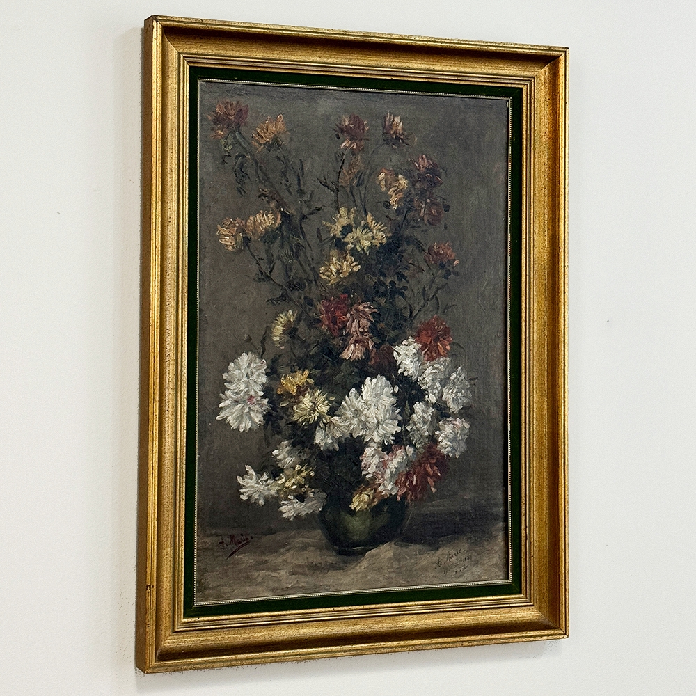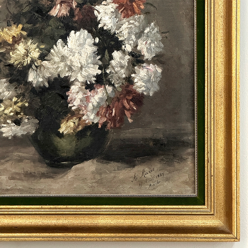 19th Century Framed Oil Painting on Canvas by A. Marie dated 1889 is an unusual still life, glorifying the natural beauty of wildflowers as opposed to a meticulously arranged bouquet. The study also shows the life cycle of the fresh-cut flowers, from hours old to days old, reminding us of the circle of life. Marie makes good use of lighting effect in the work as well, with subtle shadows and variances throughout the composition. Originally signed by the artist, it was dedicated to a lady by the name of Marthe on the 19th of April in 1889. Marthe's significance in the artist's life has unfortunately been lost to history. The canvas was mounted on panel and the work was expertly re-framed prior to our acquisition in Europe.