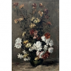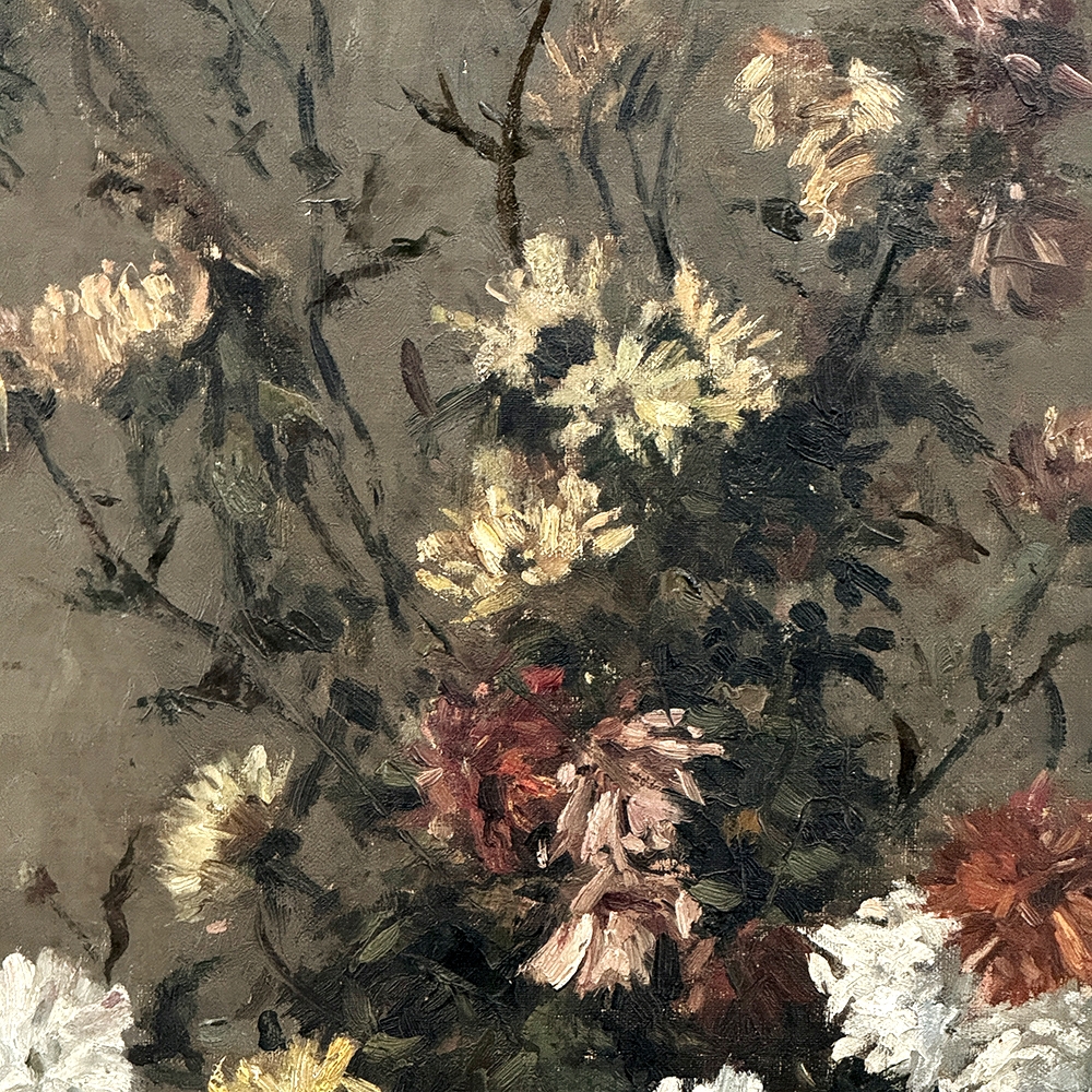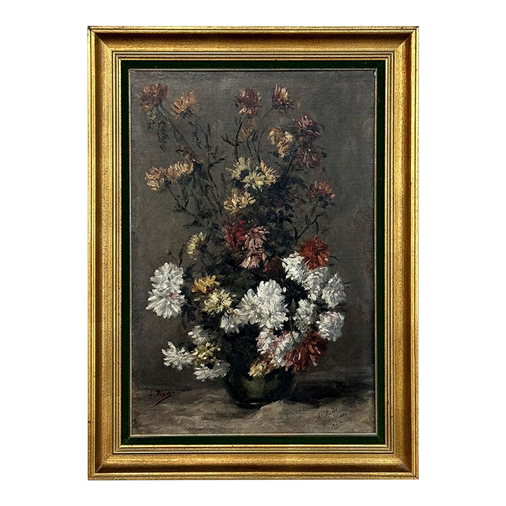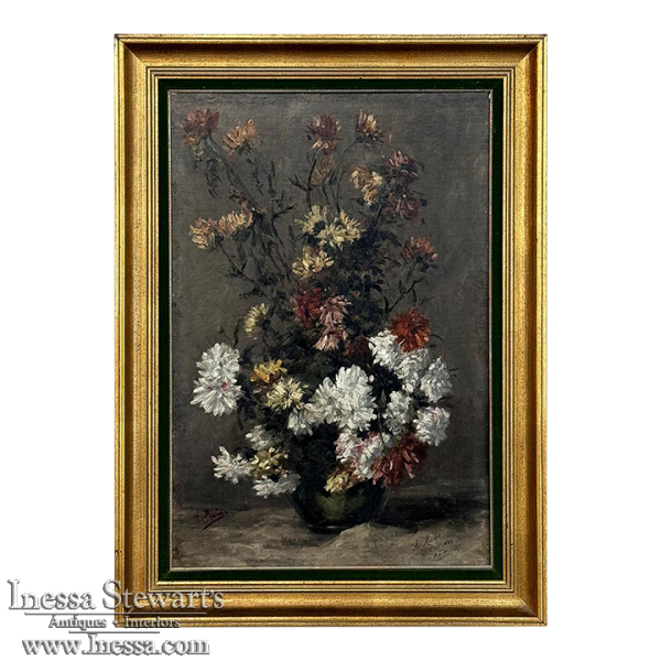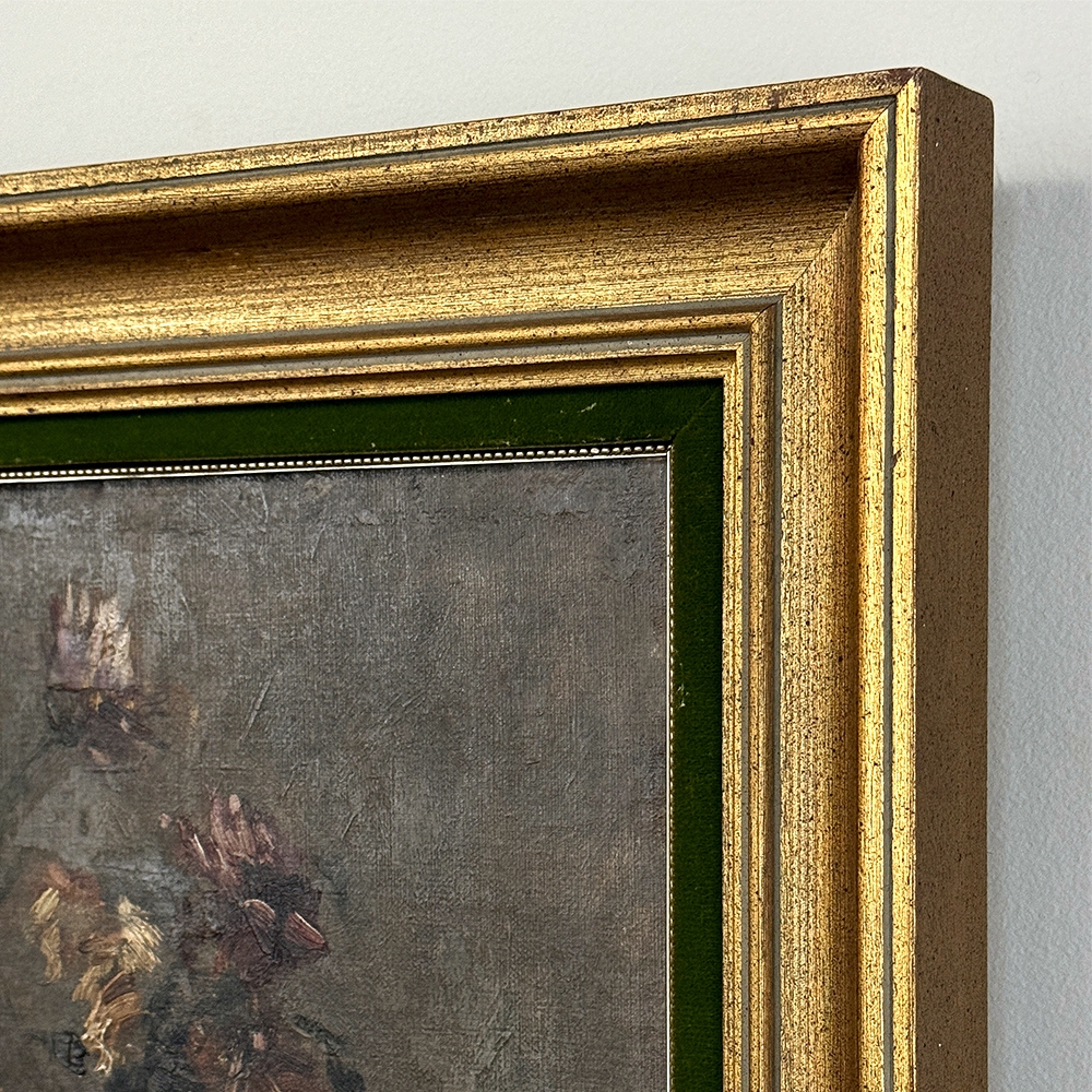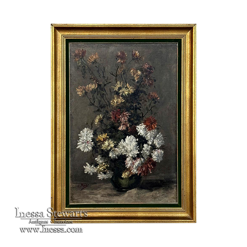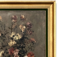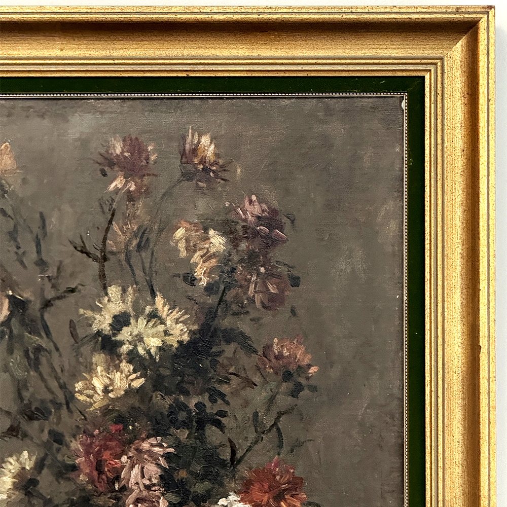 19th Century Framed Oil Painting on Canvas by A. Marie dated 1889 is an unusual still life, glorifying the natural beauty of wildflowers as opposed to a meticulously arranged bouquet. The study also shows the life cycle of the fresh-cut flowers, from hours old to days old, reminding us of the circle of life. Marie makes good use of lighting effect in the work as well, with subtle shadows and variances throughout the composition. Originally signed by the artist, it was dedicated to a lady by the name of Marthe on the 19th of April in 1889. Marthe's significance in the artist's life has unfortunately been lost to history. The canvas was mounted on panel and the work was expertly re-framed prior to our acquisition in Europe.