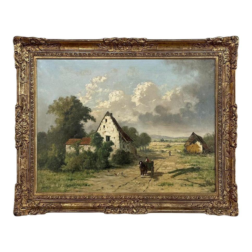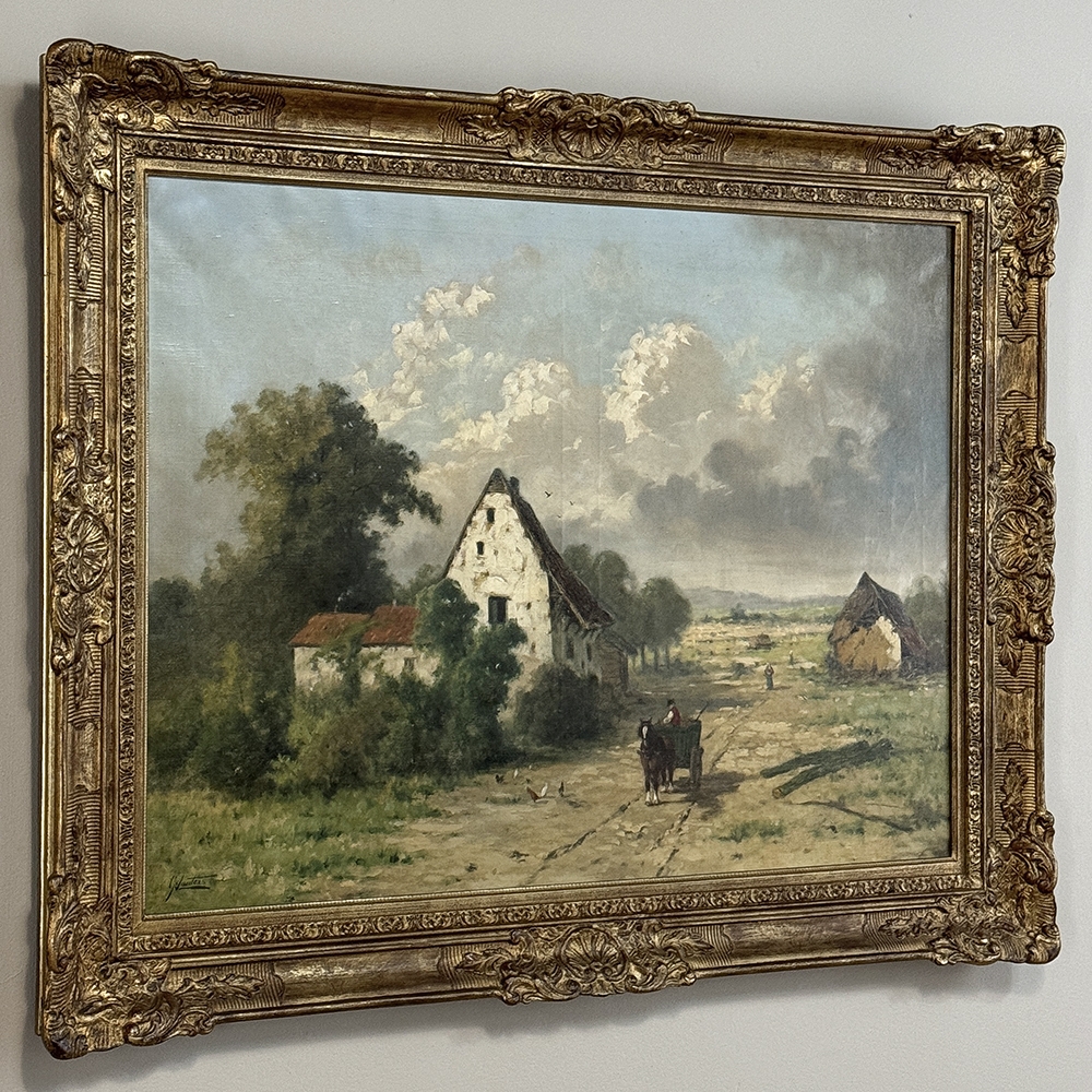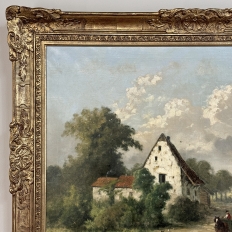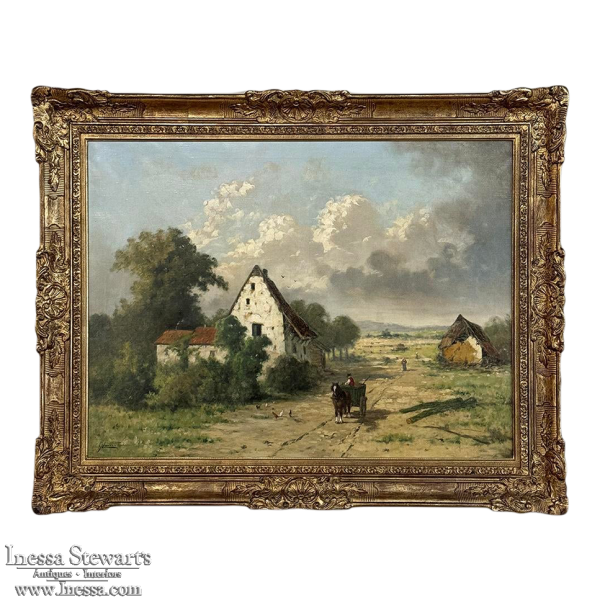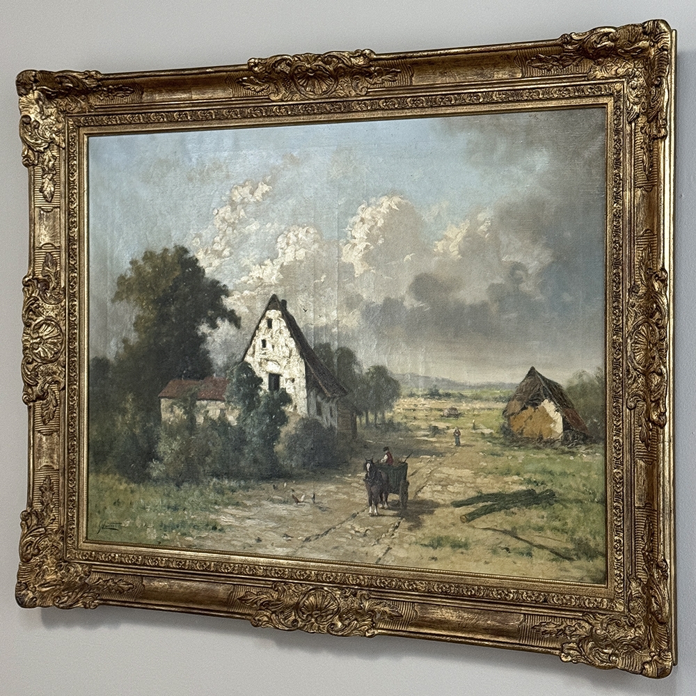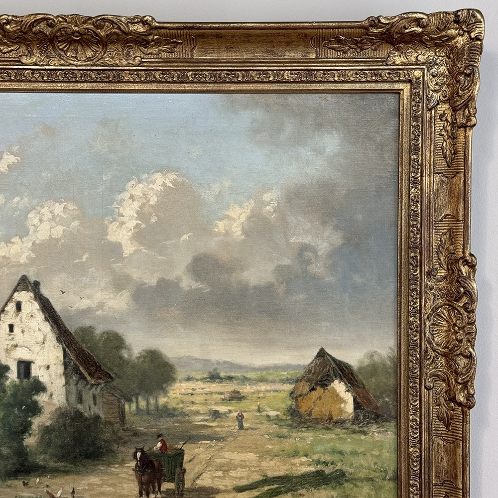 19th Century Framed Oil Painting on Canvas by Guillaume Lauters (1809–1889) is a particularly interesting work by the artist, known for his grand landscapes. Here he has created the landscape as a backdrop for the added influence of rural life and human interest. In glorifying the rural life, Lauters has brought life to a simpler time, before the days of mechanization and technology. The peaceful pastoral scene depicts members of a rural family going about their daily business surrounded by the majesty of nature herself, with thatched-roof cottages for shelter, and carts powered by actual horsepower! Survives in its original frame and signed by the artist, it displays a remarkable state of preservation.