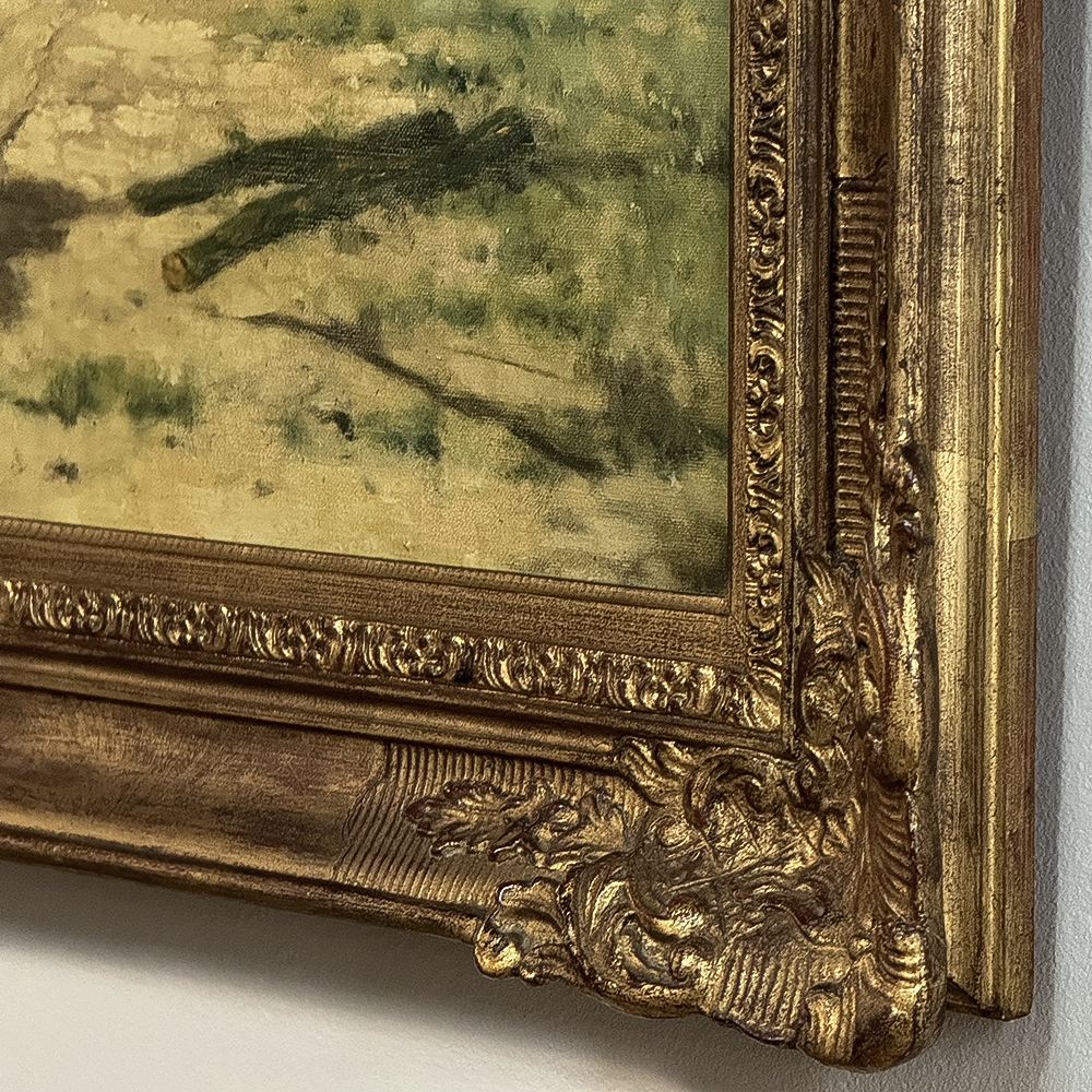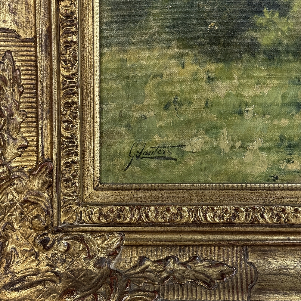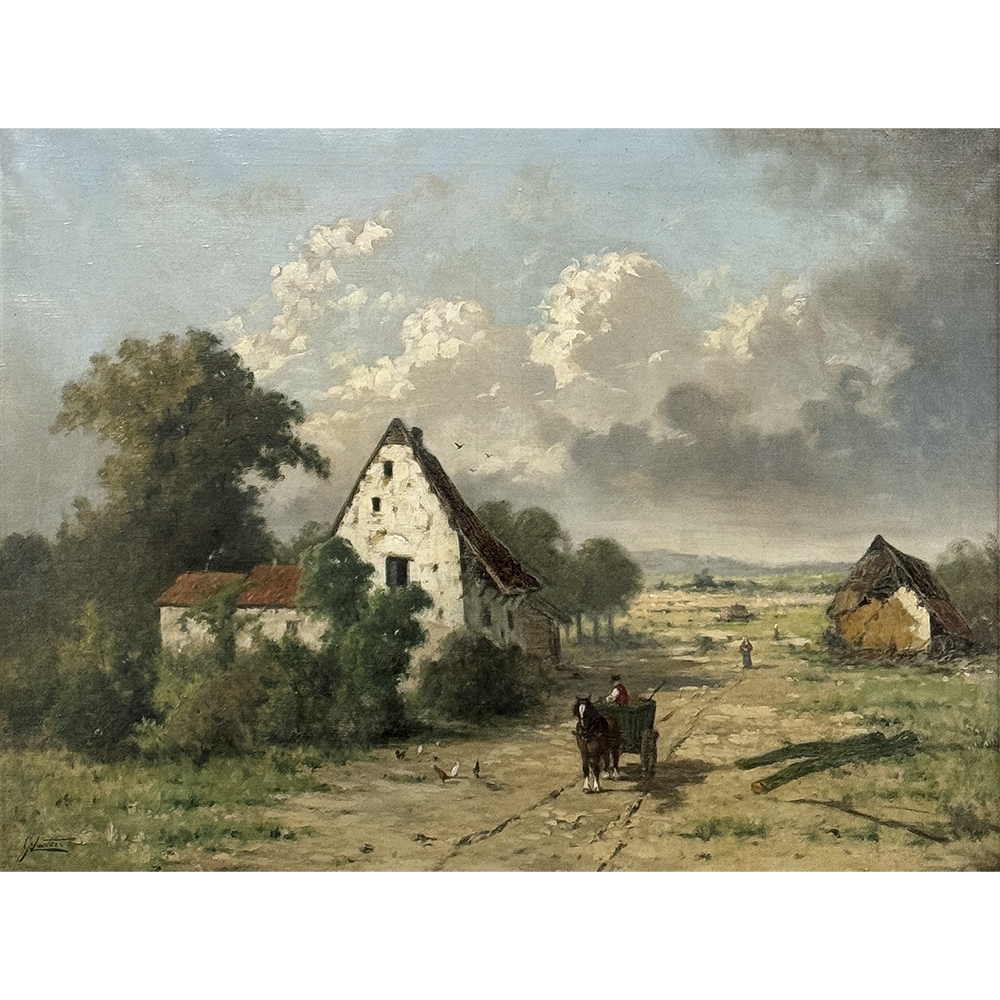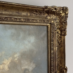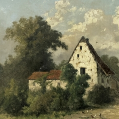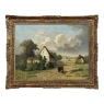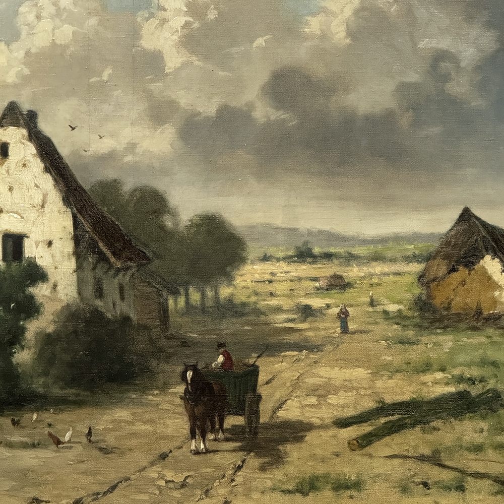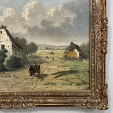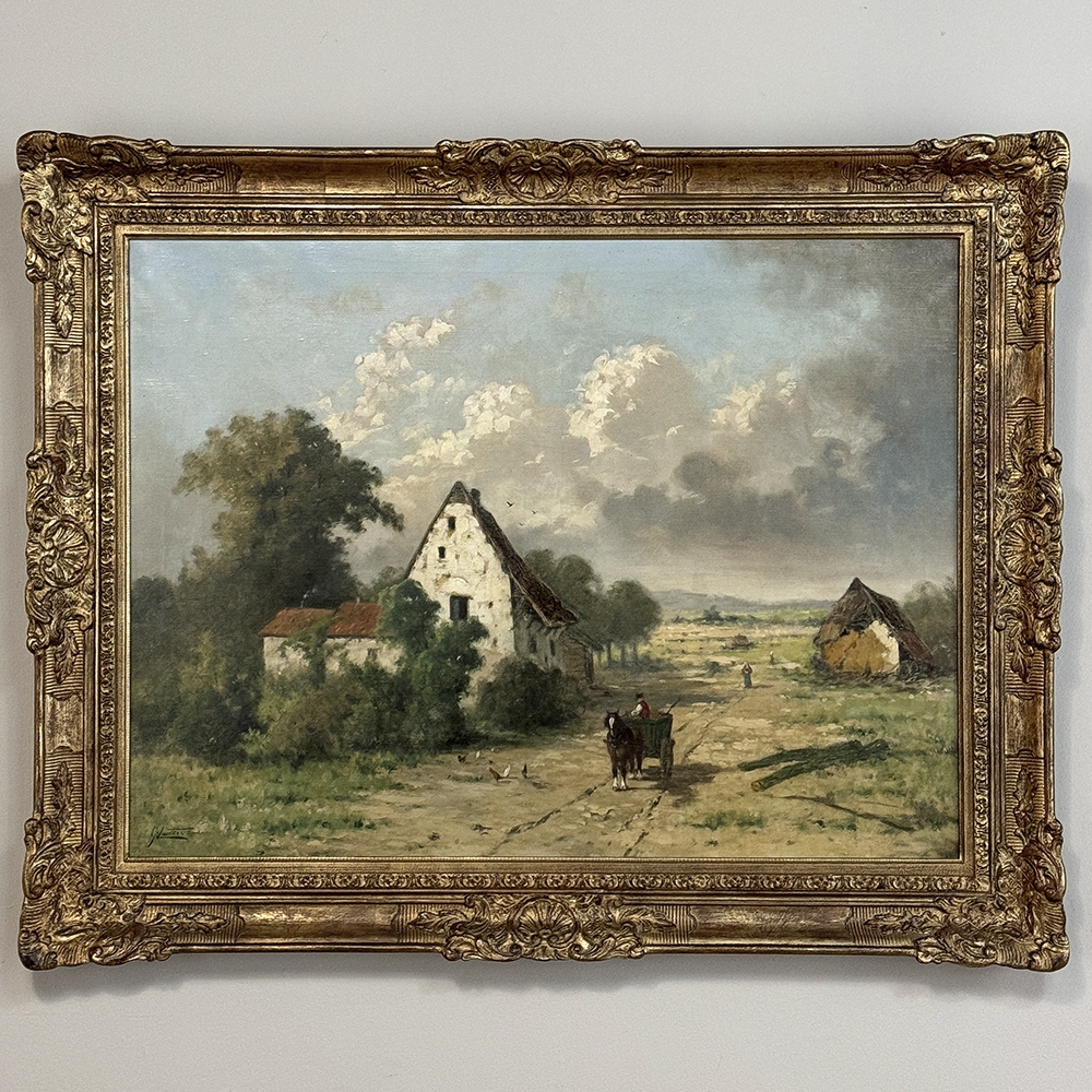 19th Century Framed Oil Painting on Canvas by Guillaume Lauters (1809–1889) is a particularly interesting work by the artist, known for his grand landscapes. Here he has created the landscape as a backdrop for the added influence of rural life and human interest. In glorifying the rural life, Lauters has brought life to a simpler time, before the days of mechanization and technology. The peaceful pastoral scene depicts members of a rural family going about their daily business surrounded by the majesty of nature herself, with thatched-roof cottages for shelter, and carts powered by actual horsepower! Survives in its original frame and signed by the artist, it displays a remarkable state of preservation.