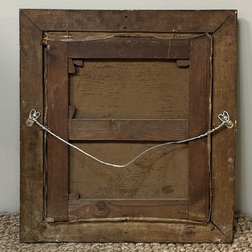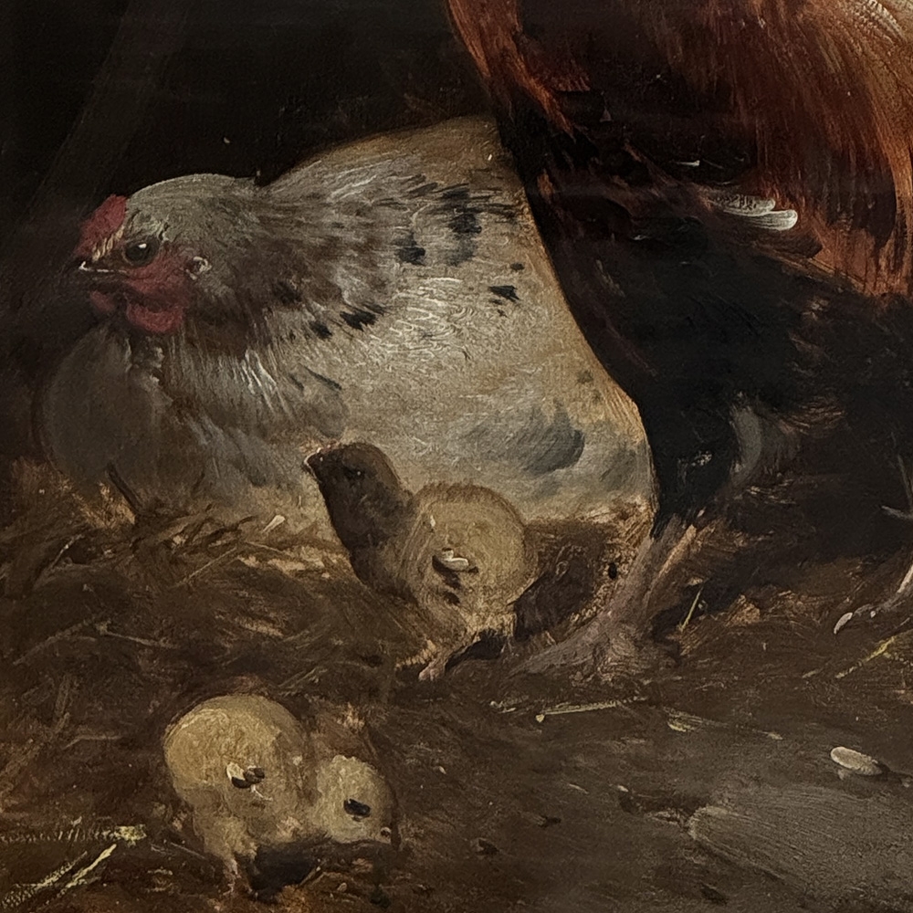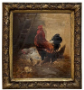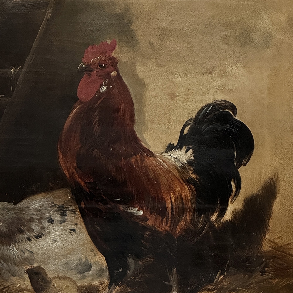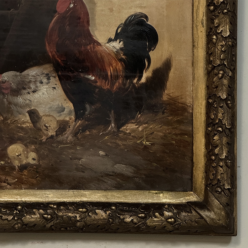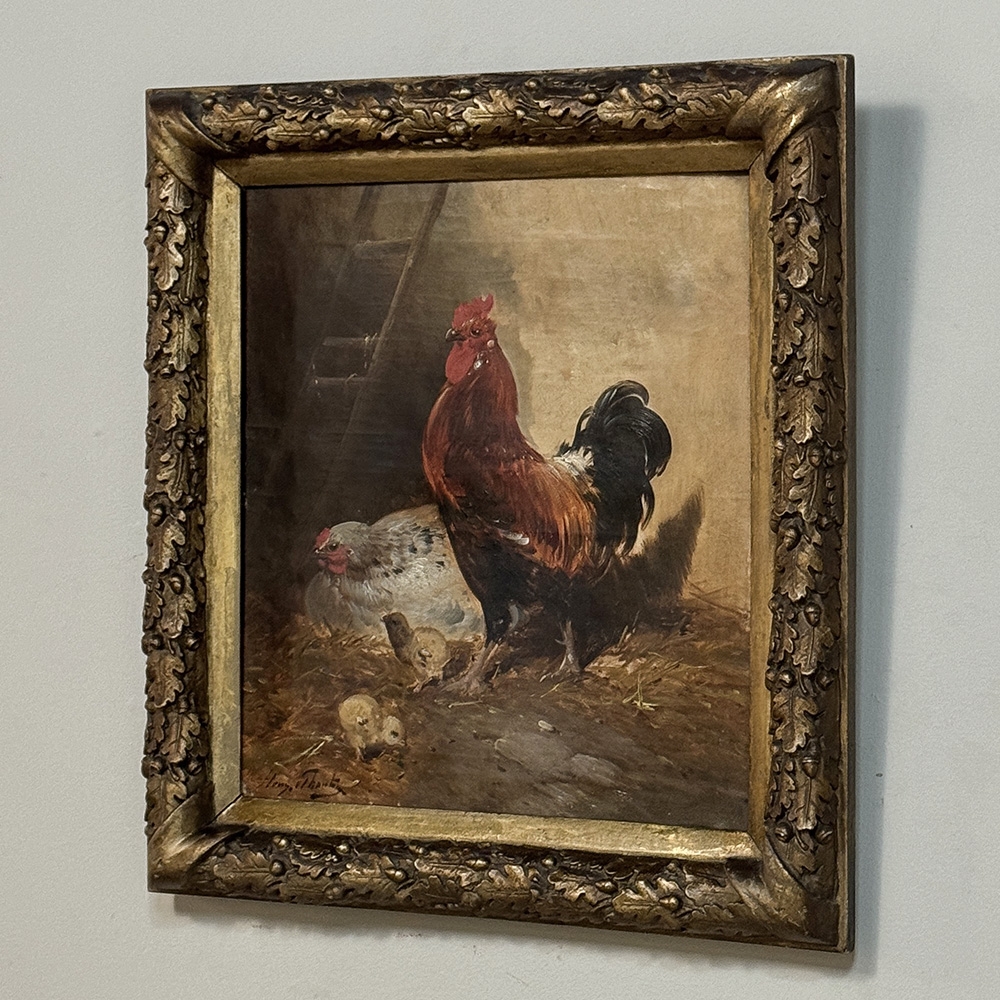 19th Century Framed Oil Painting on Canvas by Henry Schouten (1857-1927) is a marvelous example of the artist's work, depicting an alert cock standing guard over his hen and chicks. Note the masterful treatment of light and shadow, and subtle yet amazingly realistic use of color. Henry Schouten hailed from Ghent, the fabled ancient city that resides in what is now called Belgium. He studied under Alfred Verwee at the Art Academy of Brussels, and soon gravitated towards a specialty in landscapes with animals and livestock. He was a master of depicting animals in their natural surroundings, paying extra attention to the various features and distinctive traits of the varying breeds. Schouten's paintings have been much prized by admirers of rural life depictions beginning with the Belgian bourgeoisie in the second half of the 19th century. Survives in its original finely detailed giltwood frame.