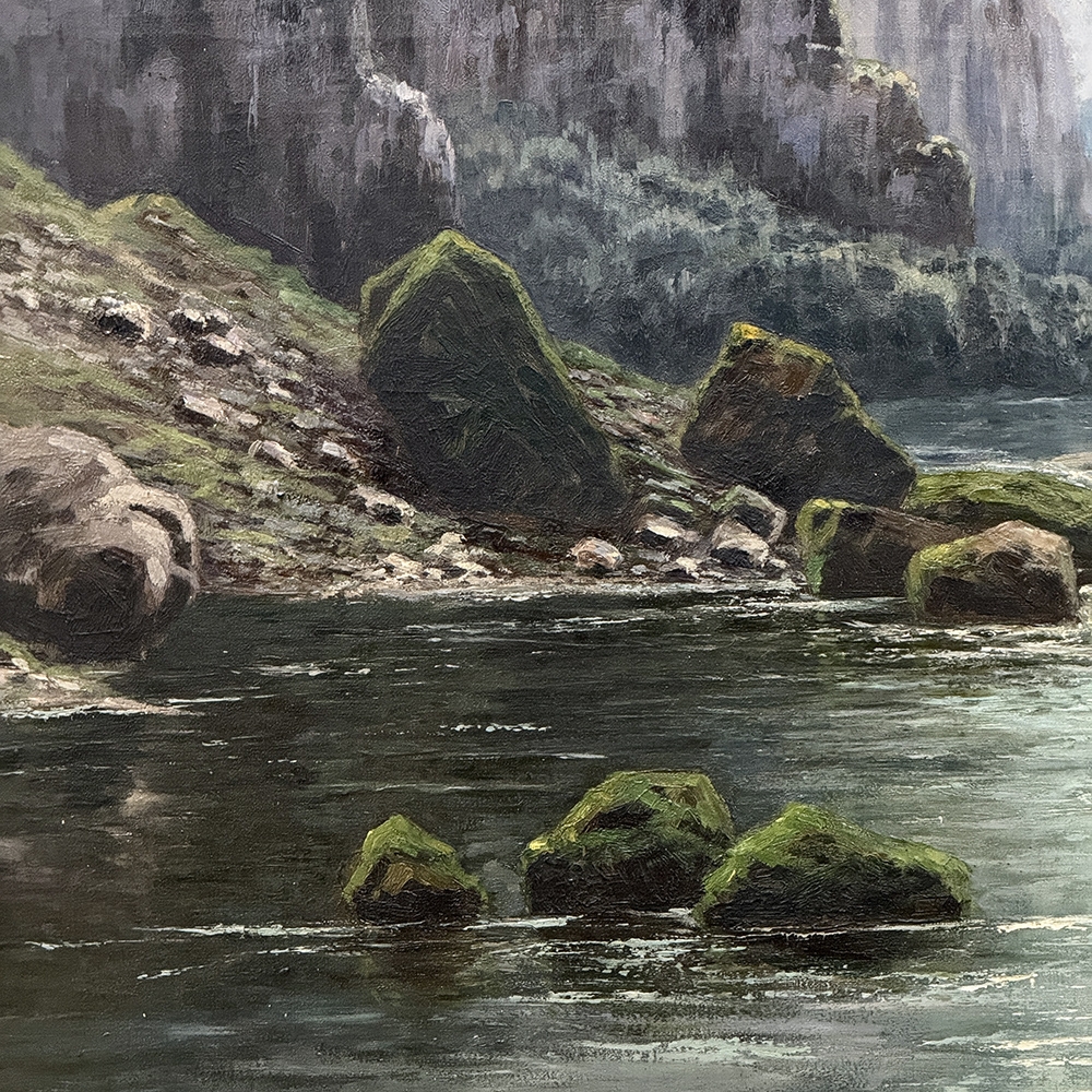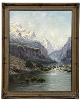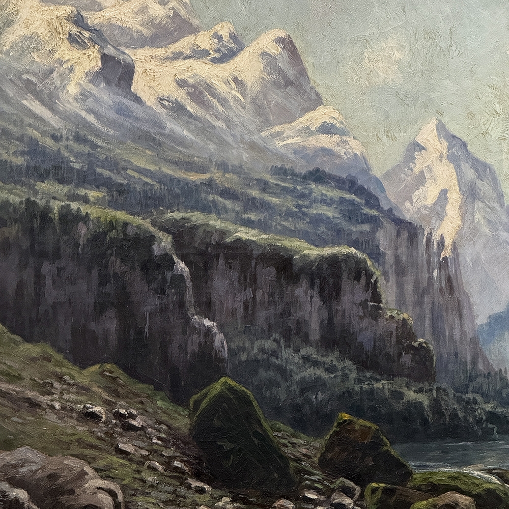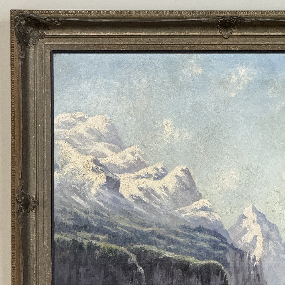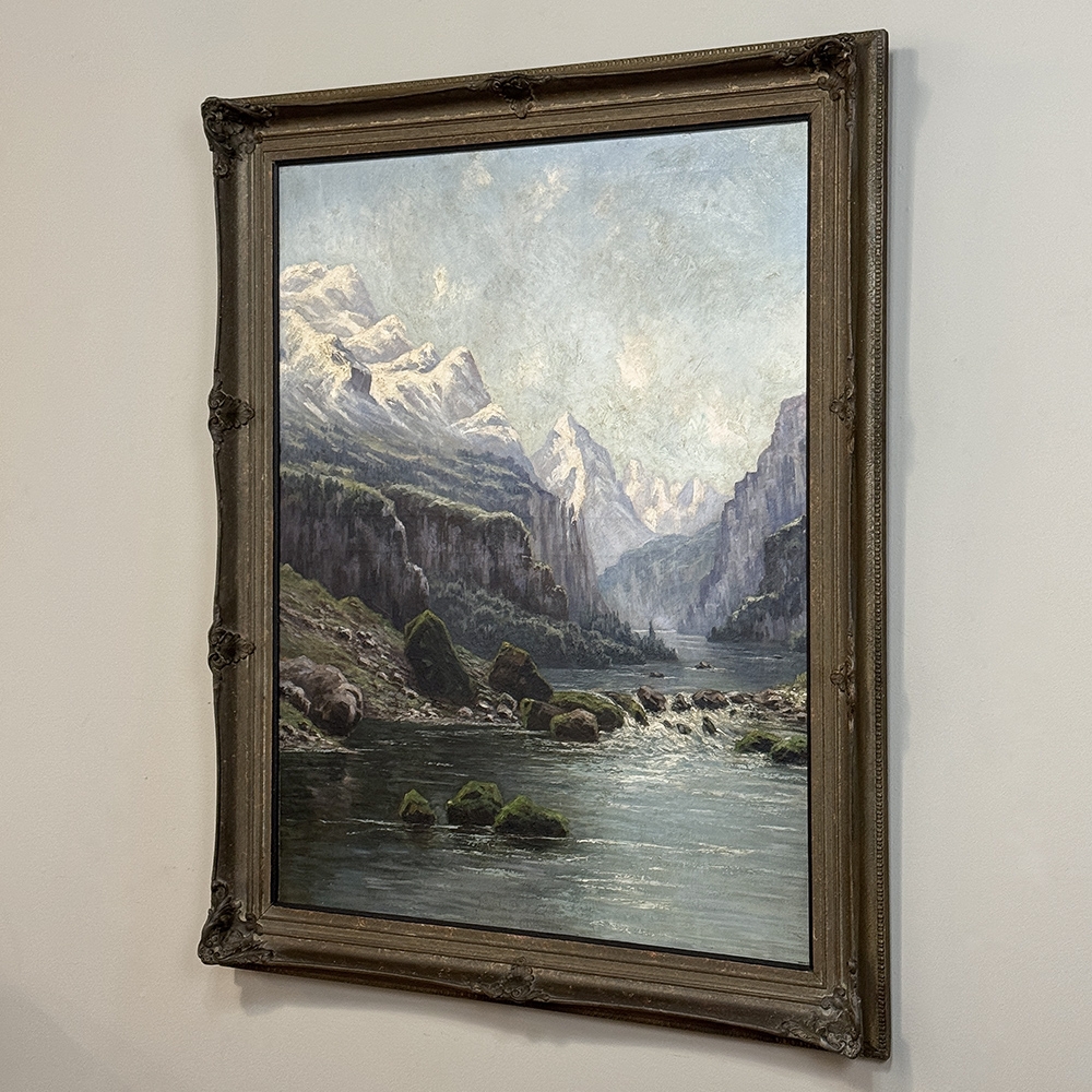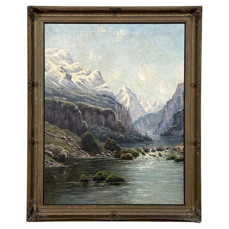 19th Century Framed Oil Painting on Canvas by L. Delderenne (1864-1921) is a captivating view of the Alps that provided the artist with inspiration to immortalize the scene. The snowmelt from the peaks in the background creates the rocky creek that dominates the foreground, inviting the viewer into the scene to appreciate nature's glory. Note how the artist has created a subtle transition between the snow-capped mountains and the wispy clouds blending up into a beautiful blue sky. One can sense the motion of the water around the rocks, and almost hear the babbling of the creek. The vertical nature of the landscape painting makes it somewhat unusual, especially when combined with such an artistic rendering in cool colors and earth tones.