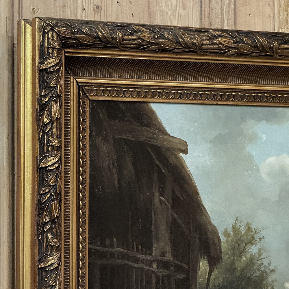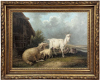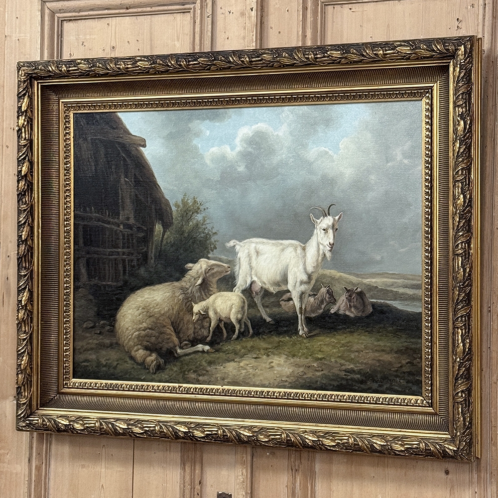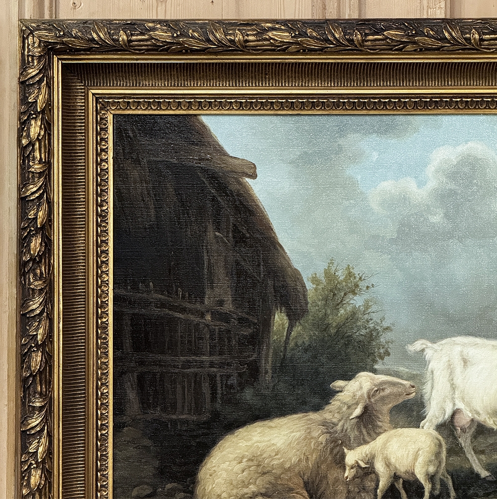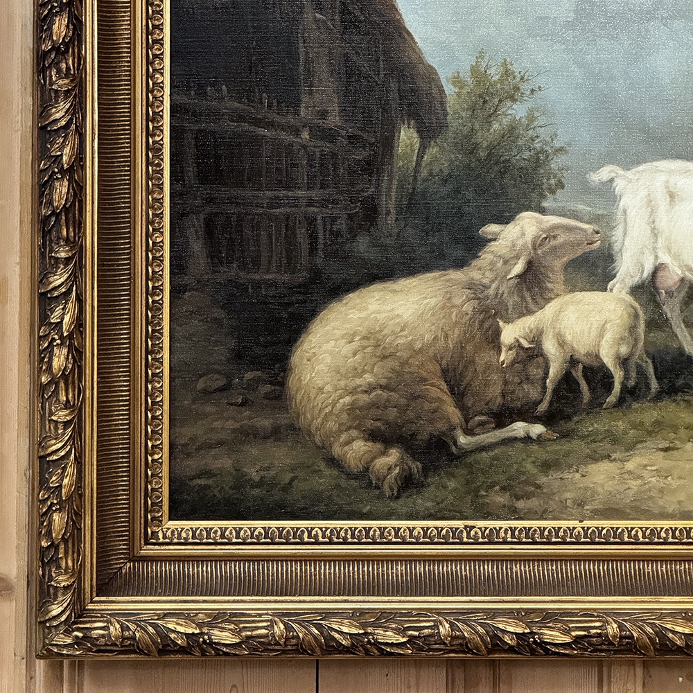 19th Century Framed Oil Painting on Canvas "Standing Guard" signed G. Dewyse is a superlative example of the genre, depicting farm animals and livestock as nobility. In this scene, the ram keeps guard over the flock like a sentinel, with no visible fencing in view. A quaint thatch-roofed stable is nearby, with excellent transition between the man-made creation and the animals who deliver a pastoral setting to the mood of the work. Puffy and graying clouds unsuccessfully try to hide the beautiful blue sky overhead. Survives in its original finely detailed giltwood frame.