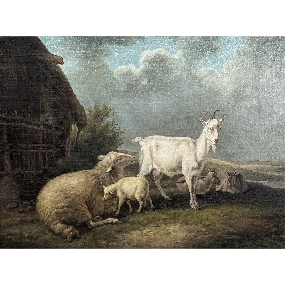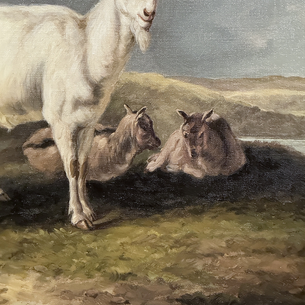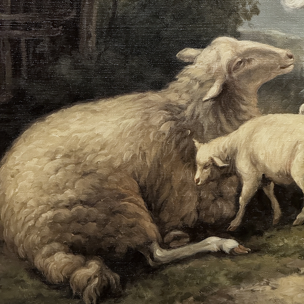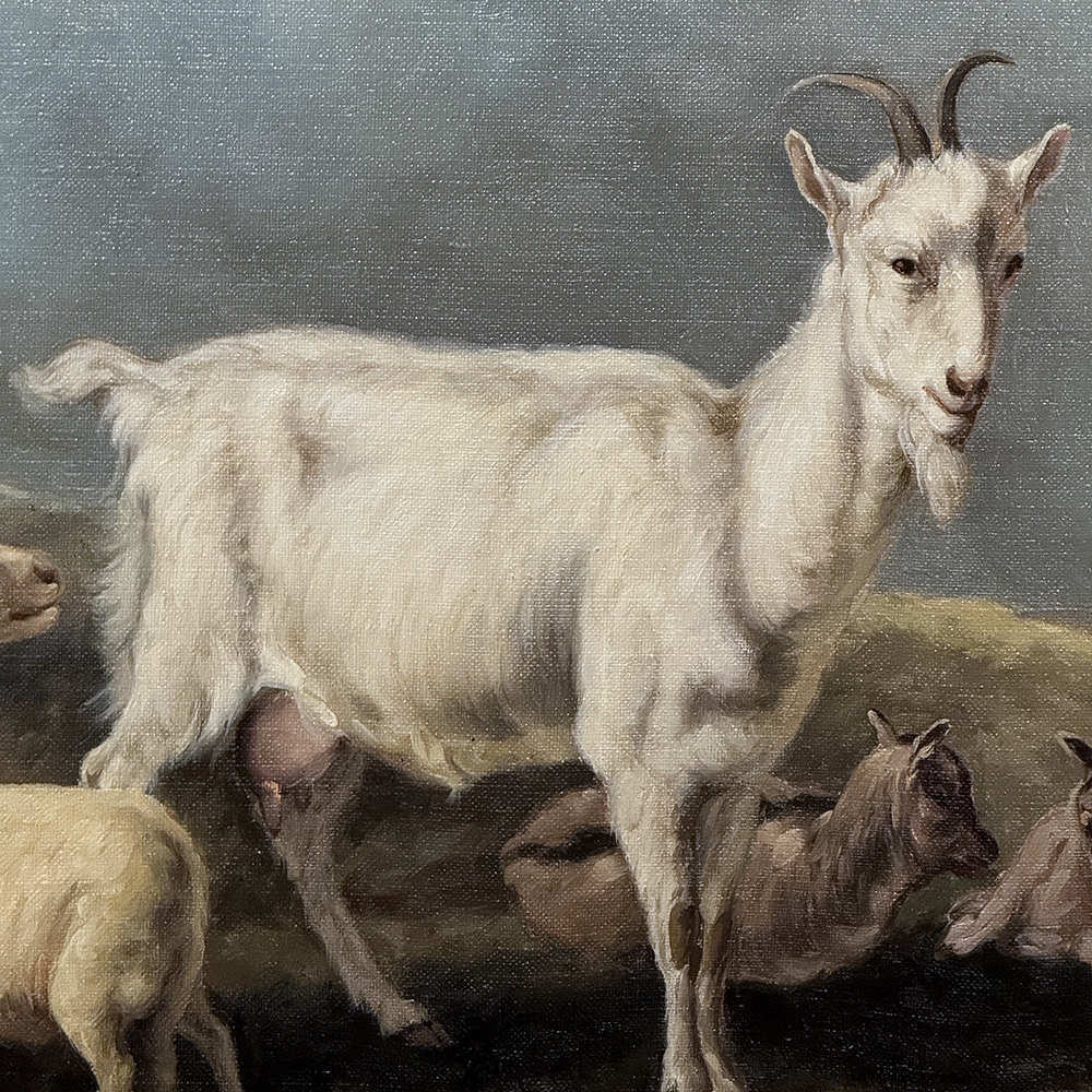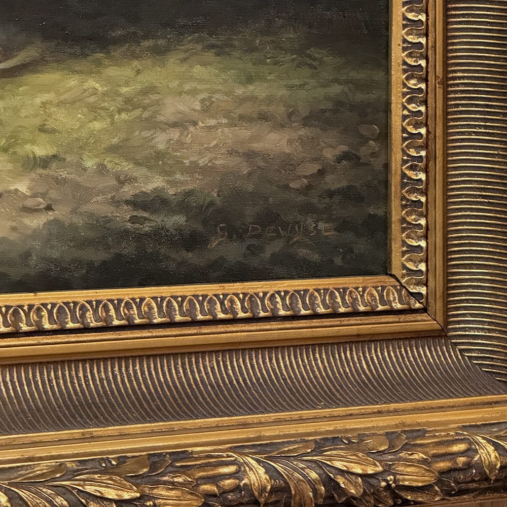 19th Century Framed Oil Painting on Canvas "Standing Guard" signed G. Dewyse is a superlative example of the genre, depicting farm animals and livestock as nobility. In this scene, the ram keeps guard over the flock like a sentinel, with no visible fencing in view. A quaint thatch-roofed stable is nearby, with excellent transition between the man-made creation and the animals who deliver a pastoral setting to the mood of the work. Puffy and graying clouds unsuccessfully try to hide the beautiful blue sky overhead. Survives in its original finely detailed giltwood frame.