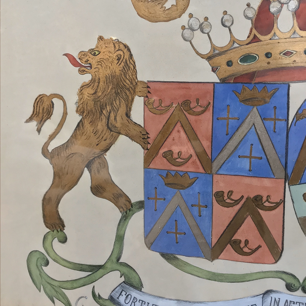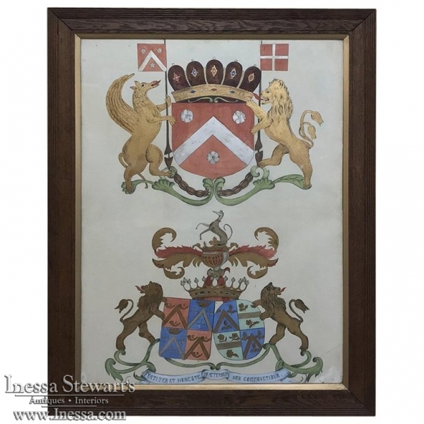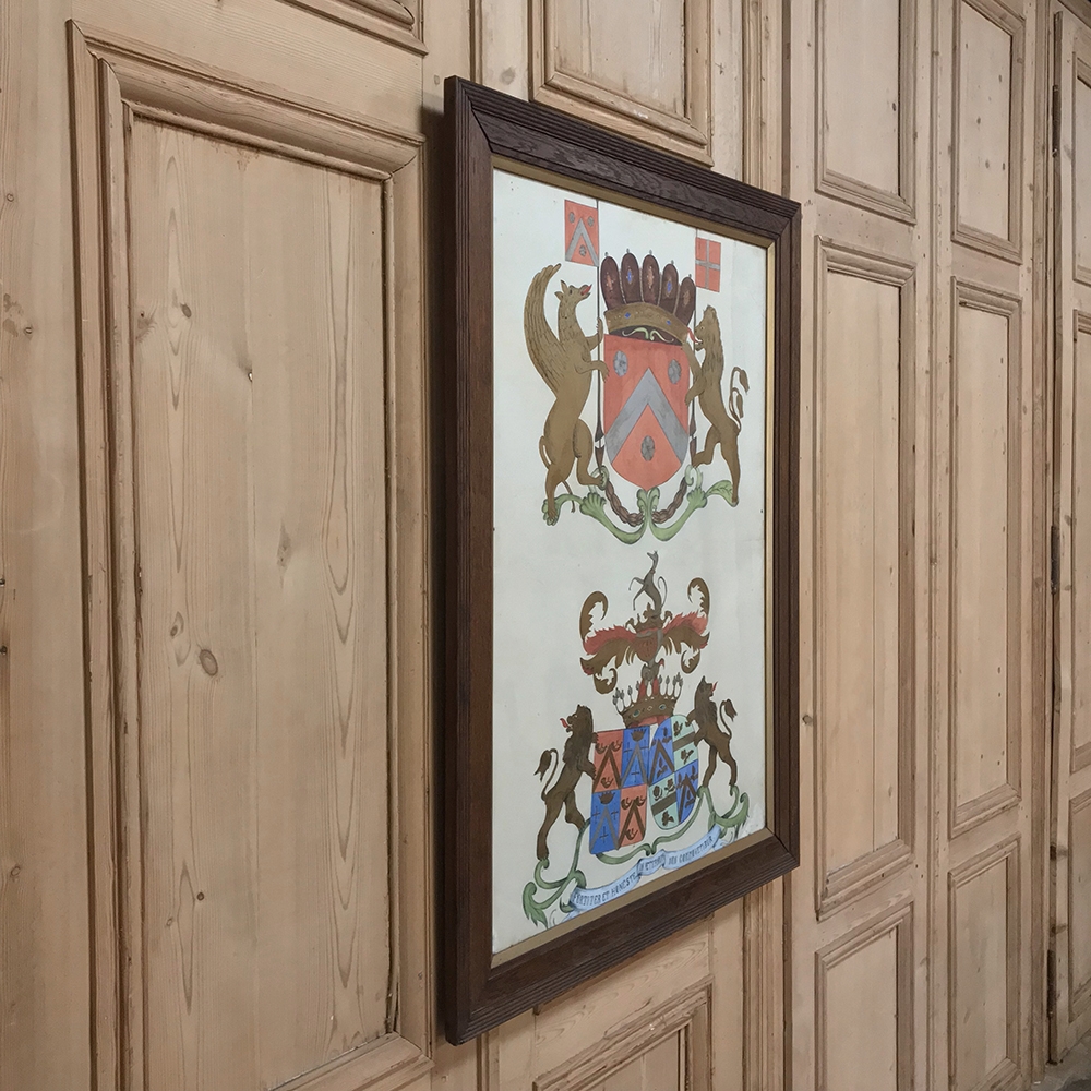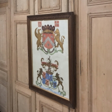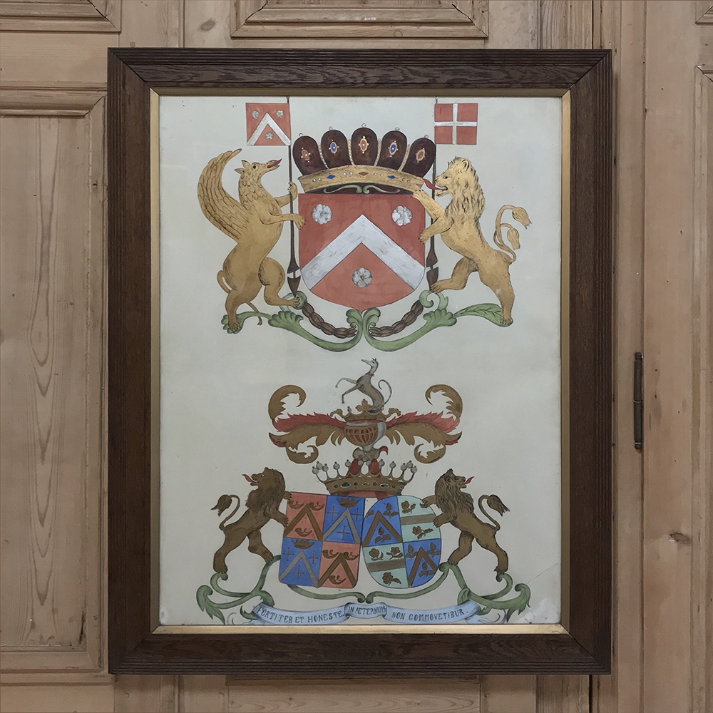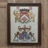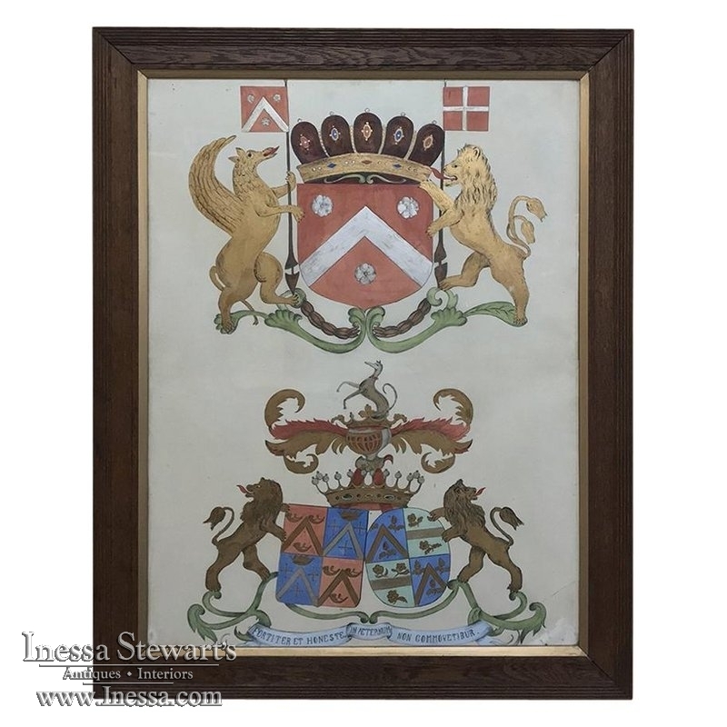 Sale19th Century Framed Painting of Family Crests was hand-painted in the late 19th century and framed in the 20th century. The artist used mixed media of ink and water colors to create the beautiful jewel tones of the work. The Latin inscription below translates to: "Bravely and Honorably Stand Fast Together Forever". The crests indicate two families joined together by marriage. Family crests were important legacies of families who had some sort of ties to nobility, and were a sign of prestige and pride to those who could rightfully claim their heritage.