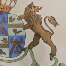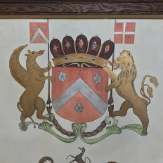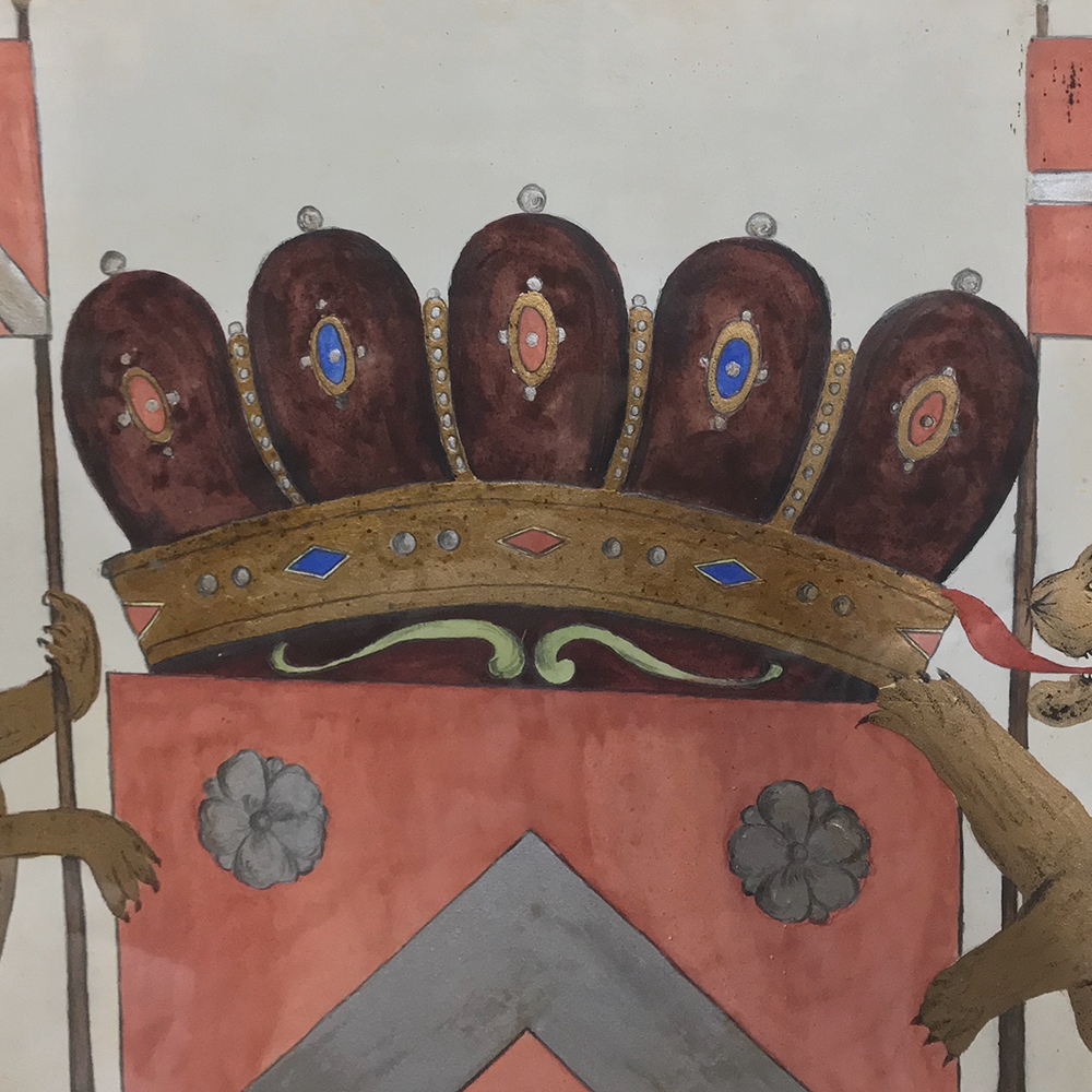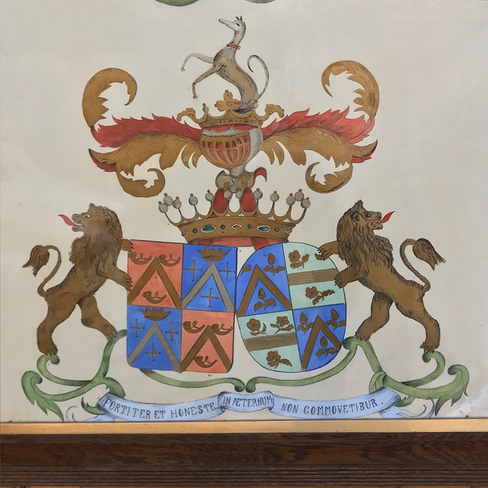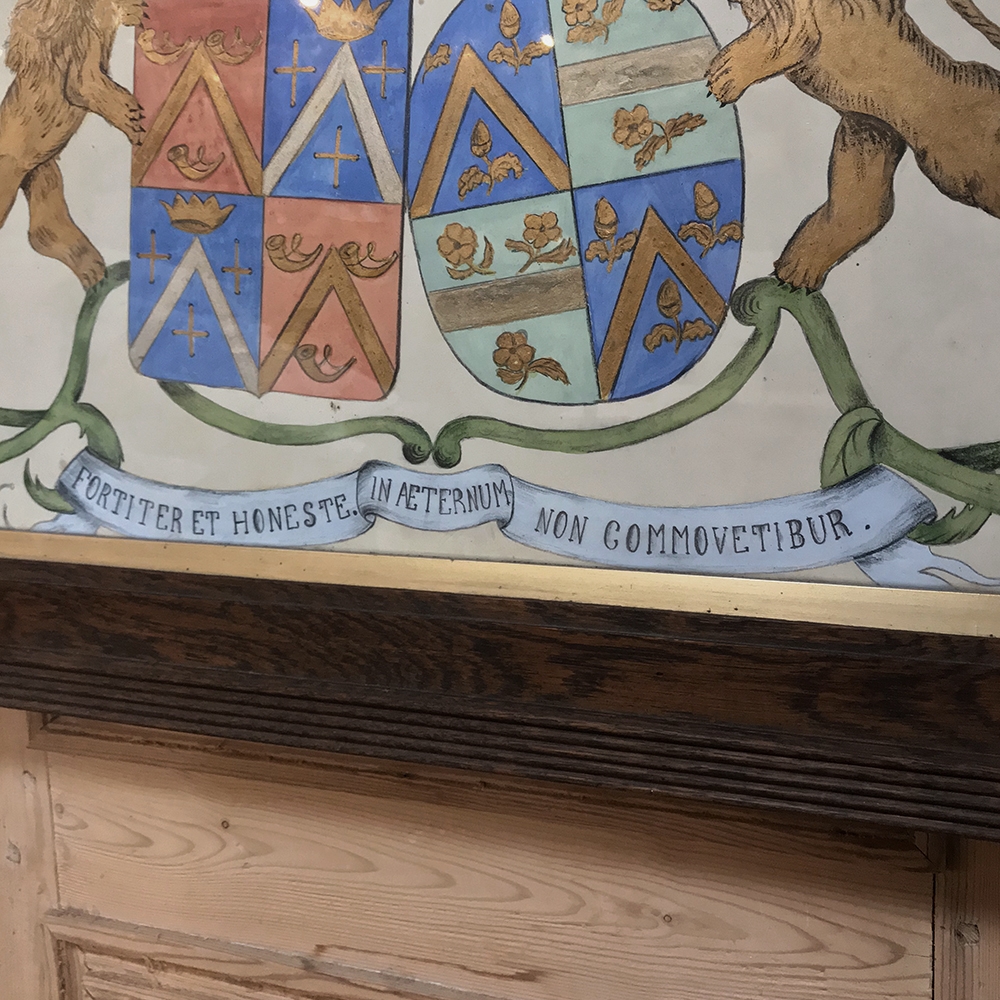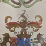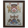 Sale19th Century Framed Painting of Family Crests was hand-painted in the late 19th century and framed in the 20th century. The artist used mixed media of ink and water colors to create the beautiful jewel tones of the work. The Latin inscription below translates to: "Bravely and Honorably Stand Fast Together Forever". The crests indicate two families joined together by marriage. Family crests were important legacies of families who had some sort of ties to nobility, and were a sign of prestige and pride to those who could rightfully claim their heritage.