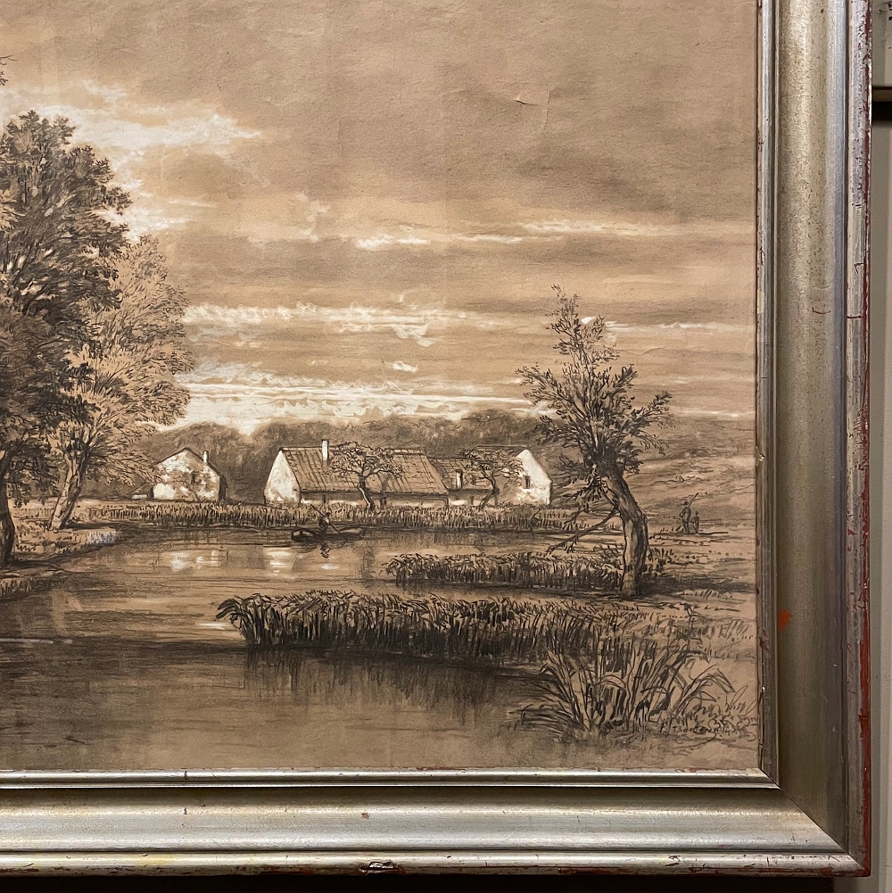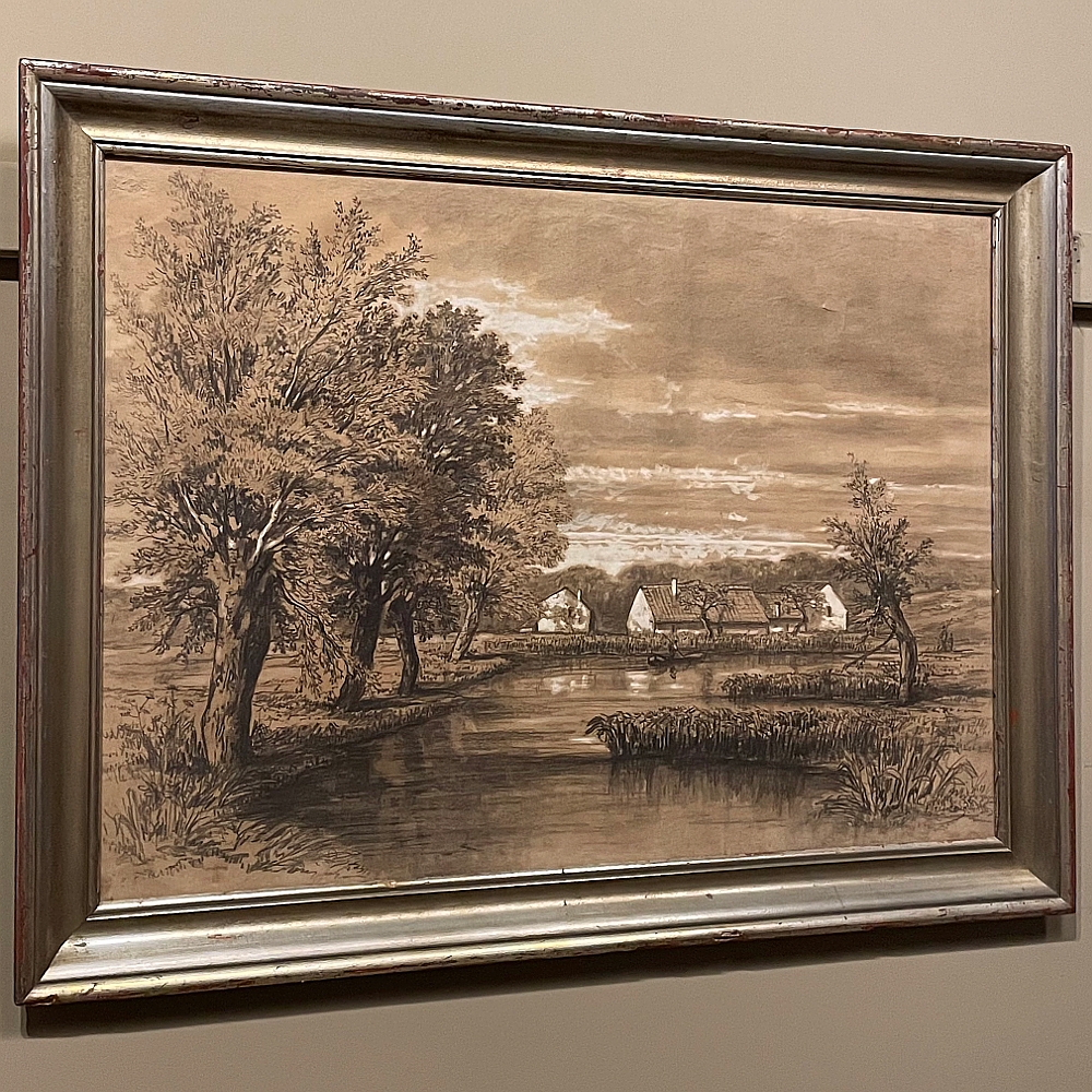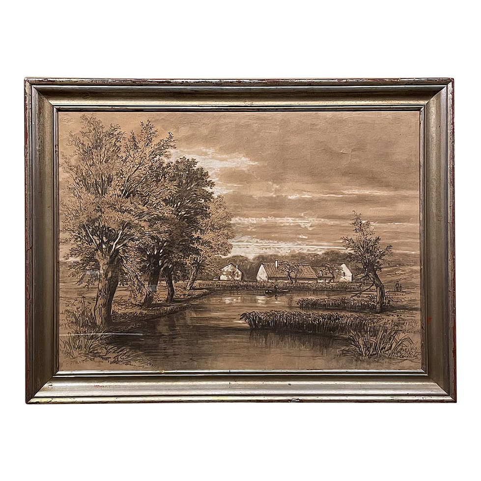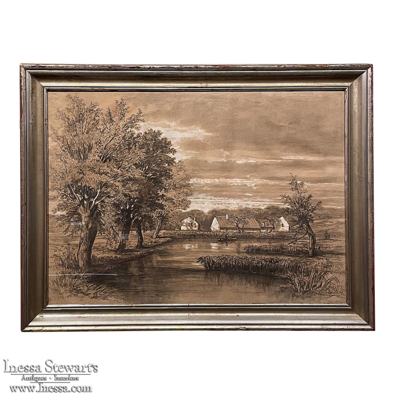 Sale19th Century Framed Pastel by Francois Stroobant (1819-1916) is a remarkably well preserved work, thanks to the careful handling over the past century, and the relatively recent reframing with glass. A silvered frame was chosen to accentuate the sepia tones of the work, which depicts a quaint rural scene with a pond acting as an invitation into the scene, beside which a group of quaint cottages have been built. A lone man in a boat can just be seen at the center of the composition. The design features prominent sycamore trees that have sprouted new growth after the traditional severe pruning that is popular in many places in Europe. The sycamores dominate the left side of the work, contrasting with the new sapling on the right side, with even the cloudy sky seeming to flow in the direction of the younger tree.