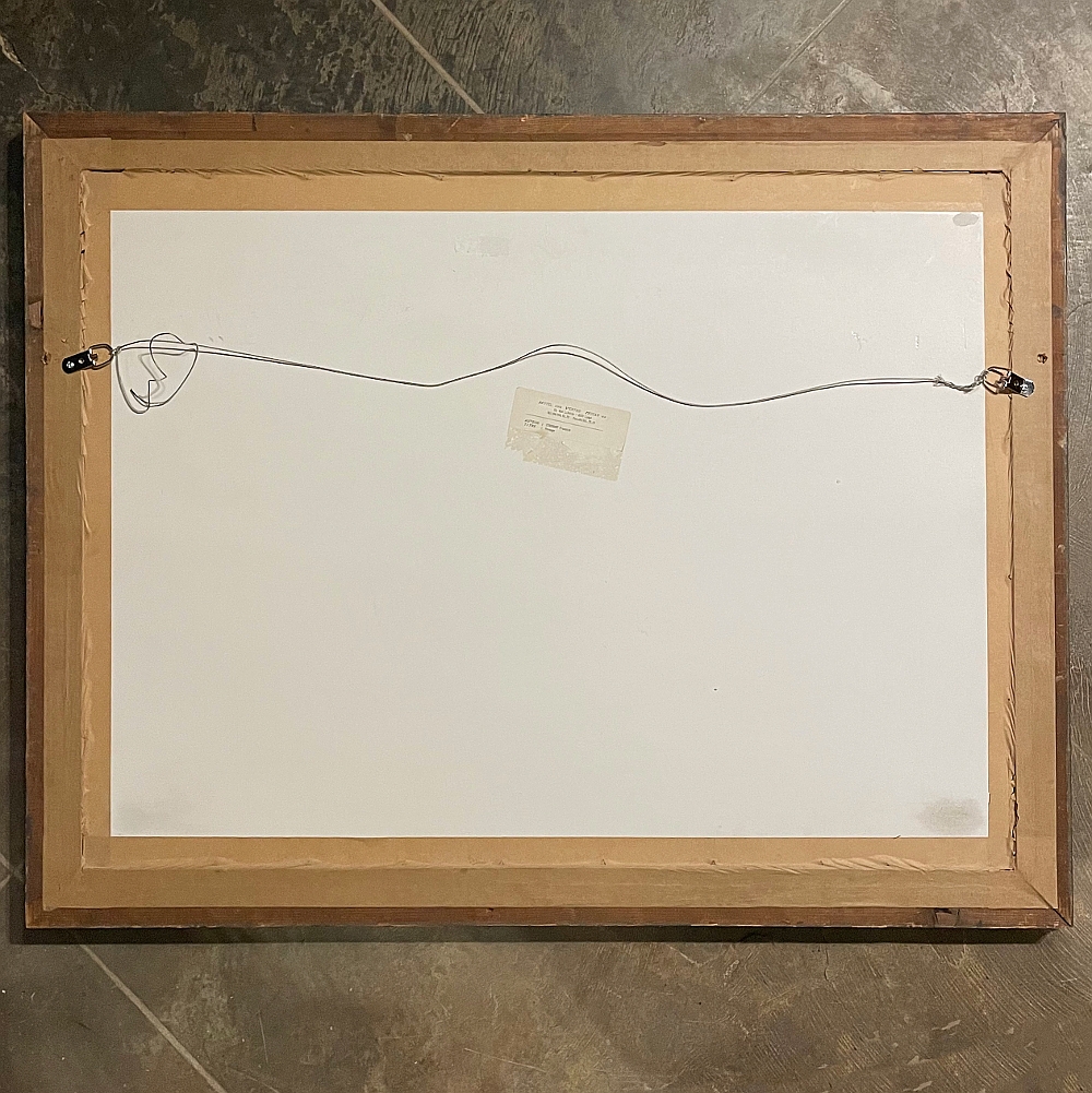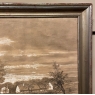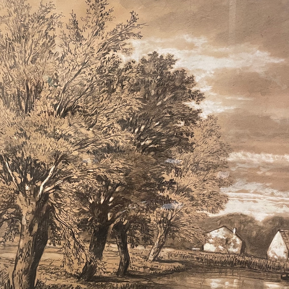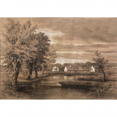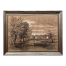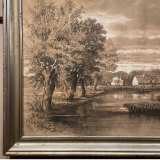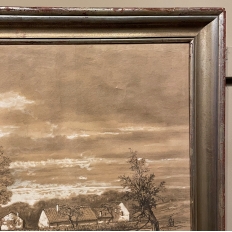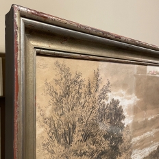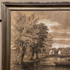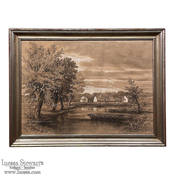 Sale19th Century Framed Pastel by Francois Stroobant (1819-1916) is a remarkably well preserved work, thanks to the careful handling over the past century, and the relatively recent reframing with glass. A silvered frame was chosen to accentuate the sepia tones of the work, which depicts a quaint rural scene with a pond acting as an invitation into the scene, beside which a group of quaint cottages have been built. A lone man in a boat can just be seen at the center of the composition. The design features prominent sycamore trees that have sprouted new growth after the traditional severe pruning that is popular in many places in Europe. The sycamores dominate the left side of the work, contrasting with the new sapling on the right side, with even the cloudy sky seeming to flow in the direction of the younger tree.