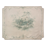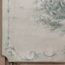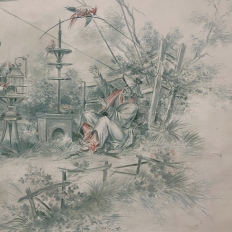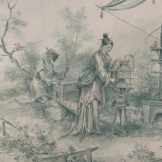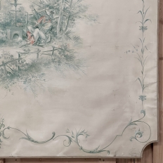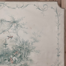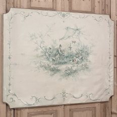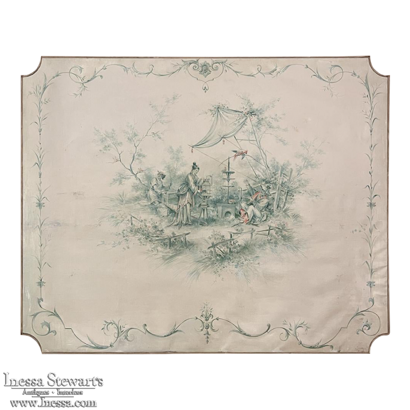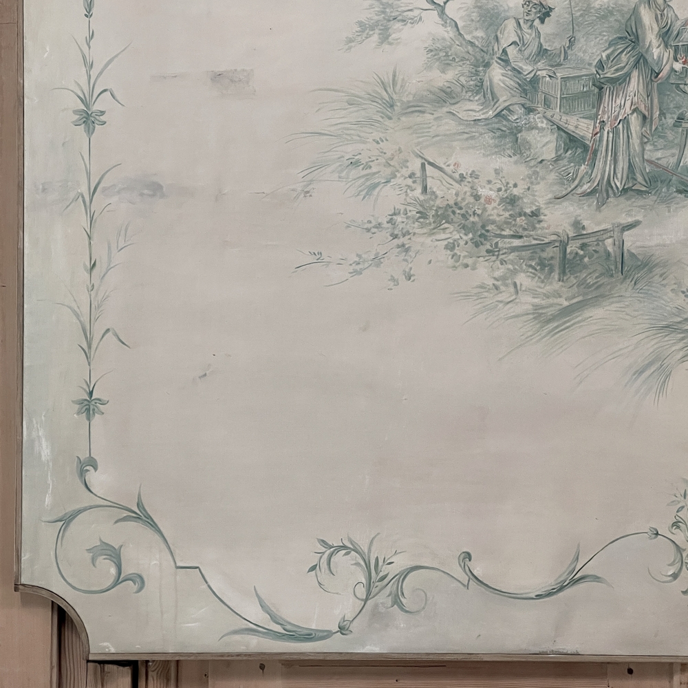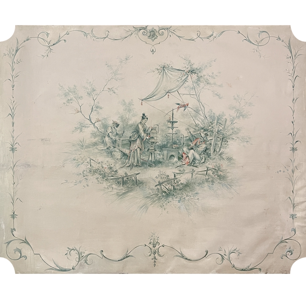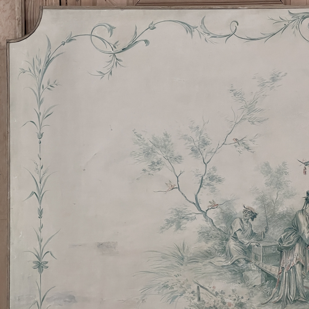 Sale19th Century French Chinoiserie Hand-Painted Panel on Canvas was originally a decorative panel in a lavish home, resurrected and newly stretched and framed by our expert in-house staff! The scene was inspired by the European fascination with all things Oriental which reached a peak during the Belle Epoque. Depicting a delightful courtyard scene with the figures interacting with birds and enjoying a Spring day, it was executed in two colors, primarily a forest green of varying hues. A delightful French foliate border appears around the entire perimeter for added visual appeal.