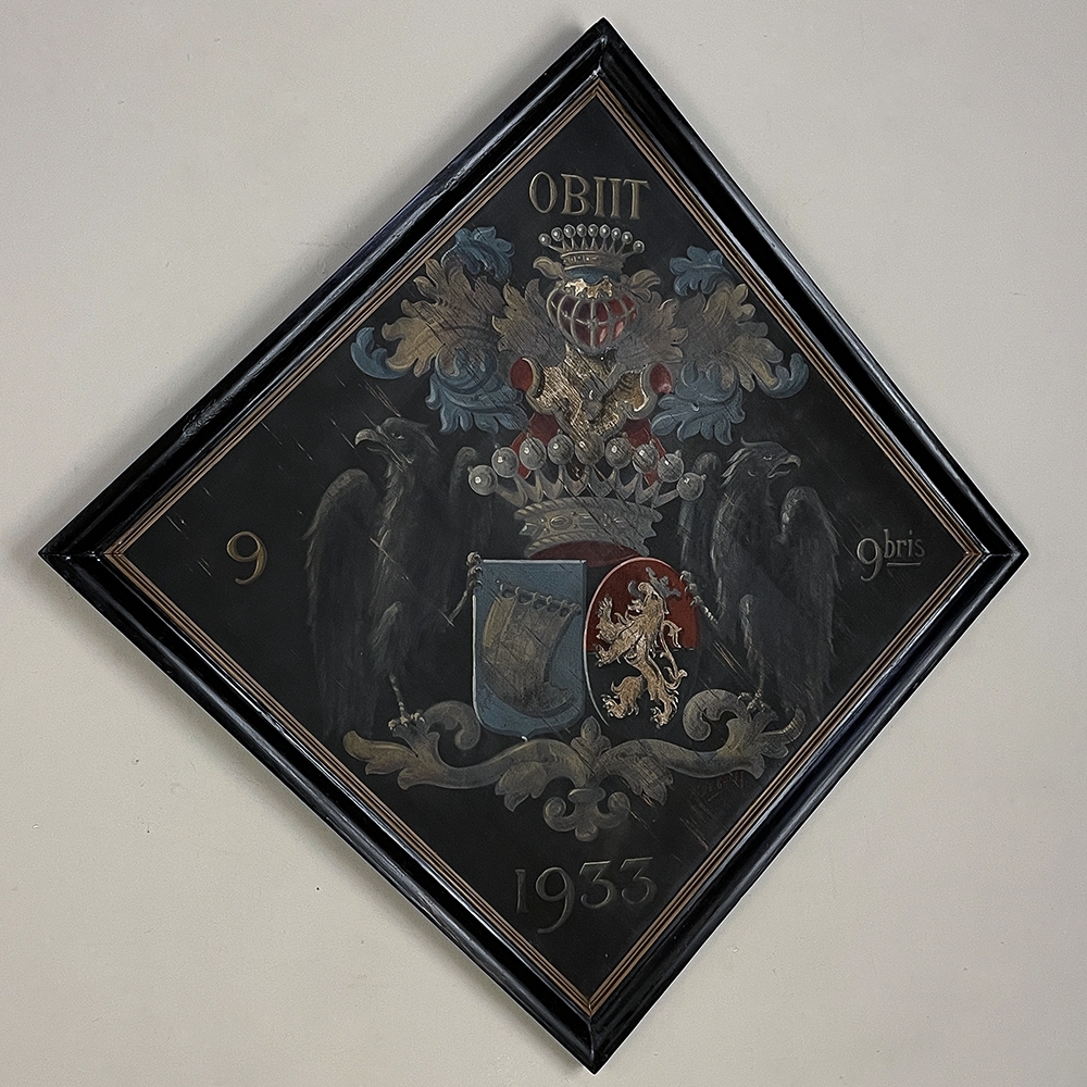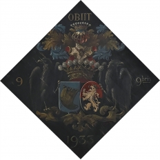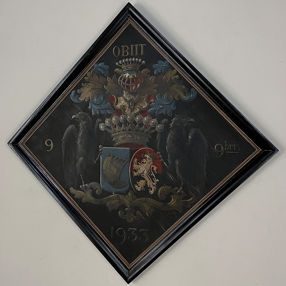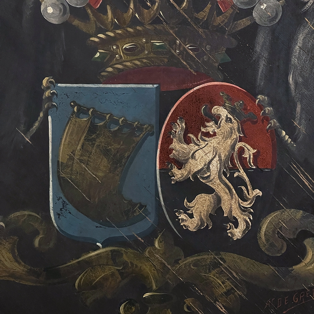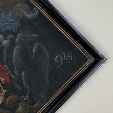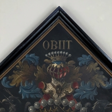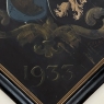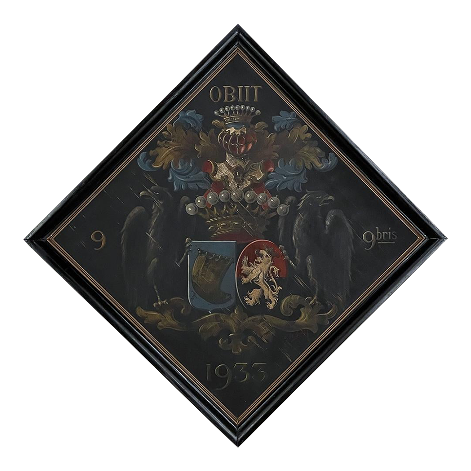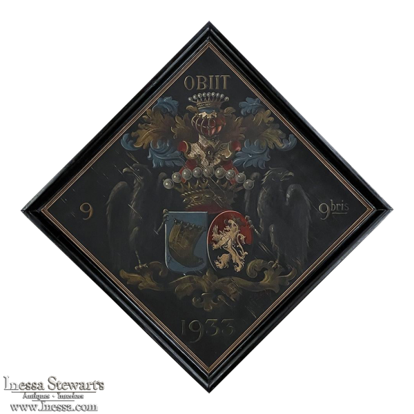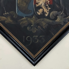 Antique Framed Coat of Arms Plaque is an interesting artifact that will make a splendid decorative touch to any masculine decor. Such memorials were produced to honor the passing of a notable member of a guild or prominent member of a particular community. This work indicates noble lineage, indicated by the crown, knight's helmet, and pair of emblematic symbols including a banner and lion. The date of the commemoration is translated as the 9th of November, 1933 which is the date this work was produced by the artist signed A. DeGreef. Survives in its original simply molded frame with gold highlighting.