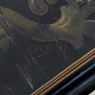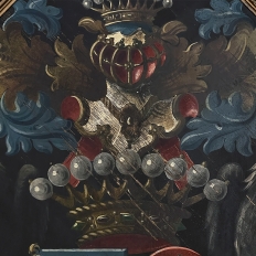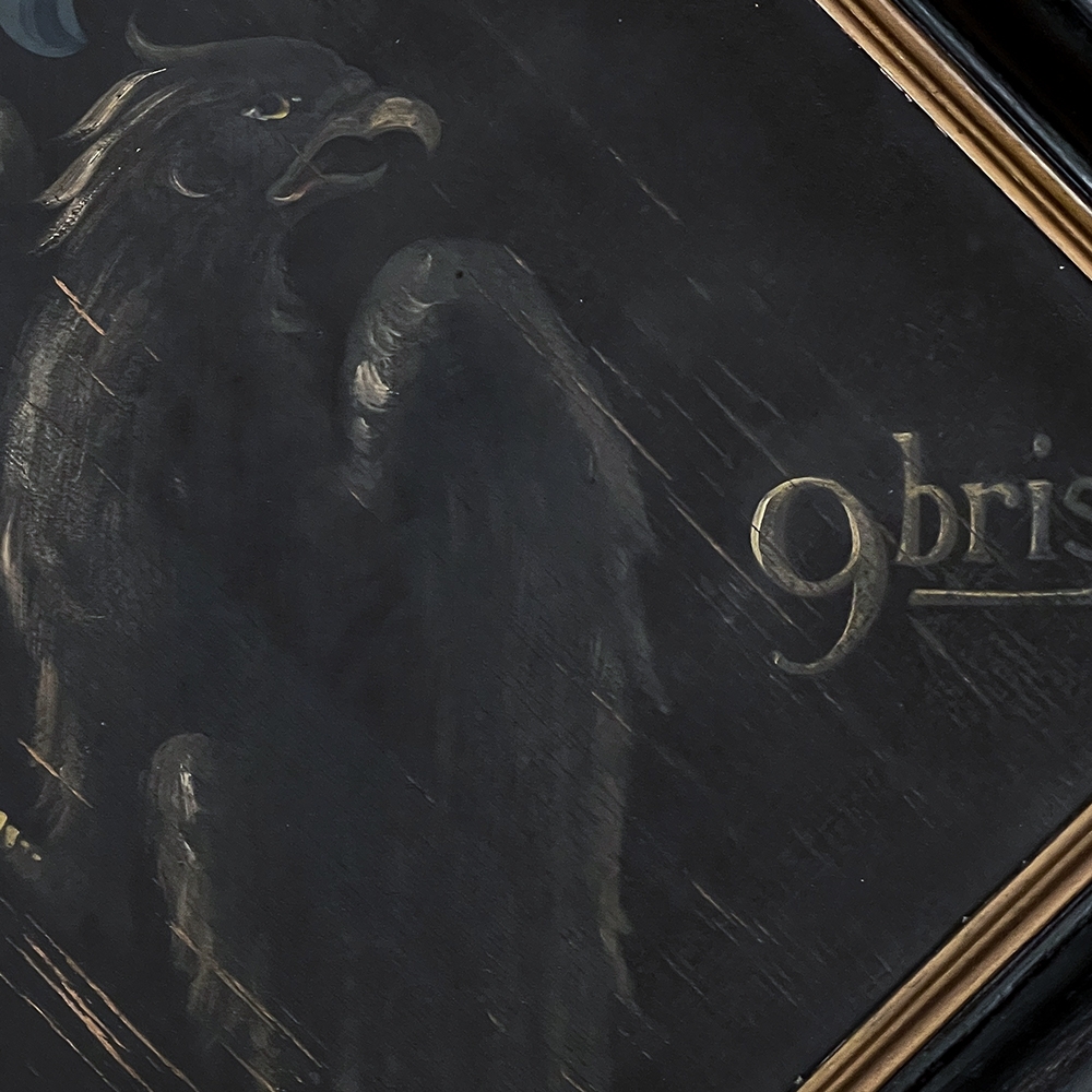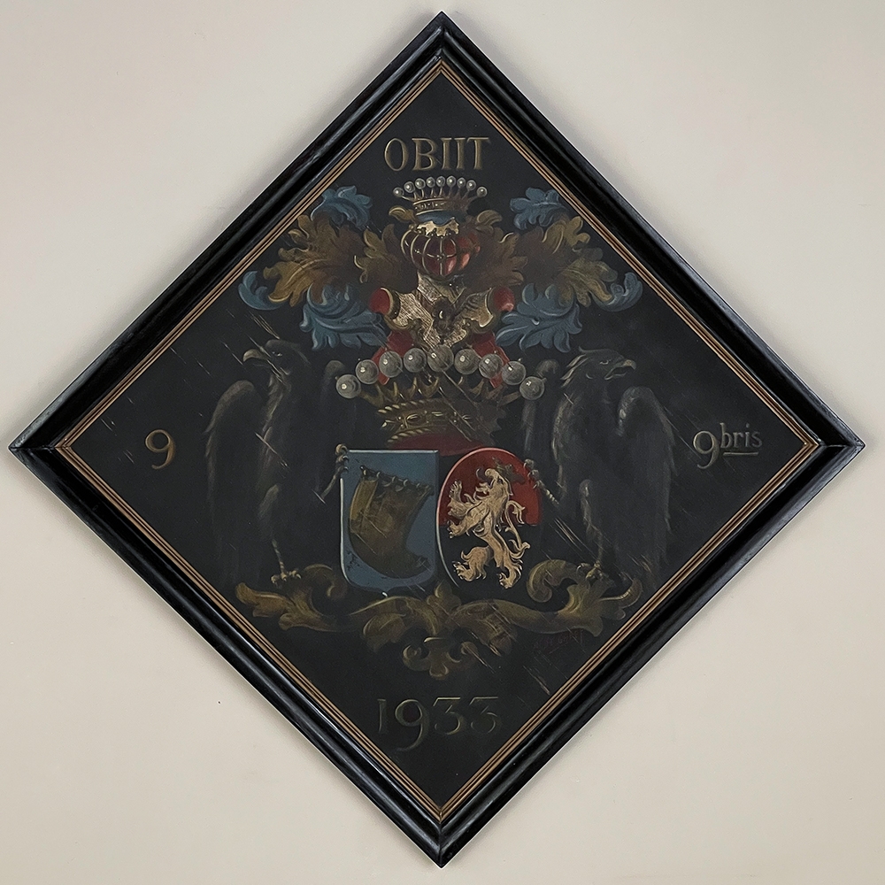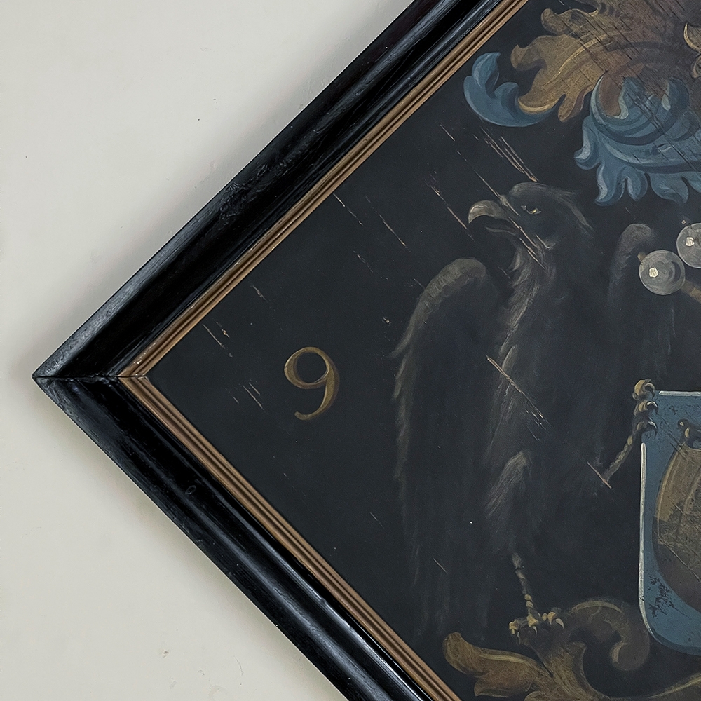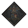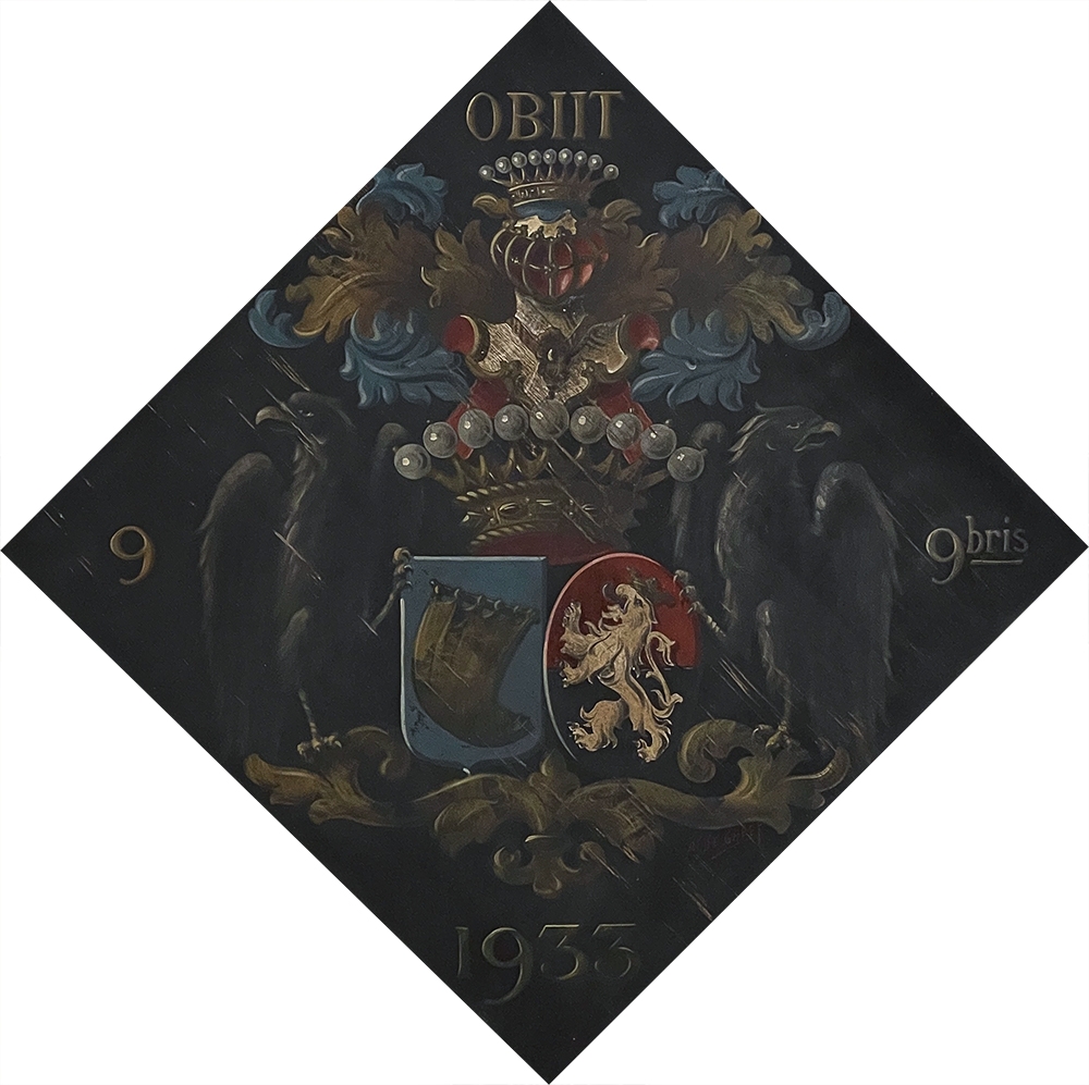 Antique Framed Coat of Arms Plaque is an interesting artifact that will make a splendid decorative touch to any masculine decor. Such memorials were produced to honor the passing of a notable member of a guild or prominent member of a particular community. This work indicates noble lineage, indicated by the crown, knight's helmet, and pair of emblematic symbols including a banner and lion. The date of the commemoration is translated as the 9th of November, 1933 which is the date this work was produced by the artist signed A. DeGreef. Survives in its original simply molded frame with gold highlighting.