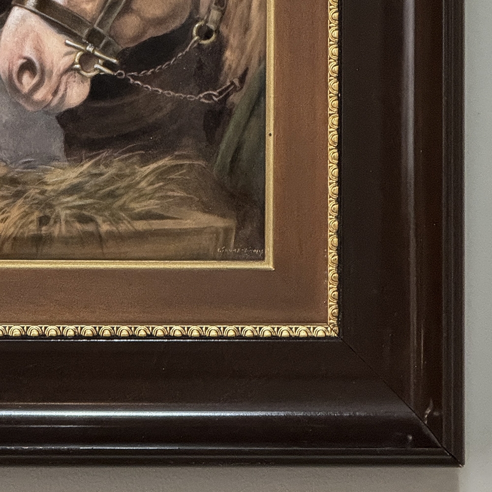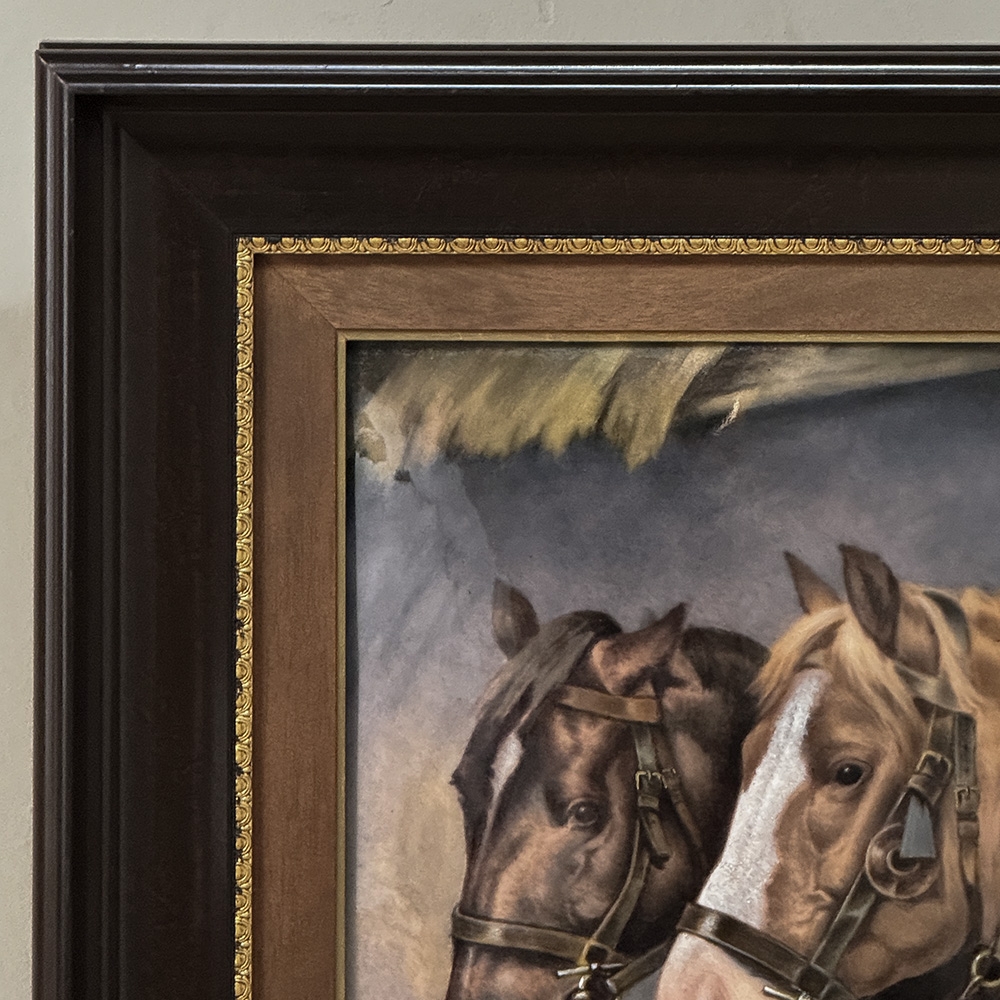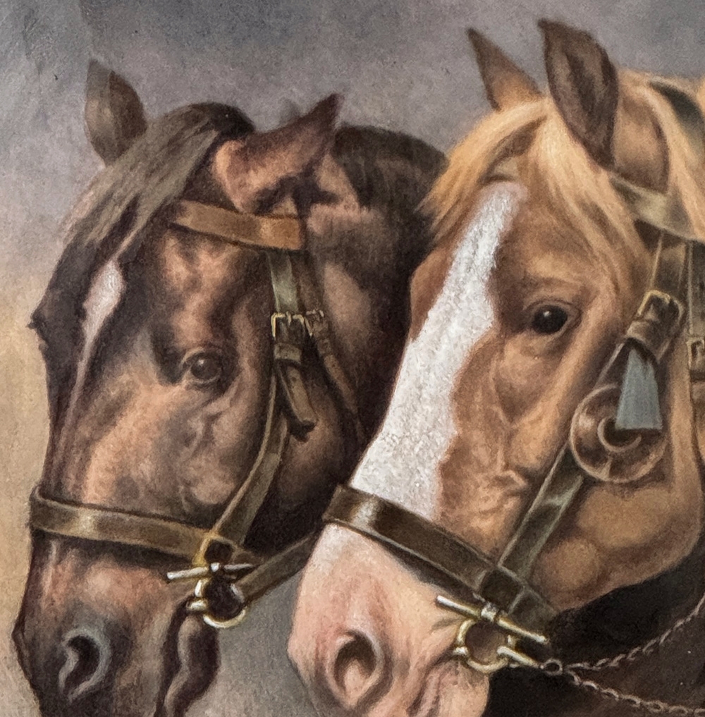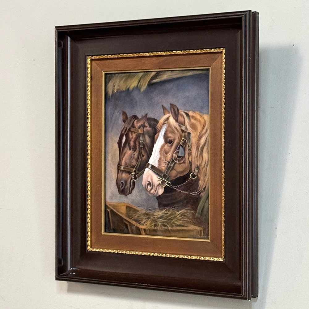 Antique Framed Limoges Porcelain by Camille Faure (1874-1956) 'Stablemates' is a finely executed Limoges porcelain plaque depicting two bridled horses at a feeding trough, signed C. Fauré. The composition is handled with a soft yet deliberate painterly touch, capturing both the quiet strength and gentle temperament of the animals. Subtle tonal transitions and careful modeling bring a sense of life and movement, while maintaining the restraint and refinement characteristic of French decorative art.