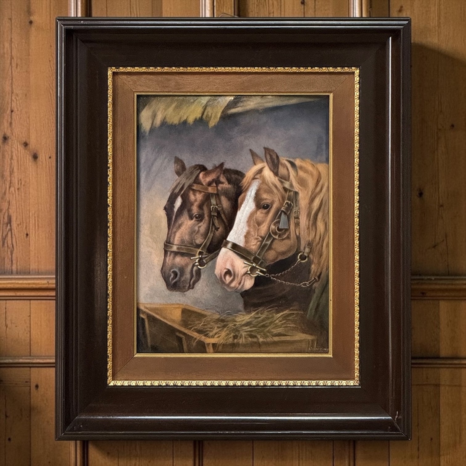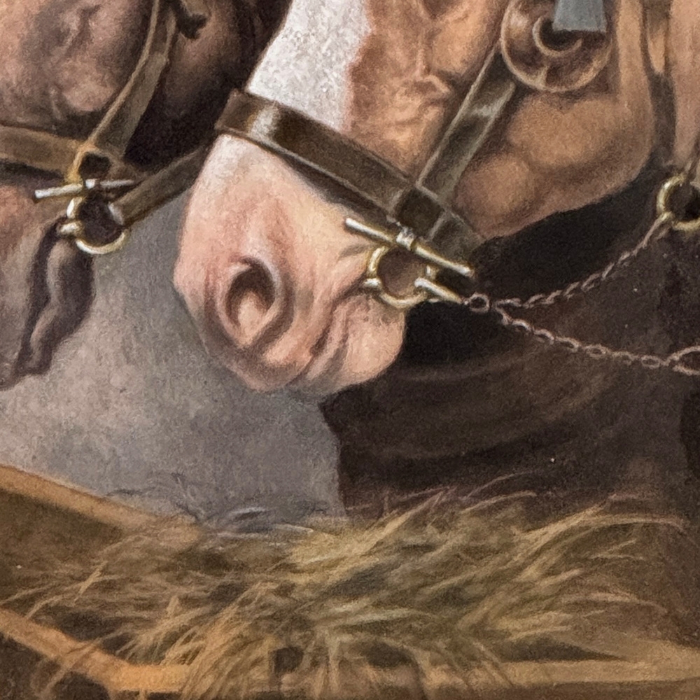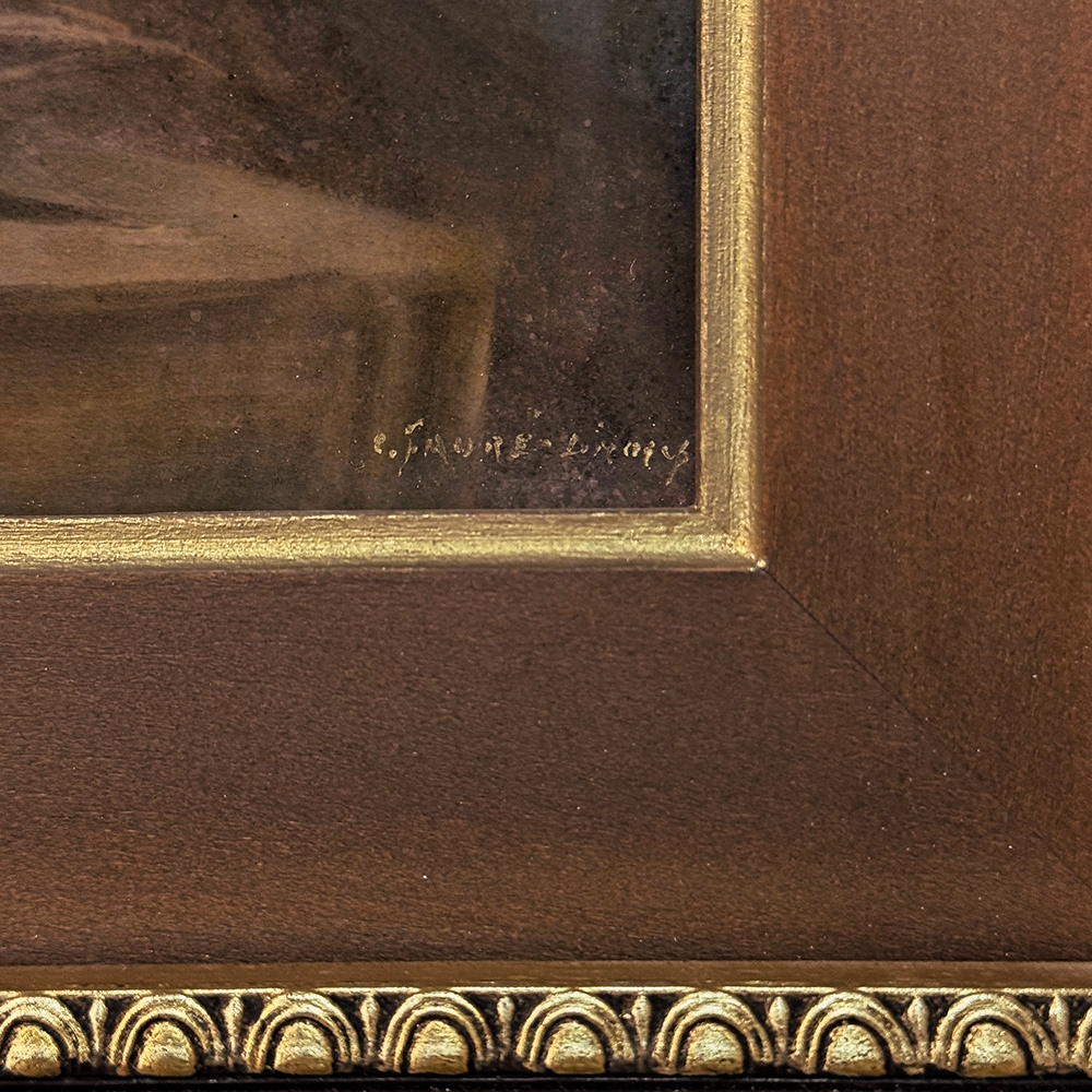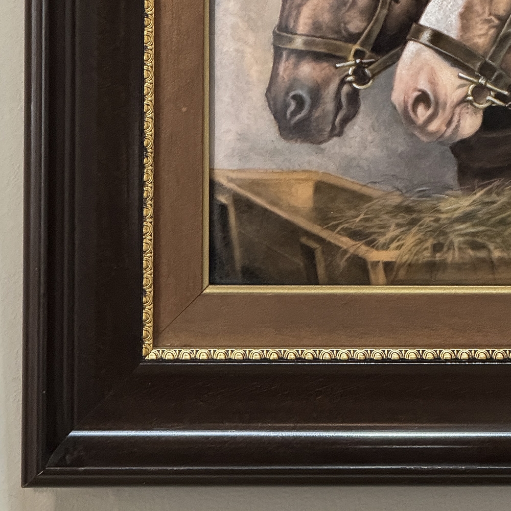 Antique Framed Limoges Porcelain by Camille Faure (1874-1956) 'Stablemates' is a finely executed Limoges porcelain plaque depicting two bridled horses at a feeding trough, signed C. Fauré. The composition is handled with a soft yet deliberate painterly touch, capturing both the quiet strength and gentle temperament of the animals. Subtle tonal transitions and careful modeling bring a sense of life and movement, while maintaining the restraint and refinement characteristic of French decorative art.