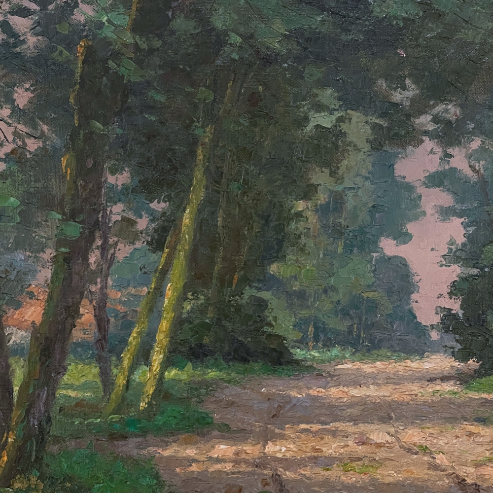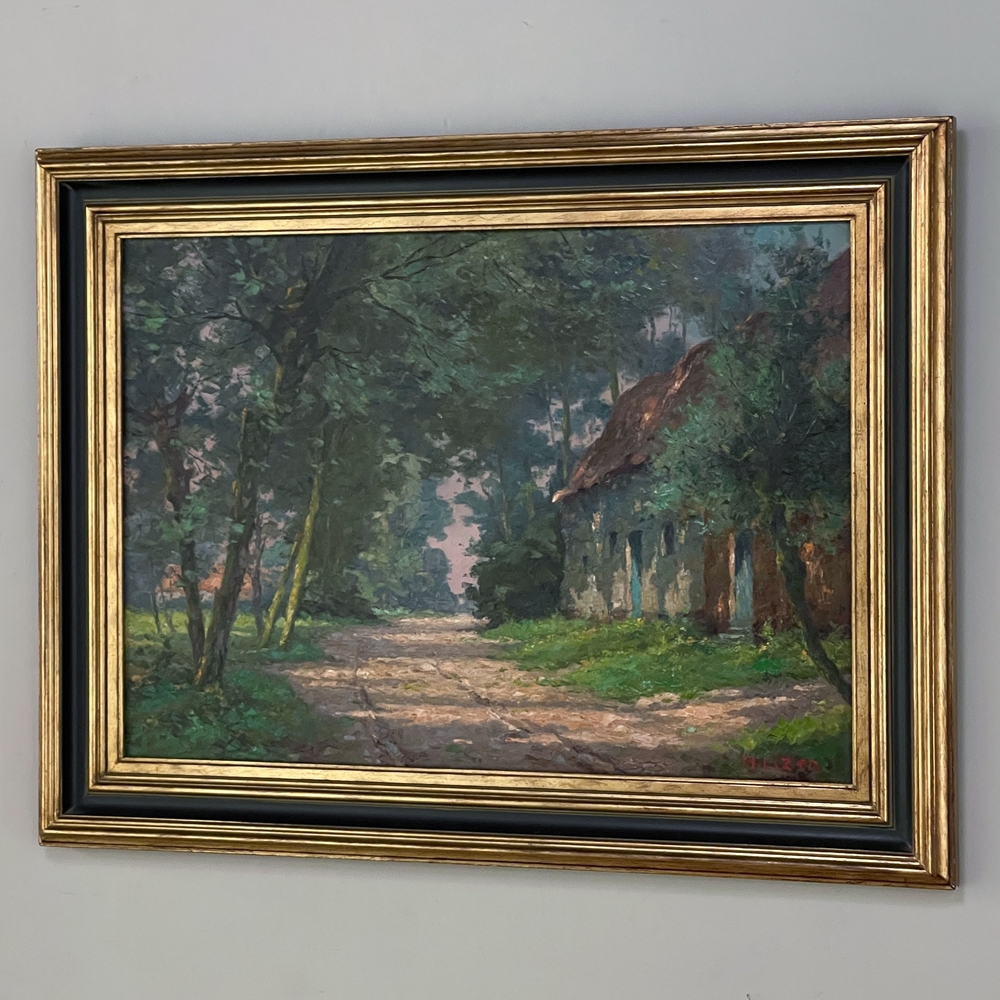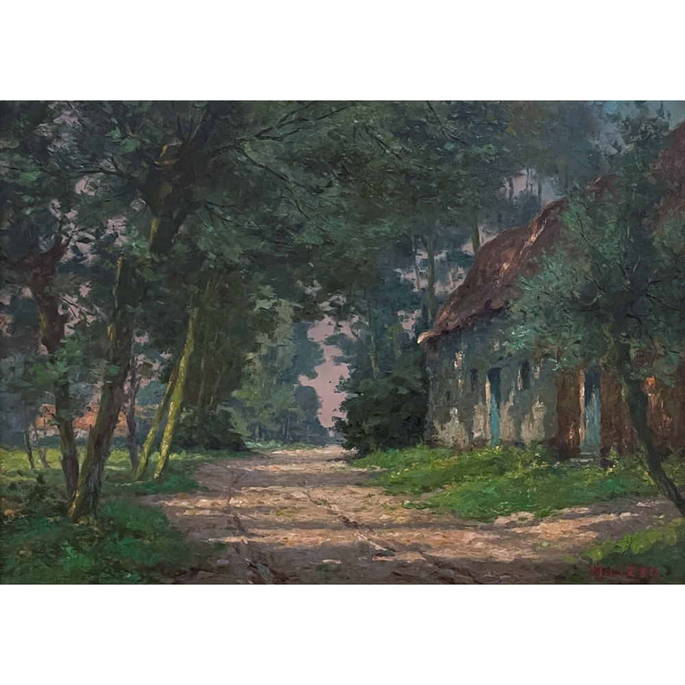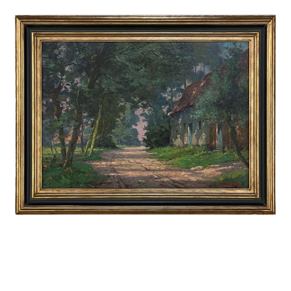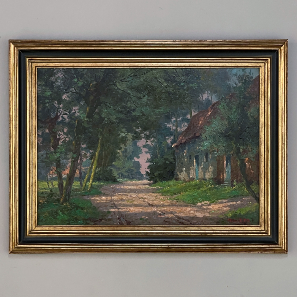 Antique Framed Oil Painting by Marcel Lizen (1887-1946) is an extraordinary landscape with charming architectural feature depicting an inviting country road that leads by a thatch-roofed cottage nestled amidst the forest. One can see a neighboring cottage in the distance, with late afternoon shadows providing an interesting lighting effect. Survives in its original frame.