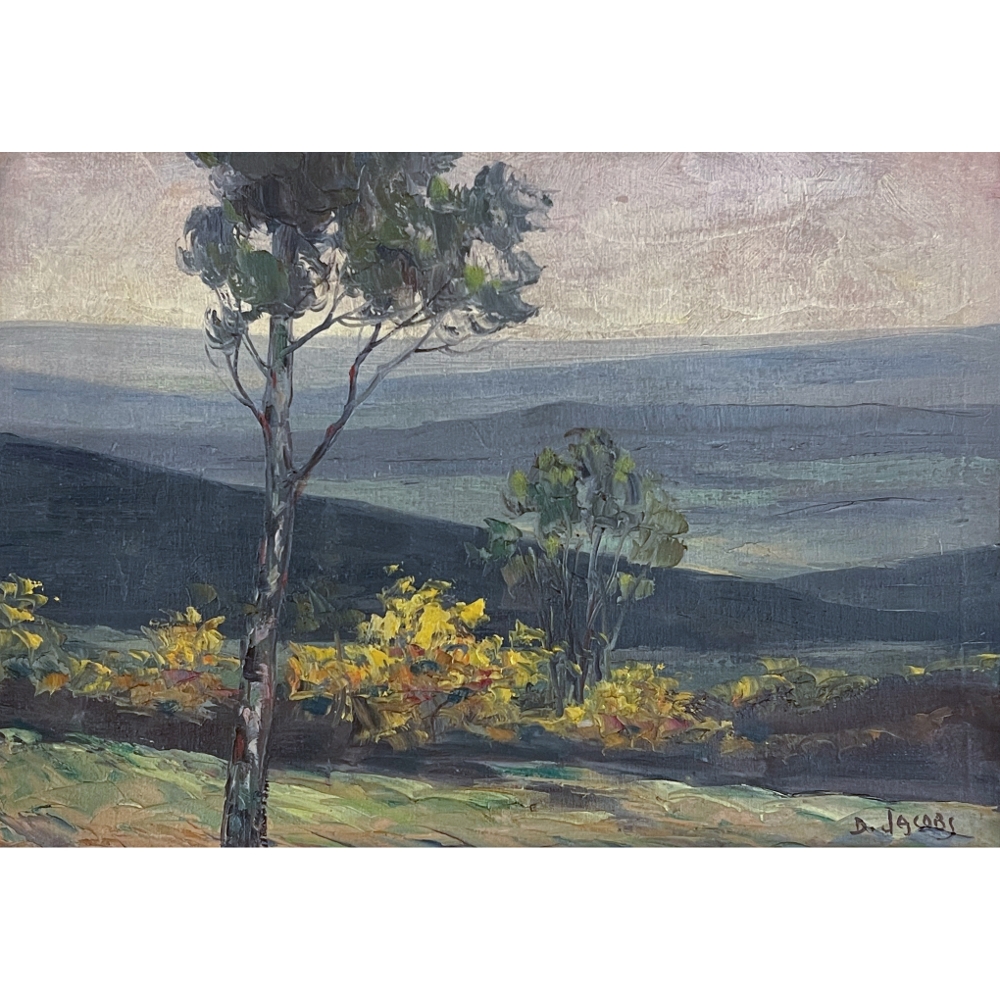 A quietly evocative landscape by Belgian painter Dieudonné Jacobs, Les Genêts captures the gentle beauty of the countryside as daylight begins to soften into evening. In the foreground, a graceful tree rises against rolling hills and a luminous sky, while strokes of warm golden color suggest broom in bloom, bringing life and warmth to the tranquil vista. The composition has a hushed, poetic quality, with shifting light and subtle atmosphere lending the scene remarkable depth and calm.