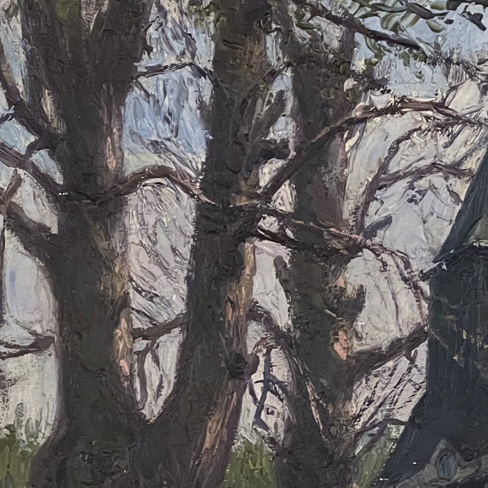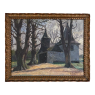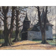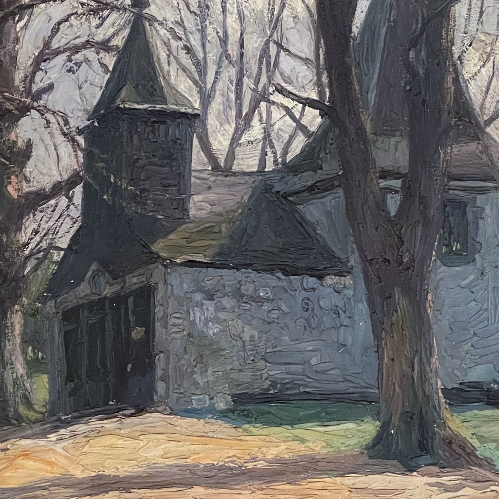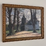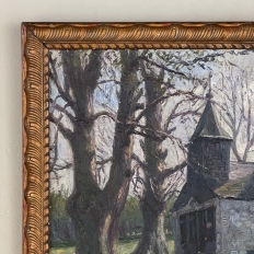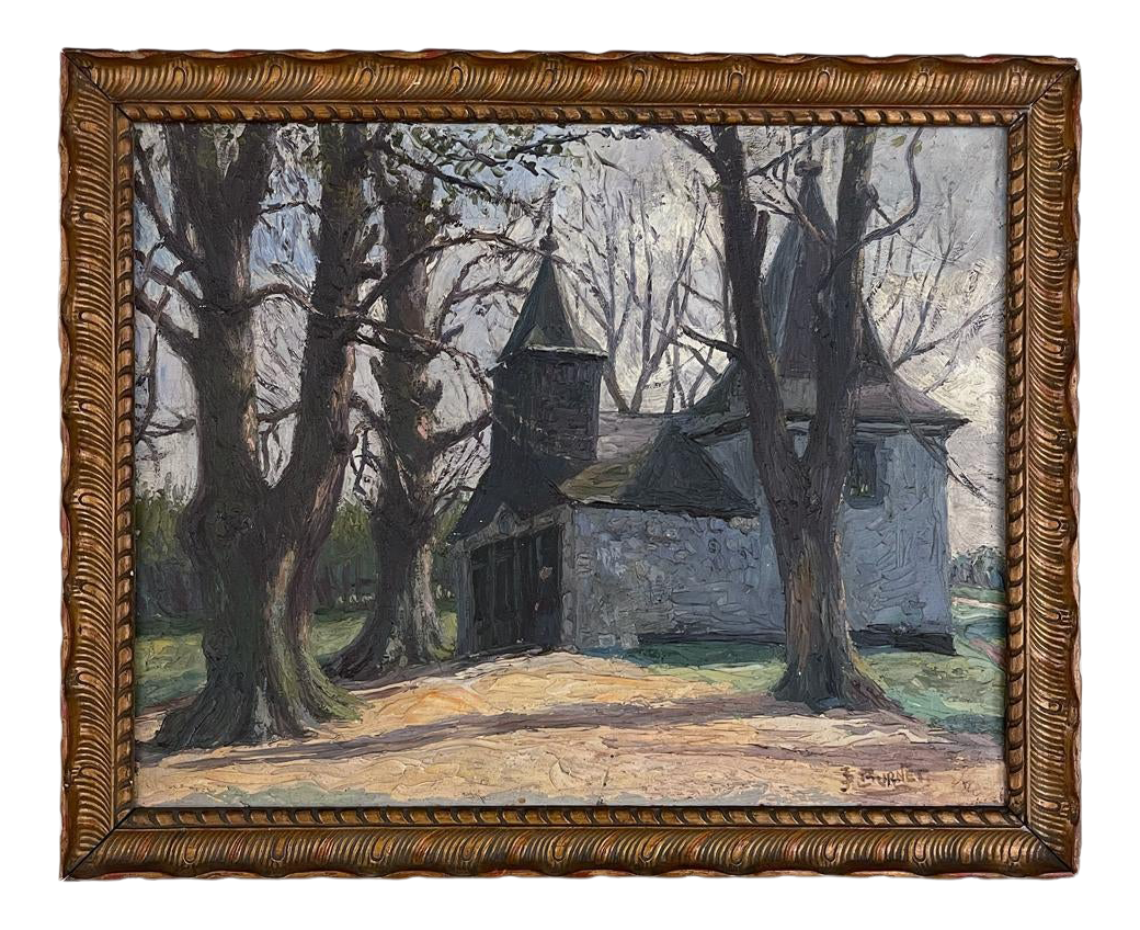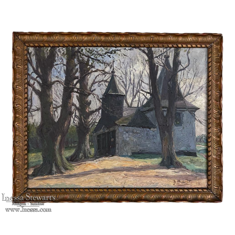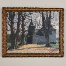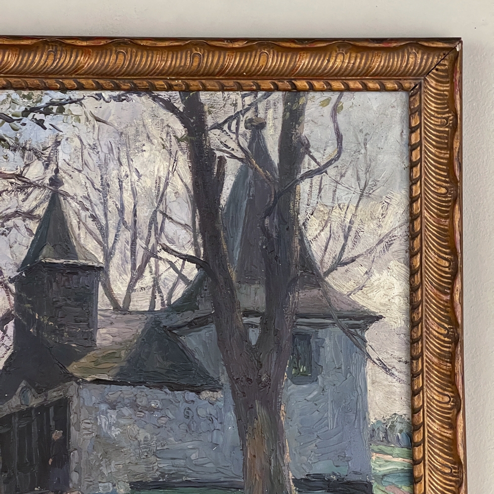 Antique Framed Oil Painting on Board by J S Burnet depicts an elegant manoir in the forest, most likely a hunting lodge or second home for an affluent family. Such homes were opulent in their own right, and represented a way for the family to escape the hustle and bustle of the urban environment. Utilizing a gray palette, the artist has depicted an early winter scene in the late afternoon with intriguing use of shadows, emphasizing the strong architecture with heavy brush and spatula strokes on the board. Survives in its original hand-carved gold-painted frame which adds just the right amount of patinaed color to set the work off.