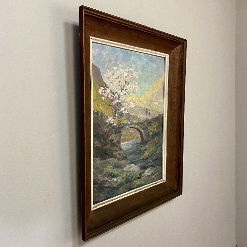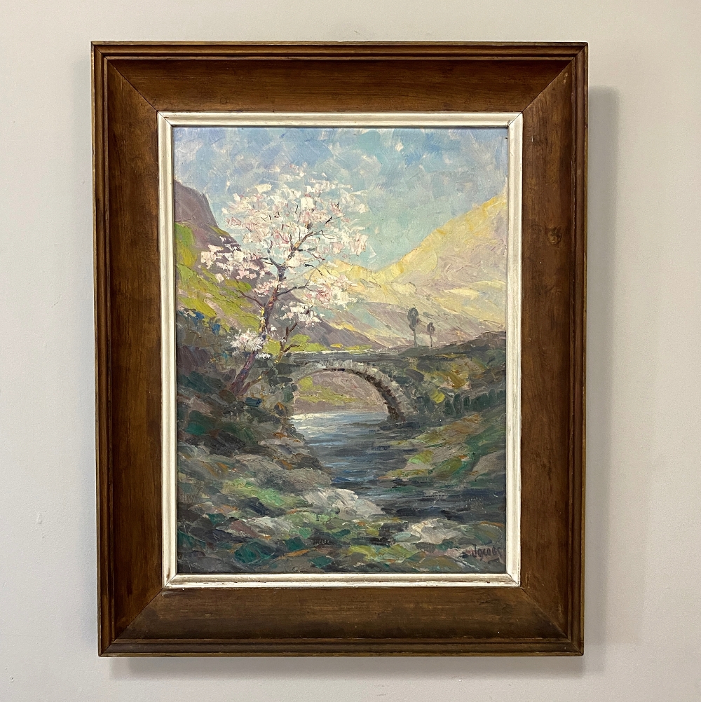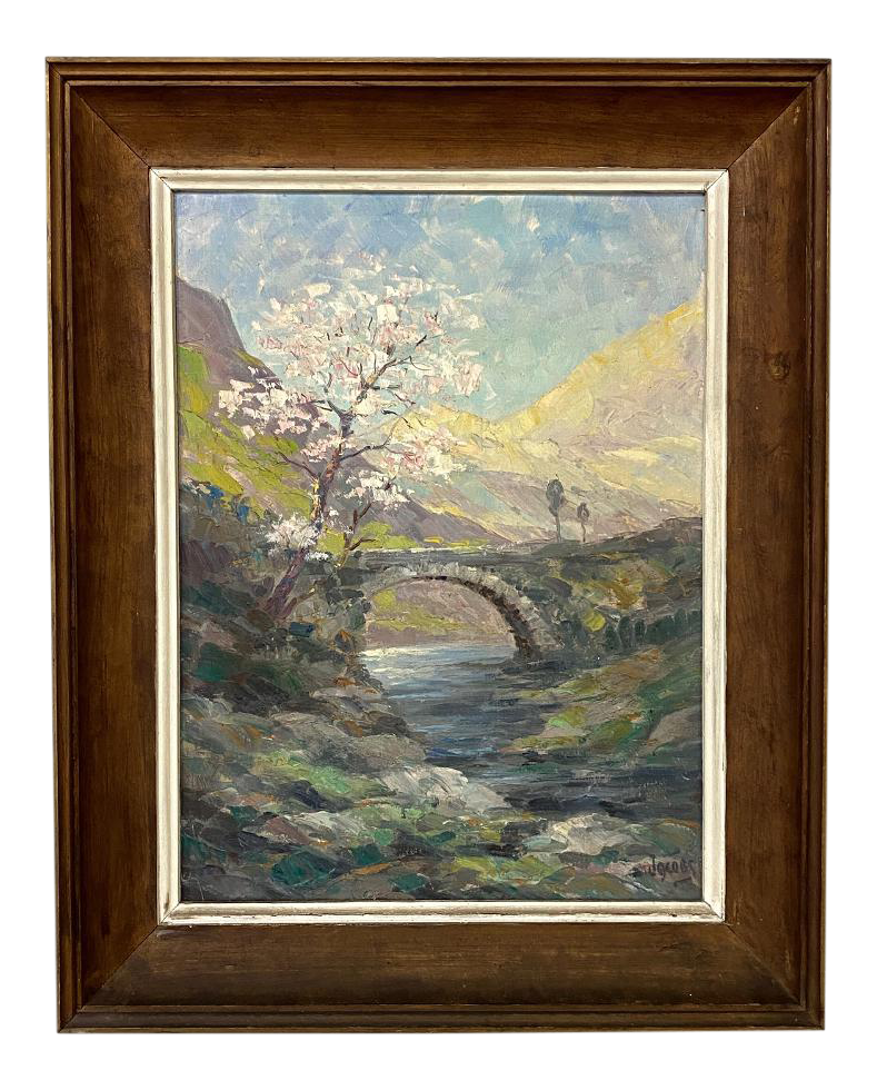 Antique Framed Oil Painting on Canvas by Dieudonne Jacobs (1887-1967) is a delightful work in pastel hues depicting a lovely springtime scene of a stone bridge over a babbling brook. Dieudonne Jacobs (1887-1967) was born in Liège and spent his life as an artist between the Belgian Ardennes and the French Riviera, especially between Spa and La Garde (present day Toulon). He studied at the Royal Academy of Fine Arts in Liège, and became known for his inimitable impressionistic style. The bridge captivates center of attention in the composition, but is extraordinarily enhanced by the blooming tree, most probably a dogwood. Note the artist's deft use of color in the immediate foreground as contrasted with the subtle hues of the distant mountains in the background. Survives in its original frame.