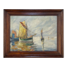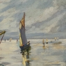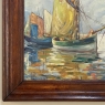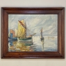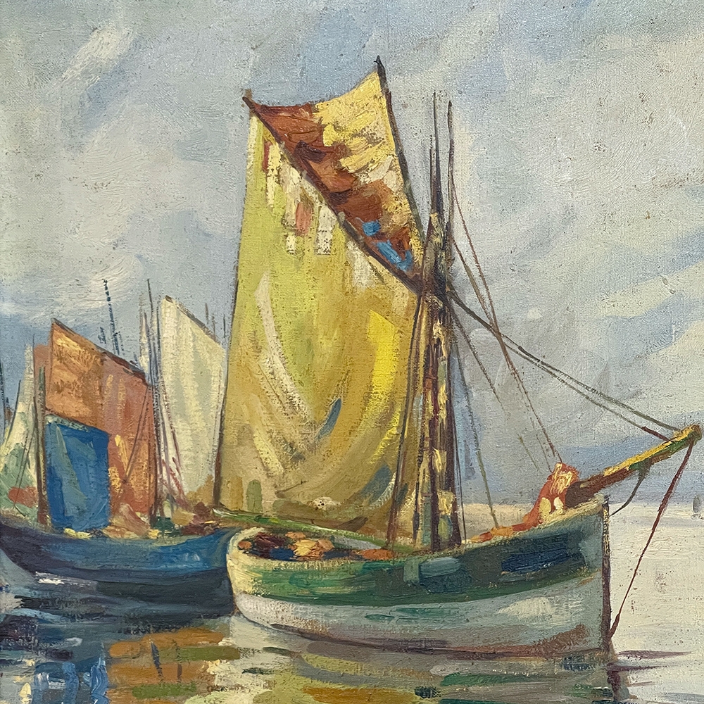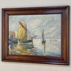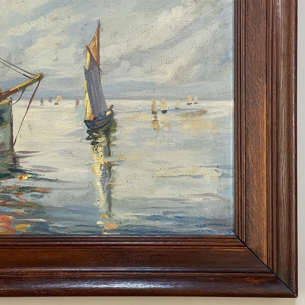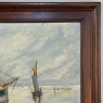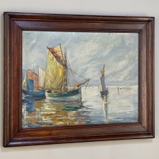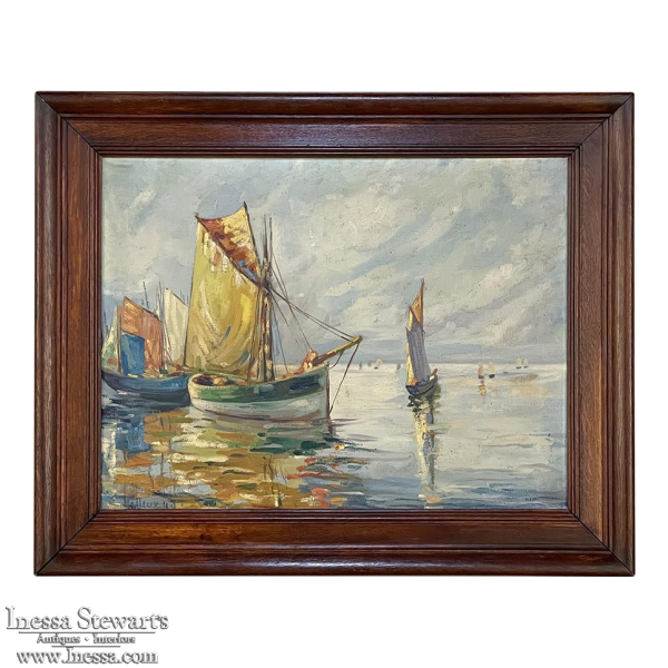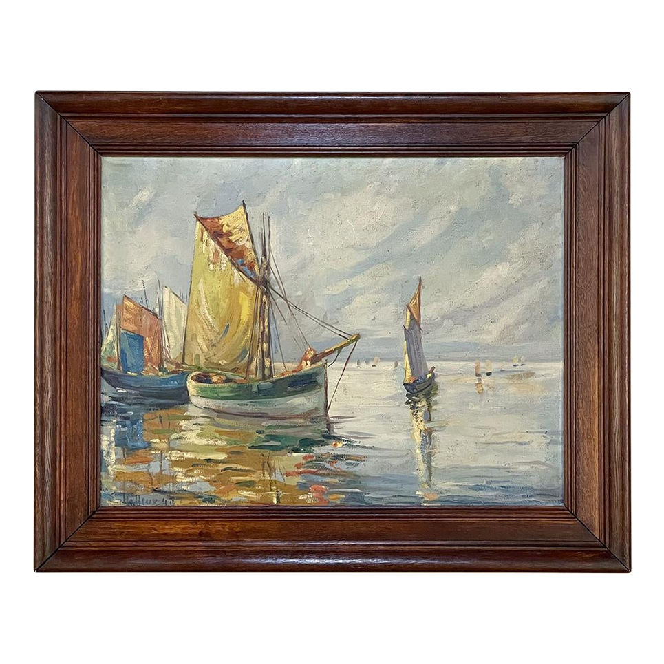 Antique Framed Oil Painting on Canvas by E. Halleux dated 1940 captures the timeless scene of a village's fishing fleet venturing out of the harbor in search of the day's catch. Halleux has captured a particularly calm morning with barely enough wind to move the gaff-rigged sloops and cutters to the outer banks. The wind-swept clouds above show a promise of a stronger breeze to come. Halleux has used a relatively monochromatic palette to represent the interface between sky and sea, with a more vibrant palette to contrast the vessels and their sails to create an interesting visual effect. Survives in its original frame.