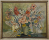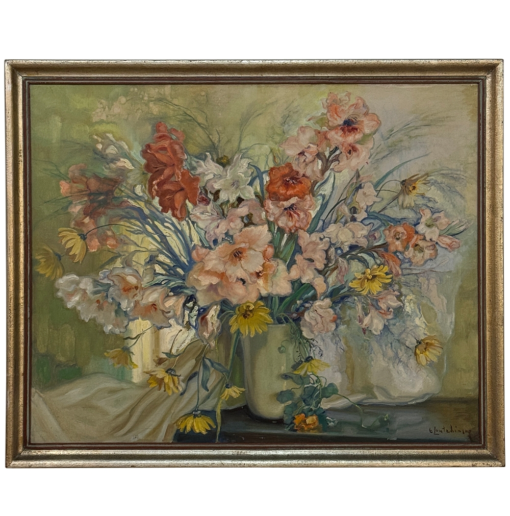 Antique Framed Oil Painting on Canvas by Euphrasia Loutchinsky (1887-1974) is a particularly impressive work showcasing the artist's talents. She spent her life in what was came to be called the Soviet Union, so little can be found about her life there. What we do know is she was incredibly gifted, indeed! This work fills the canvas with a vivid array of colorful blooms in a simple white ceramic vase. a bit of fabric adds even more texture to the work. The still life is an art form attempted by almost all artists, but mastered only by few, one of which is Loutchinsky. Survives in its original giltwood frame.