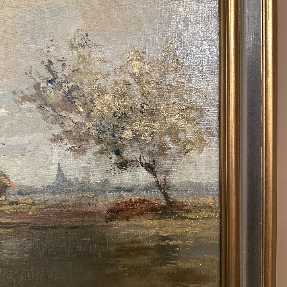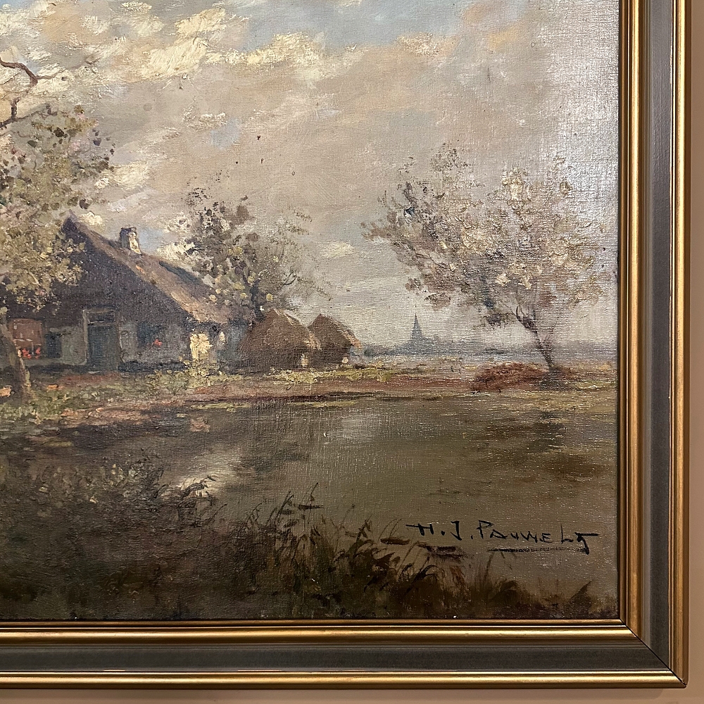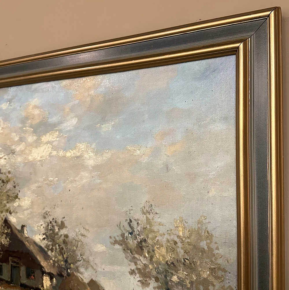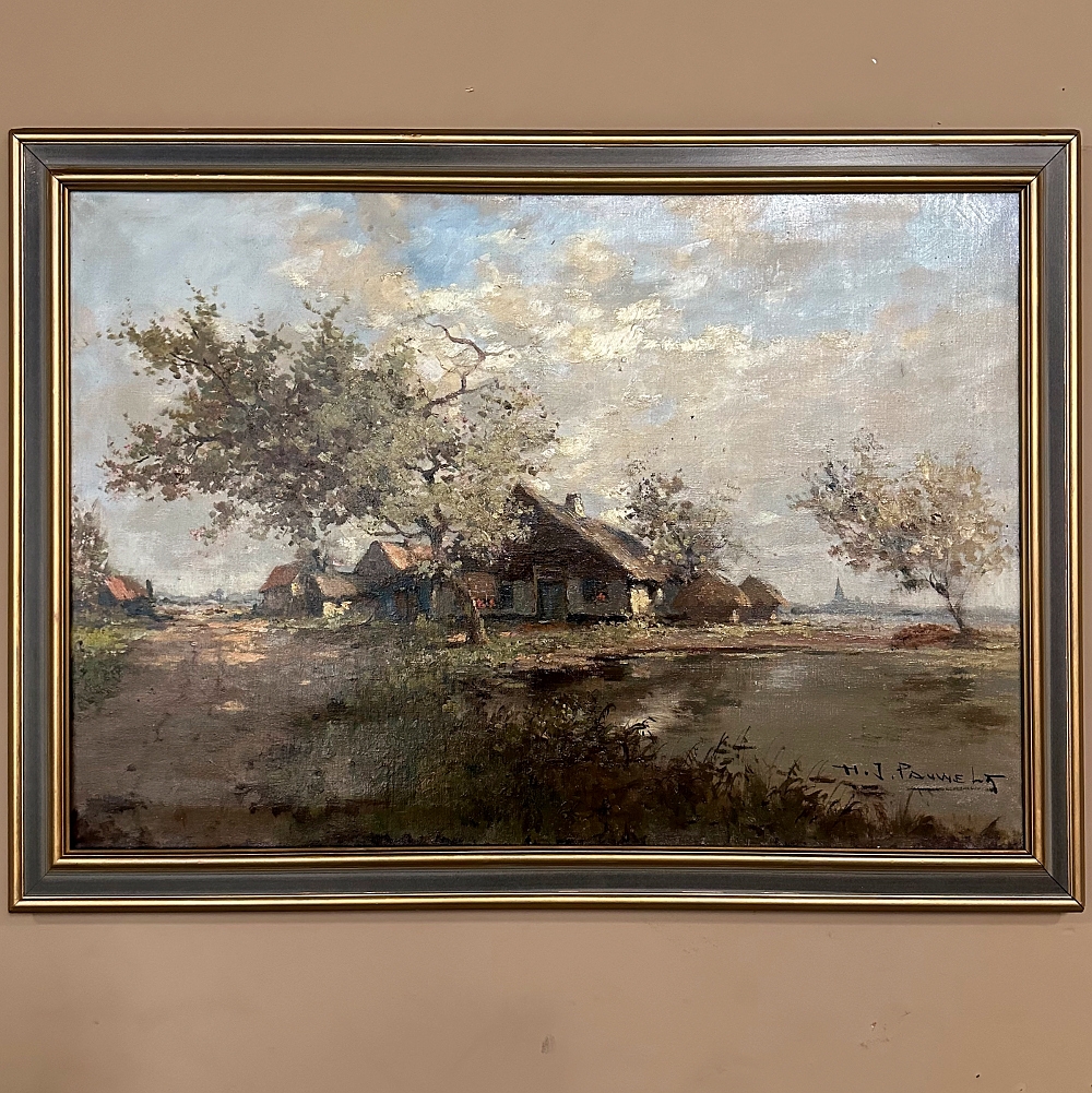 Antique Framed Oil Painting on Canvas by Henri J. Pauwels (1903-1983) is a definitive work of the genre most favored by the artist, depicting the quaint country life in rural Europe. Here we see water, land and sky with vegetation all conspiring to create a backdrop for the thatch-roofed cottage serving as the principal focal point of the composition. Look carefully and you'll see the distant church spire of a nearby village. Survives in its original frame, professionally restored by our expert in-house staff. Henri Joseph Pauwels was born December 16, 1903 in Sleydinge, Belgium. He attended art instruction in Parisienne academia, immersed in the techniques of the French Impressionists and masters. He is famous for his landscapes and depictions of rural life, using a subtly muted earth tone palette, preferring to paint outdoors and on location. His works are widely distributed across northern Europe including Paris, Brussels and Amsterdam, especially featured in Le Musee de Gand.