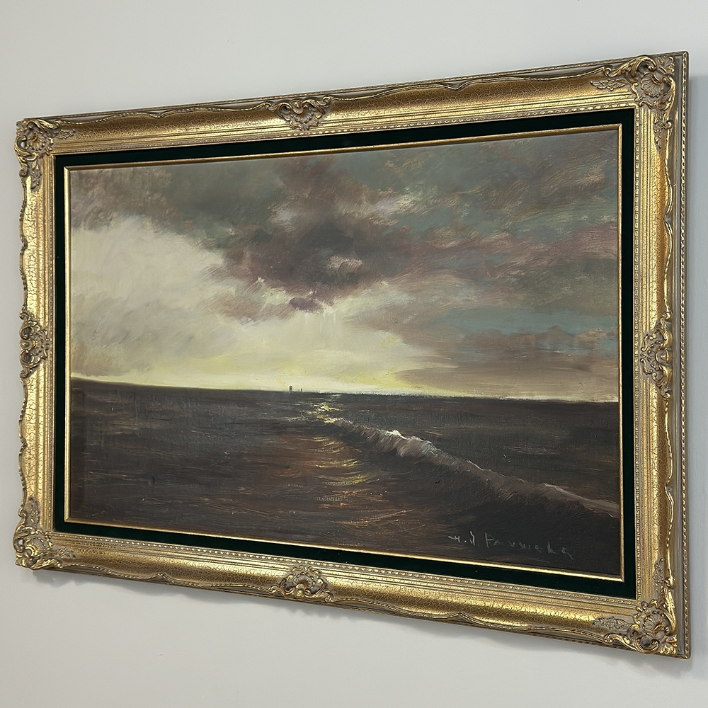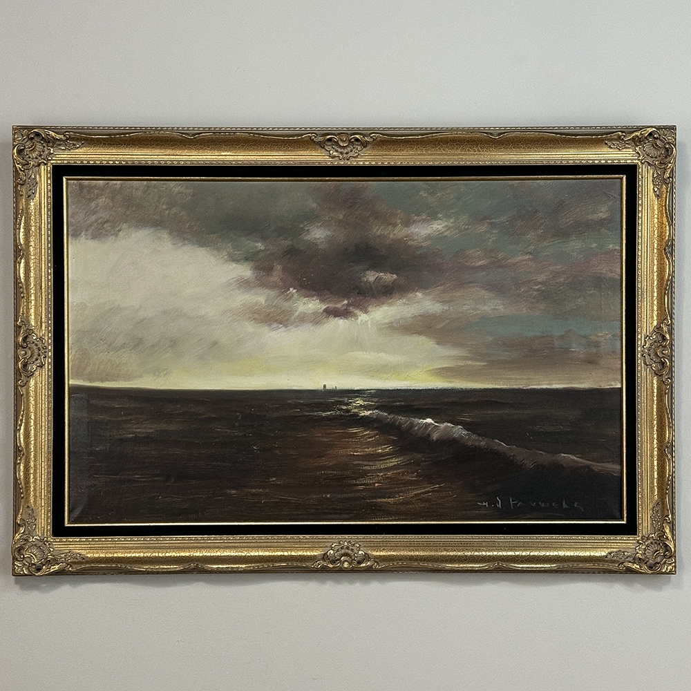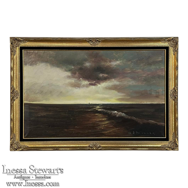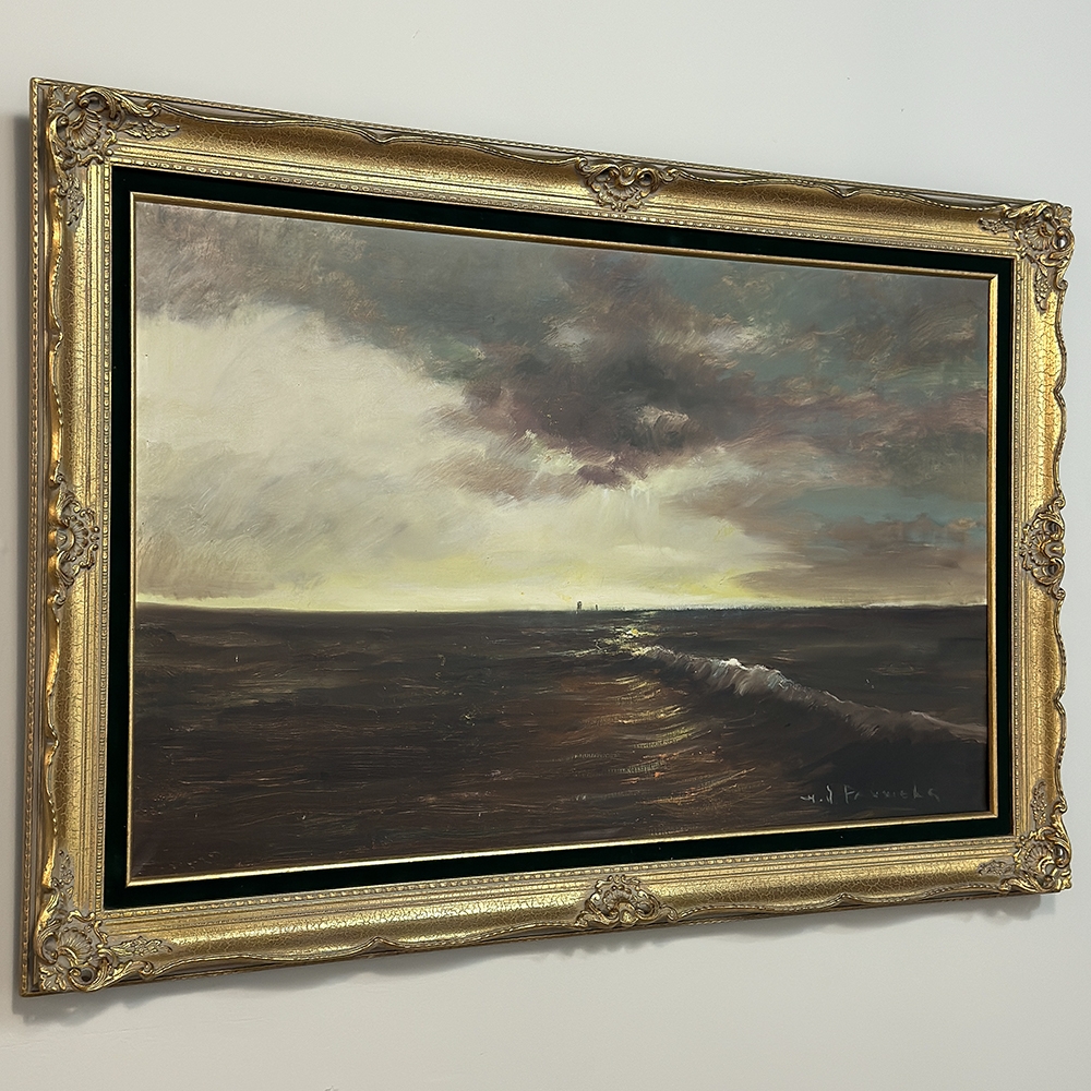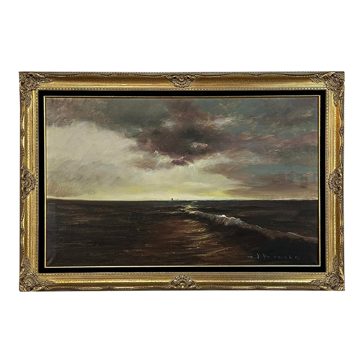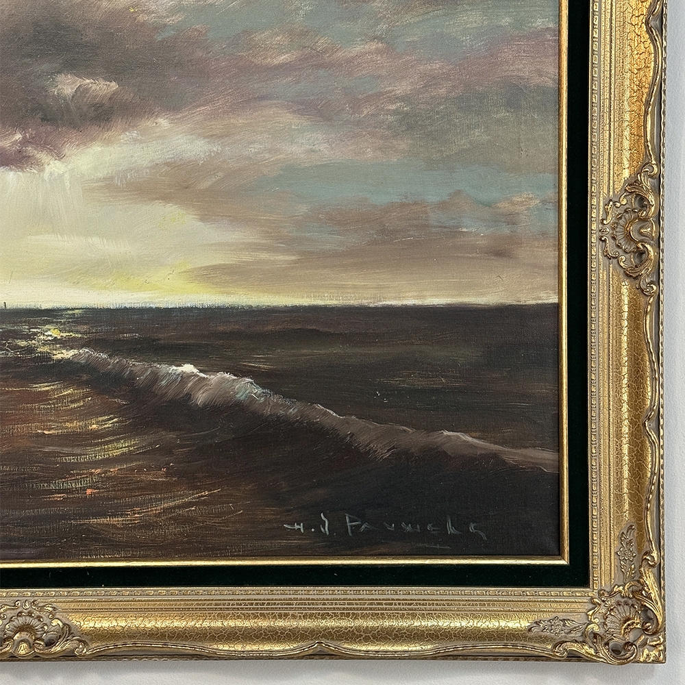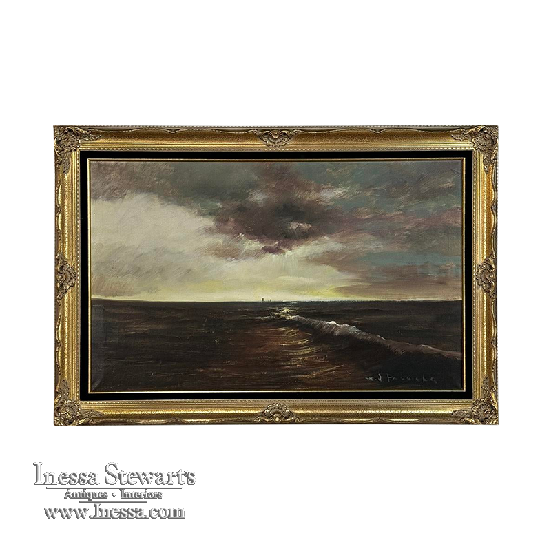 Antique Framed Oil Painting on Canvas by Henri Joseph Pauwels (1903-1983) is an intriguing work by the celebrated and prolific artist who is one of Belgium's favorite sons. The interesting palette appears to depict a sunset at sea with a small yet rogue wave and just the hint of structures in a seaside village in the distance. A foreboding sky hints at a little weather to come. Renowned for his landscapes and depictions of the simple country life, Pauwels experimented with a wide variety of genres, and has successfully attracted our attentions with this extraordinary work which resides in its original frame.