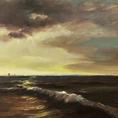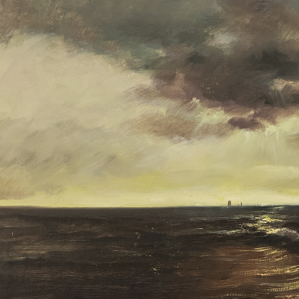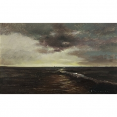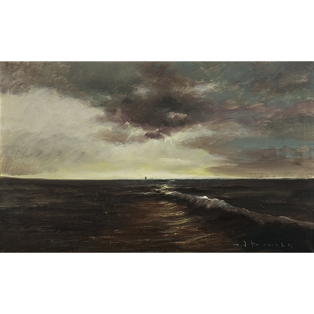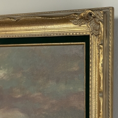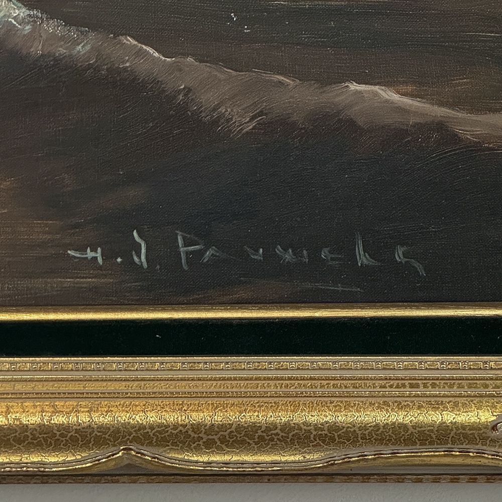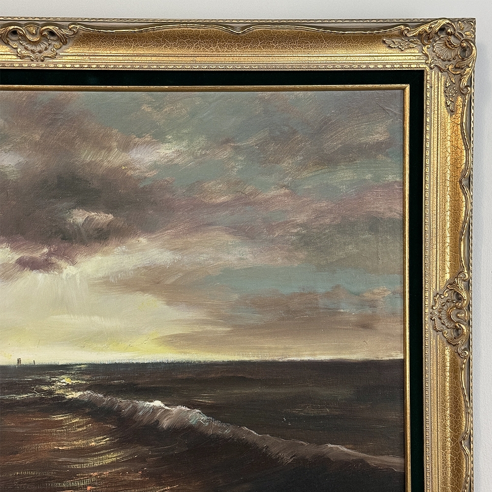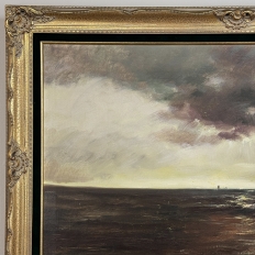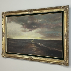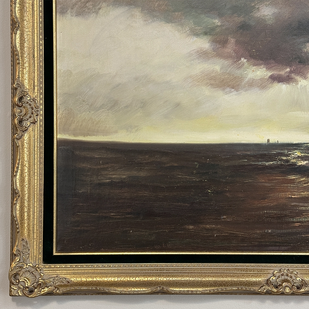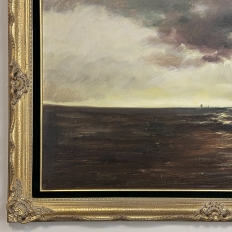 Antique Framed Oil Painting on Canvas by Henri Joseph Pauwels (1903-1983) is an intriguing work by the celebrated and prolific artist who is one of Belgium's favorite sons. The interesting palette appears to depict a sunset at sea with a small yet rogue wave and just the hint of structures in a seaside village in the distance. A foreboding sky hints at a little weather to come. Renowned for his landscapes and depictions of the simple country life, Pauwels experimented with a wide variety of genres, and has successfully attracted our attentions with this extraordinary work which resides in its original frame.