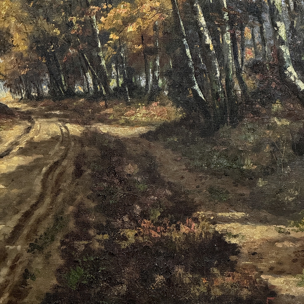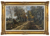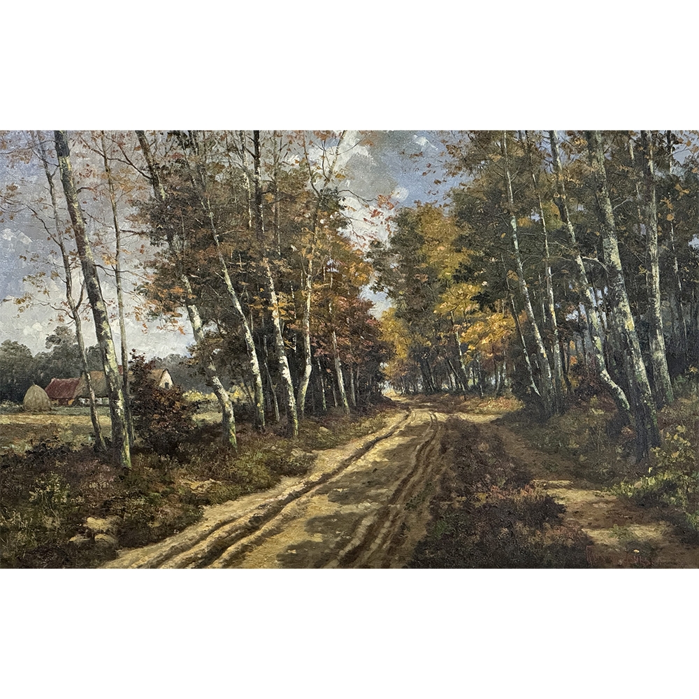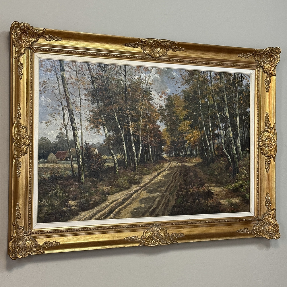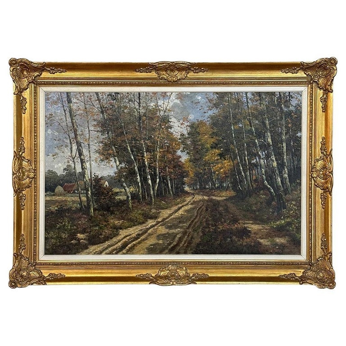 Antique Framed Oil Painting on Canvas by Jan Van Genesen (1887-1945) depicts a scene found throughout Europe's countryside, with a rutted dirt road winding through a forest with occasional clearings for homesteads and small farms. Van Genesen has chosen early fall for his composition, when colors are just emerging in preparation for winter. The positioning of the road as the centerpiece of the work invites the viewer into the scene, beckoning to pass alongside the cottage, perhaps even to stop for a visit. This Dutch-born painter studied in The Hague, at the Academy of Fine Arts in Amsterdam, and in Paris. He also painted seascapes in Blankenberge, where he ran a shop and also exhibited his work. He enjoyed spending part of the year near Spa in the Ardennes, where he produced paintings of springs, streams, and the Fens with undeniable talent. We can only imagine the influence that living through two World Wars had on his work.