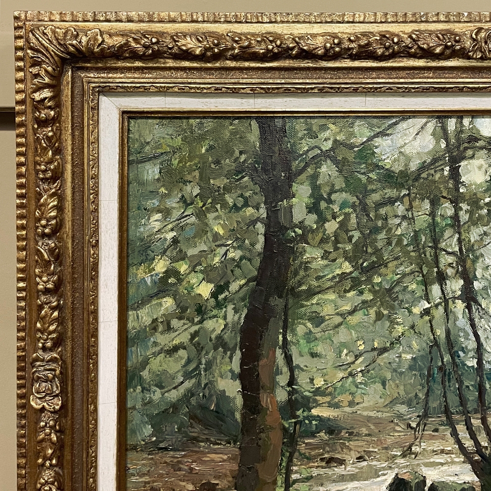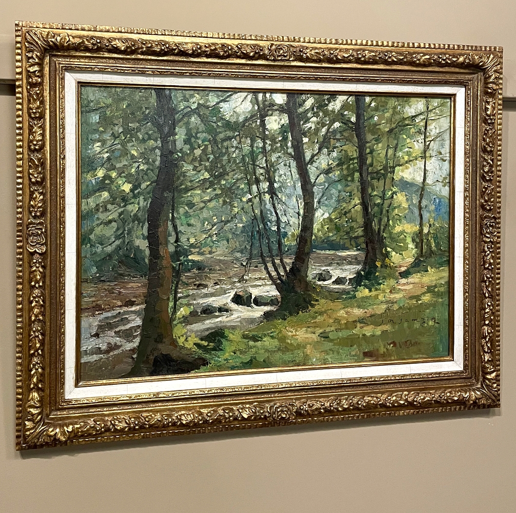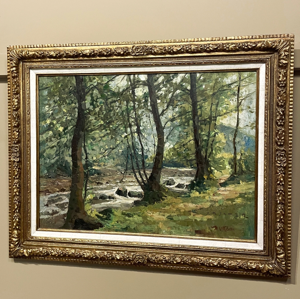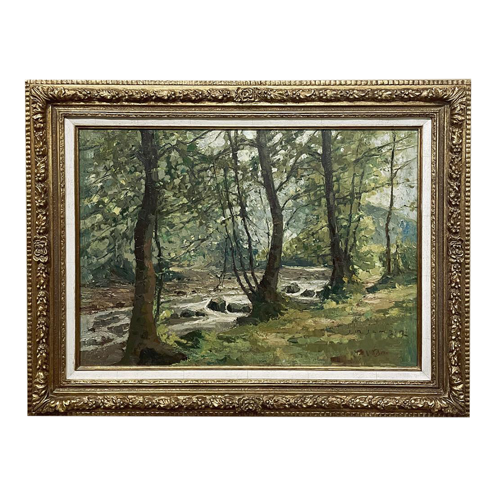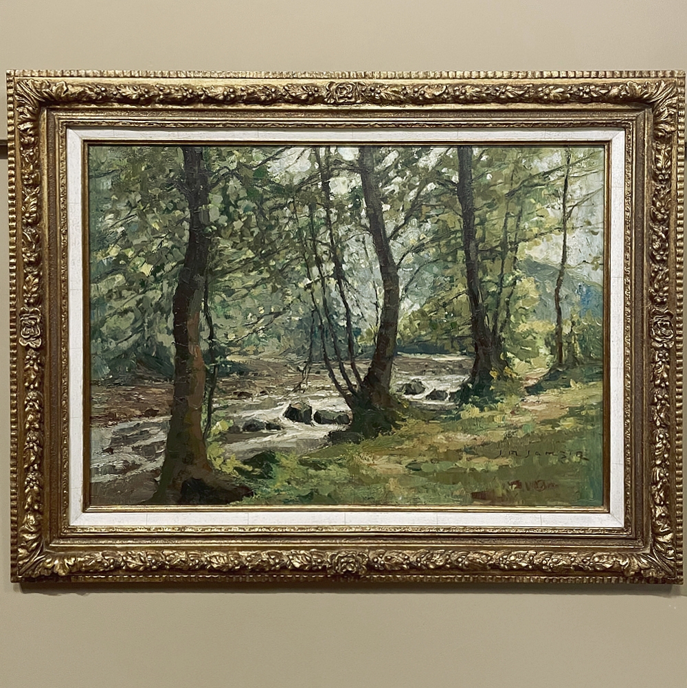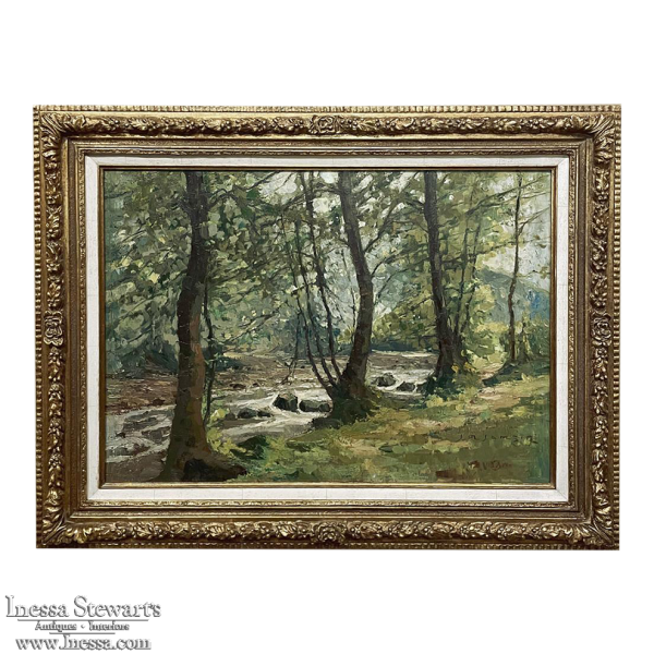 Antique Framed Oil Painting on Canvas by Jean Matthieu Jamsin (1882-1965) is a classic example of the pastoral work wherein the artist has been captivated by a particularly beautiful woodland scene alongside a rock-strewn creek. The naturalistic forms that the trees depict act like markers along the creek, and the artist has chosen to concentrate on the lower forest canopy with only a hint of the sky overhead. One is invited into the composition, where one would find the perfect place for an enjoyable picnic! Signed by the artist.