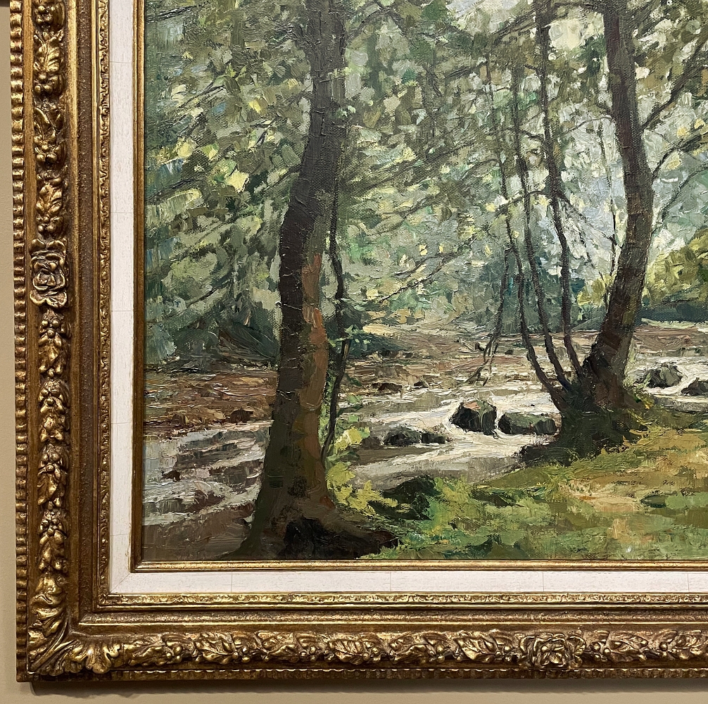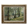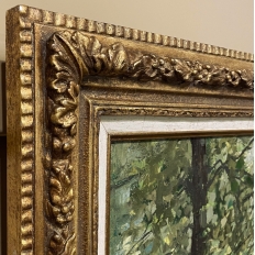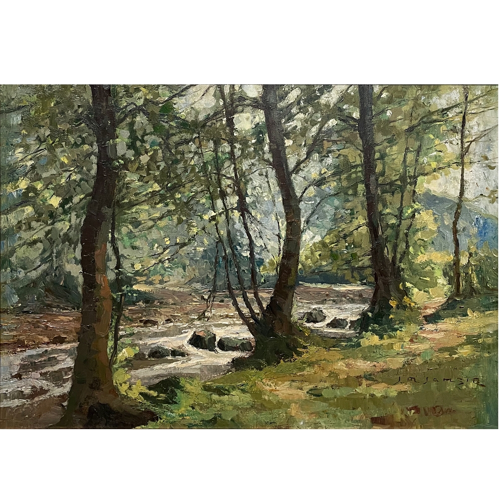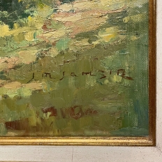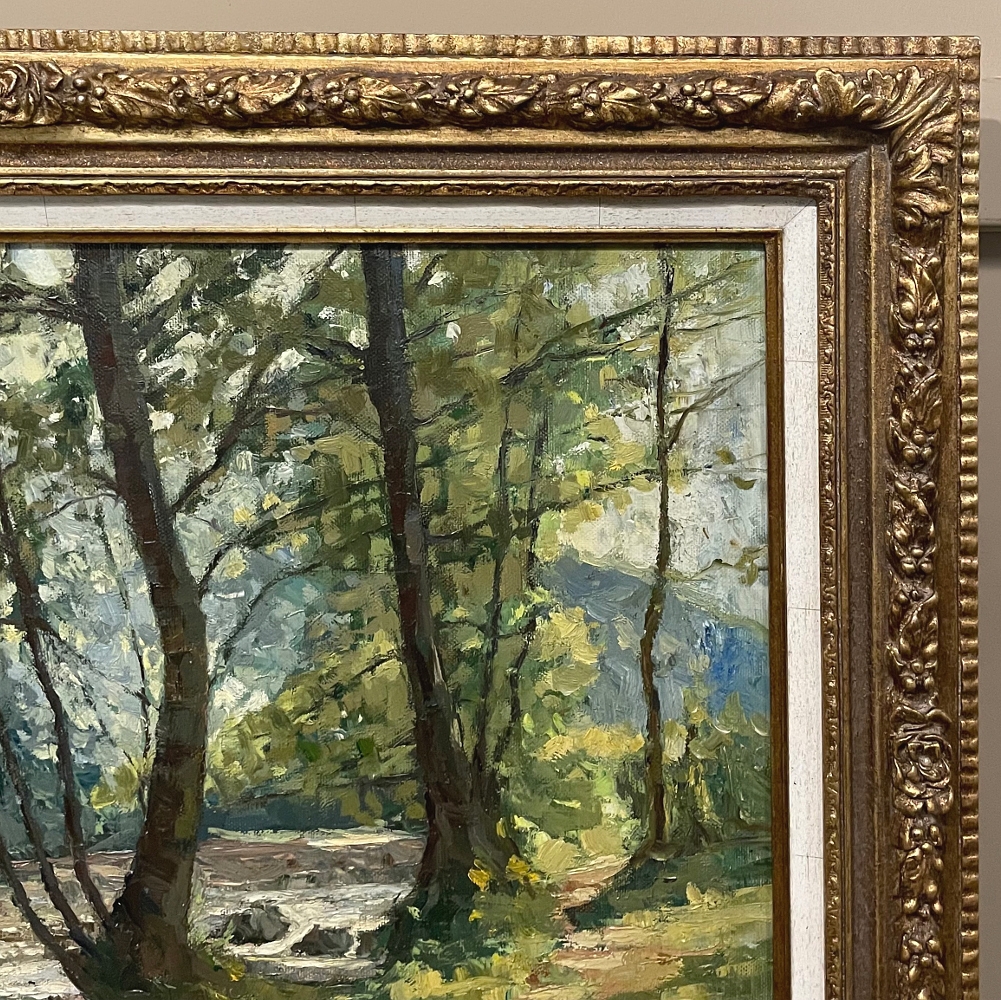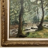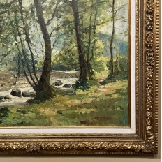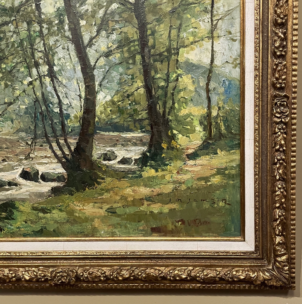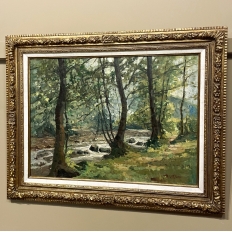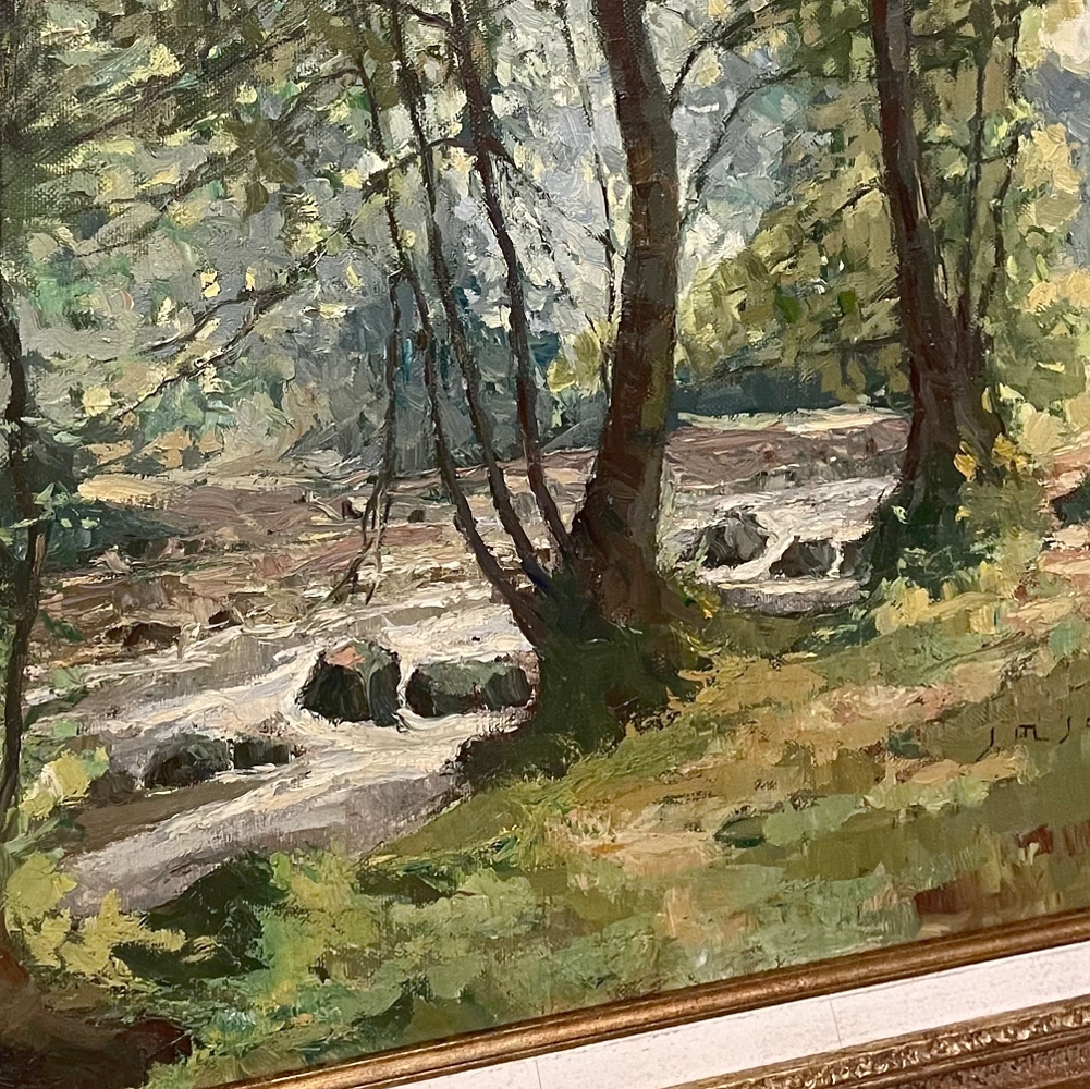 Antique Framed Oil Painting on Canvas by Jean Matthieu Jamsin (1882-1965) is a classic example of the pastoral work wherein the artist has been captivated by a particularly beautiful woodland scene alongside a rock-strewn creek. The naturalistic forms that the trees depict act like markers along the creek, and the artist has chosen to concentrate on the lower forest canopy with only a hint of the sky overhead. One is invited into the composition, where one would find the perfect place for an enjoyable picnic! Signed by the artist.